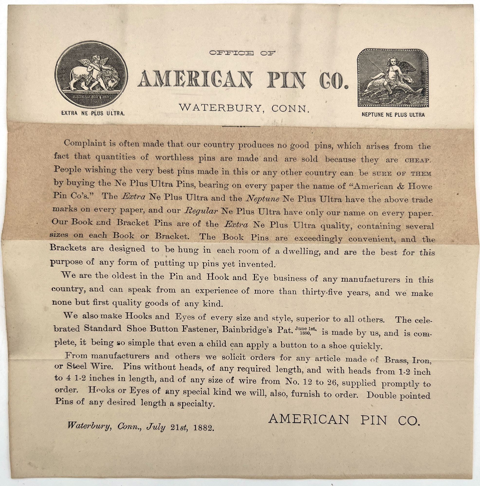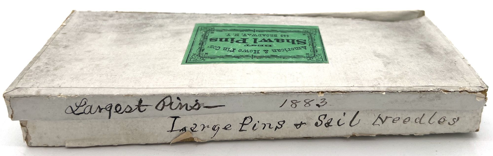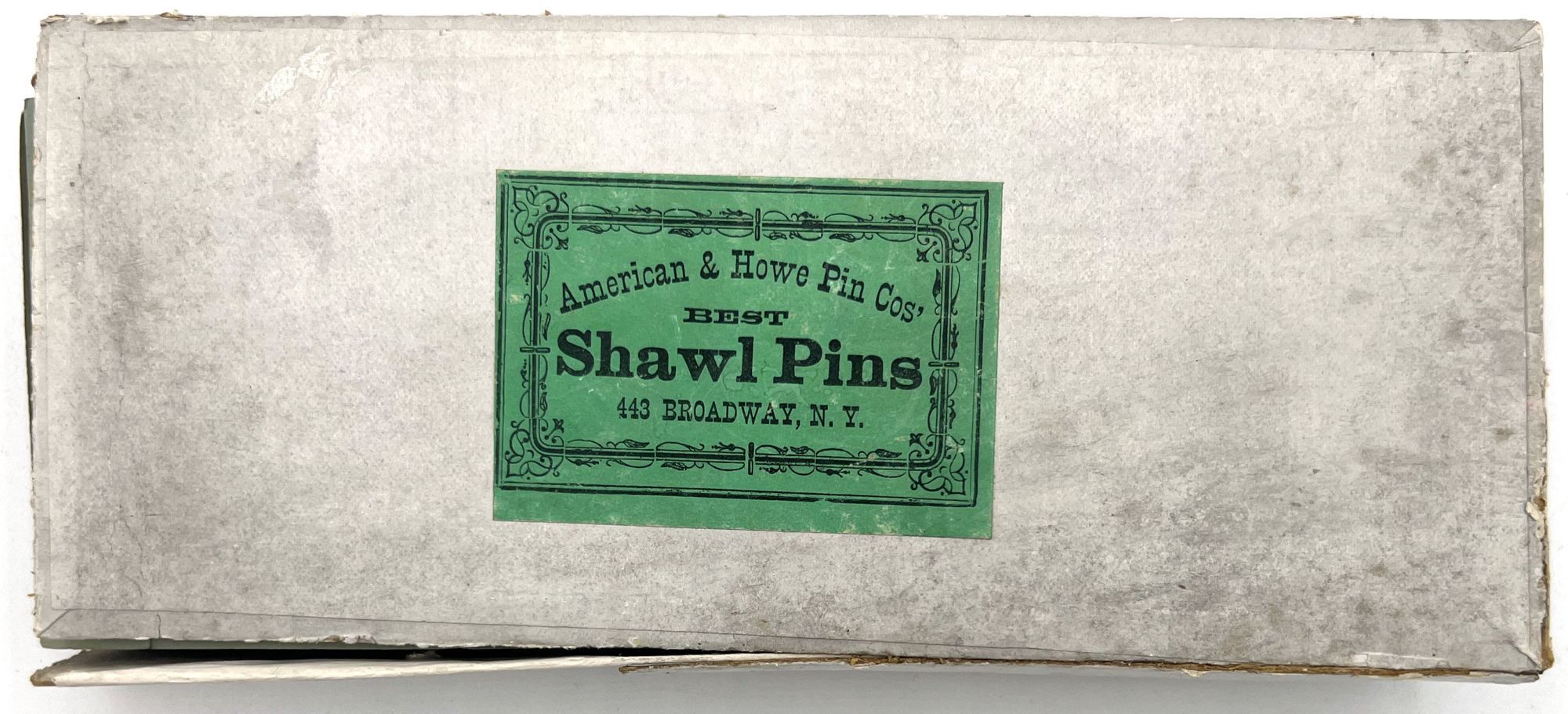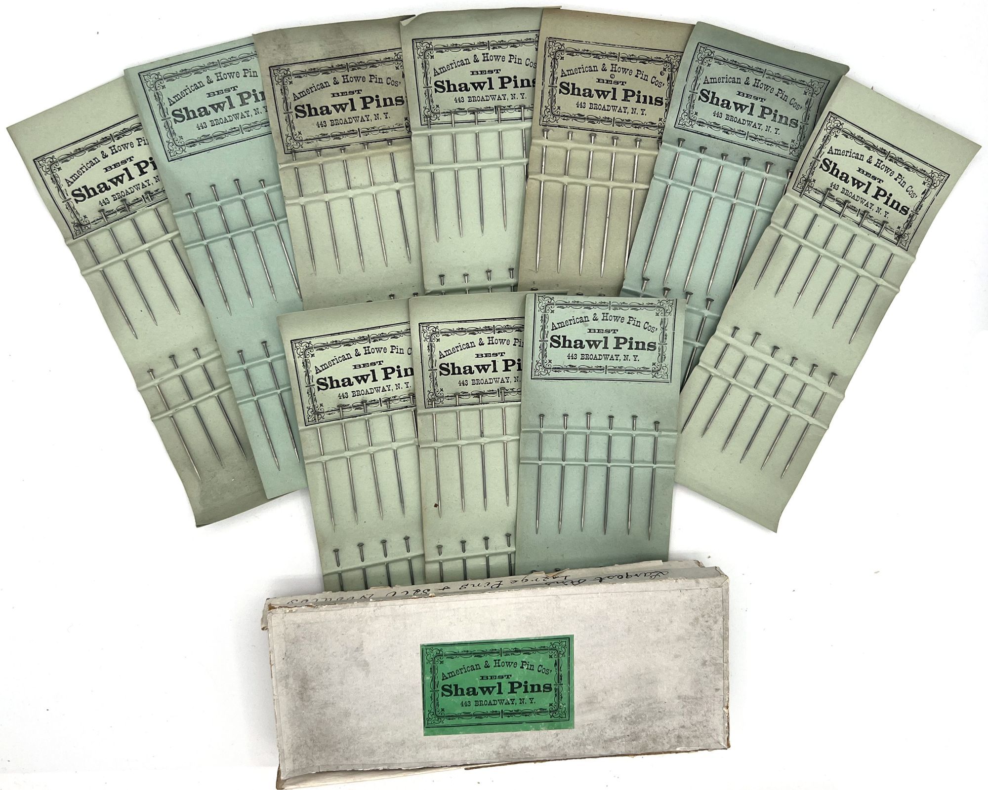 New York, New York: American & Howe Pin Cos, 1882. Good to very good. Pins in excellent condition, one pin lacking. Box worn with some damage and dust soiling, lacking one apron and part of another, one bottom apron lacking, modern repair to corners inside box.. A collection of one hundred nineteen (119) Victorian shawl pins, housed in their original box. Each set of twelve pins is displayed on a sheet of printed paper with brand information at the head, measuring approx. 8.5" by 3". Enclosed is a printed advert from the American Pin Co., emphasizing the company's quality over quantity approach: "Complaint is often made that our country produces no good pins, which arises from the fact that quantities of worthless pins are made and are sold because they are CHEAP. People wishing the very best pins made in this or any other country can be sure of ... the name of 'American & Howe Pin Co.'". Measures 8.75" by 8".
