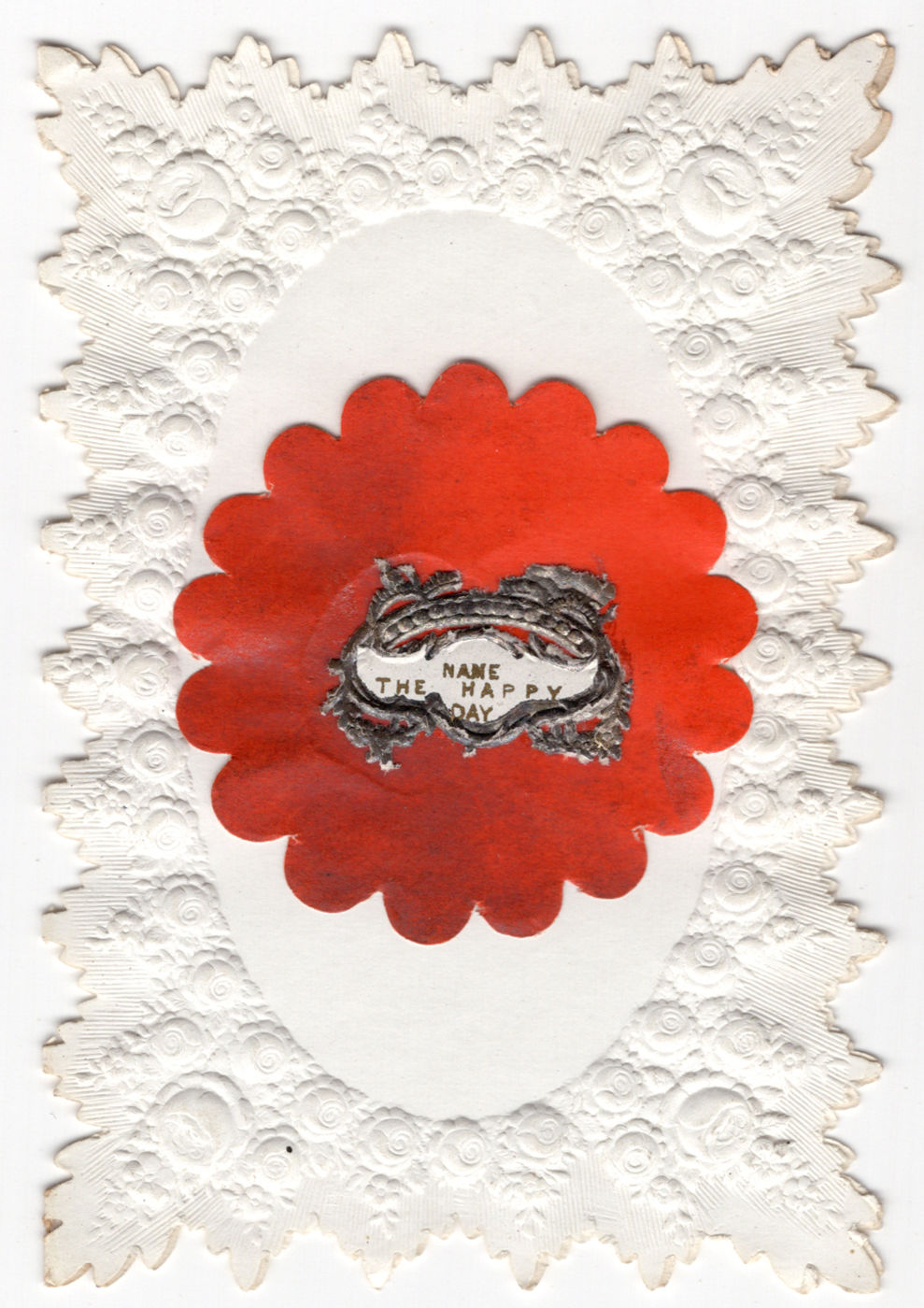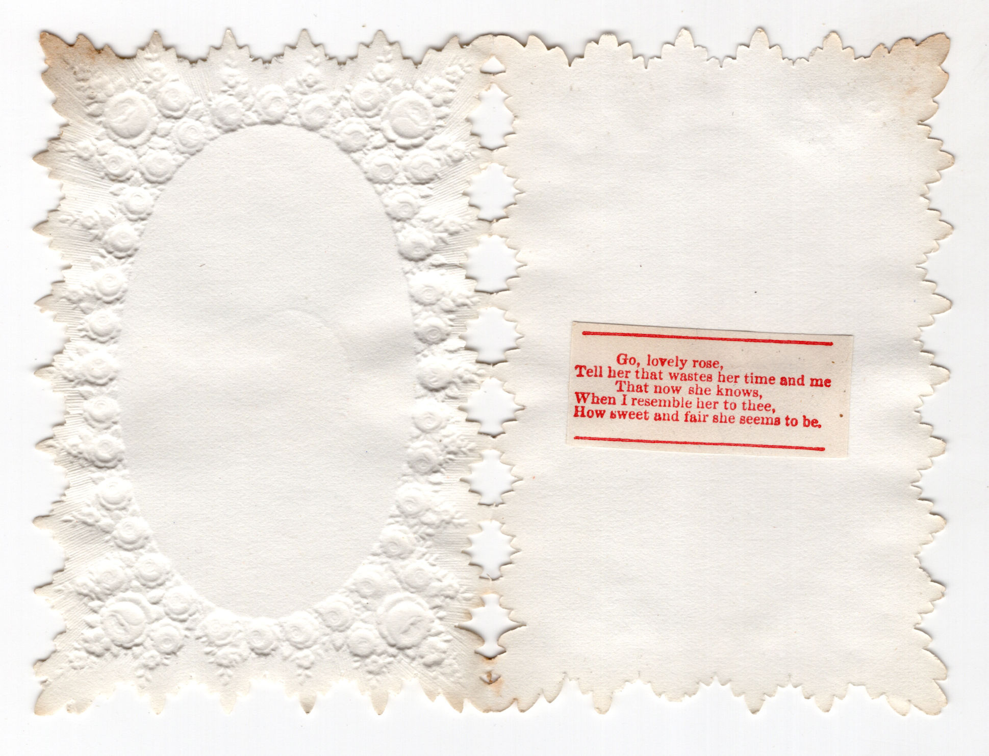 England, 1850. Near-fine. Minor dust soiling, spot to back.. A bright white 16mo valentine, adorned with an orange paper appliqué and silver embossed scrap reading "Name the Happy Day". Inside is a printed slip that reads, "Go, lovely rose, Tell her that wastes her time and me That now she knows, When I resemble her to thee, How sweet and fair she seems to be." Die-cut coated paper bifolium embossed with roses, measuring 3.25" by 2.25
