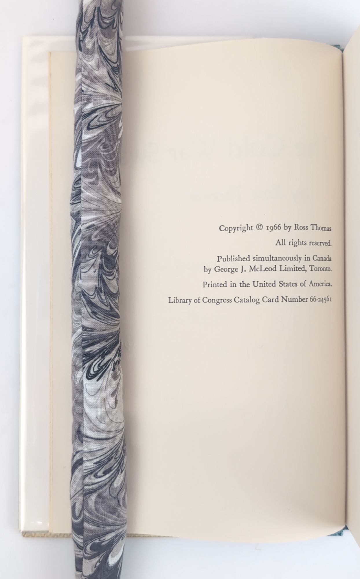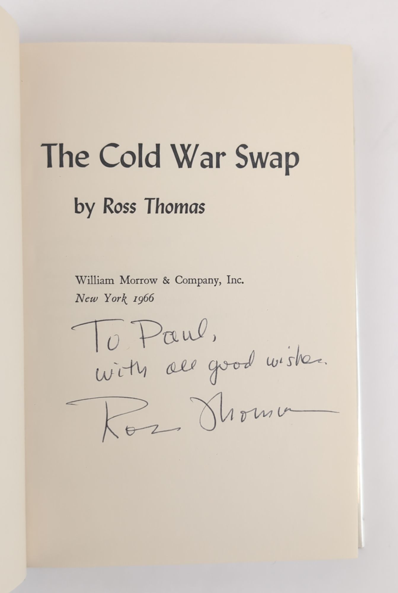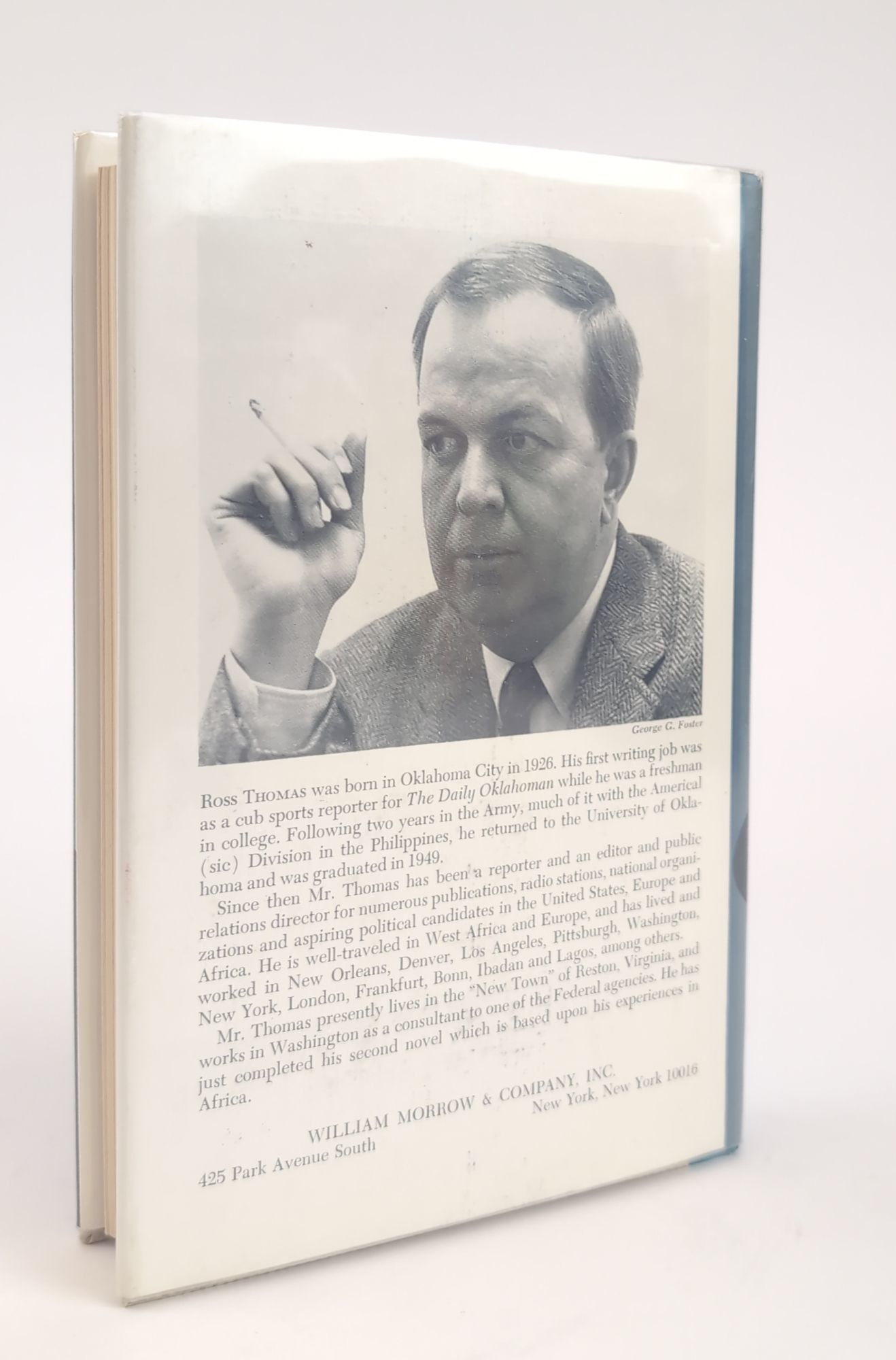 New York: William Morrow & Company, 1966. First Edition, First Printing. Hardcover. Octavo, 222 pages. In Very Good condition with Very Good minus dust jacket. Blue spine with yellow and white text. Dust jacket is protected with a mylar covering, chipping to head of spine, and mild edge and shelf wear. Price uncut '$3.95'. Textblock has small brown stains on fore edge. First state dust jacket with no reviews. Inscribed on title page by Ross Thomas. JW consignment. Shelved case 7. 1381446. Shelved Dupont Bookstore.
