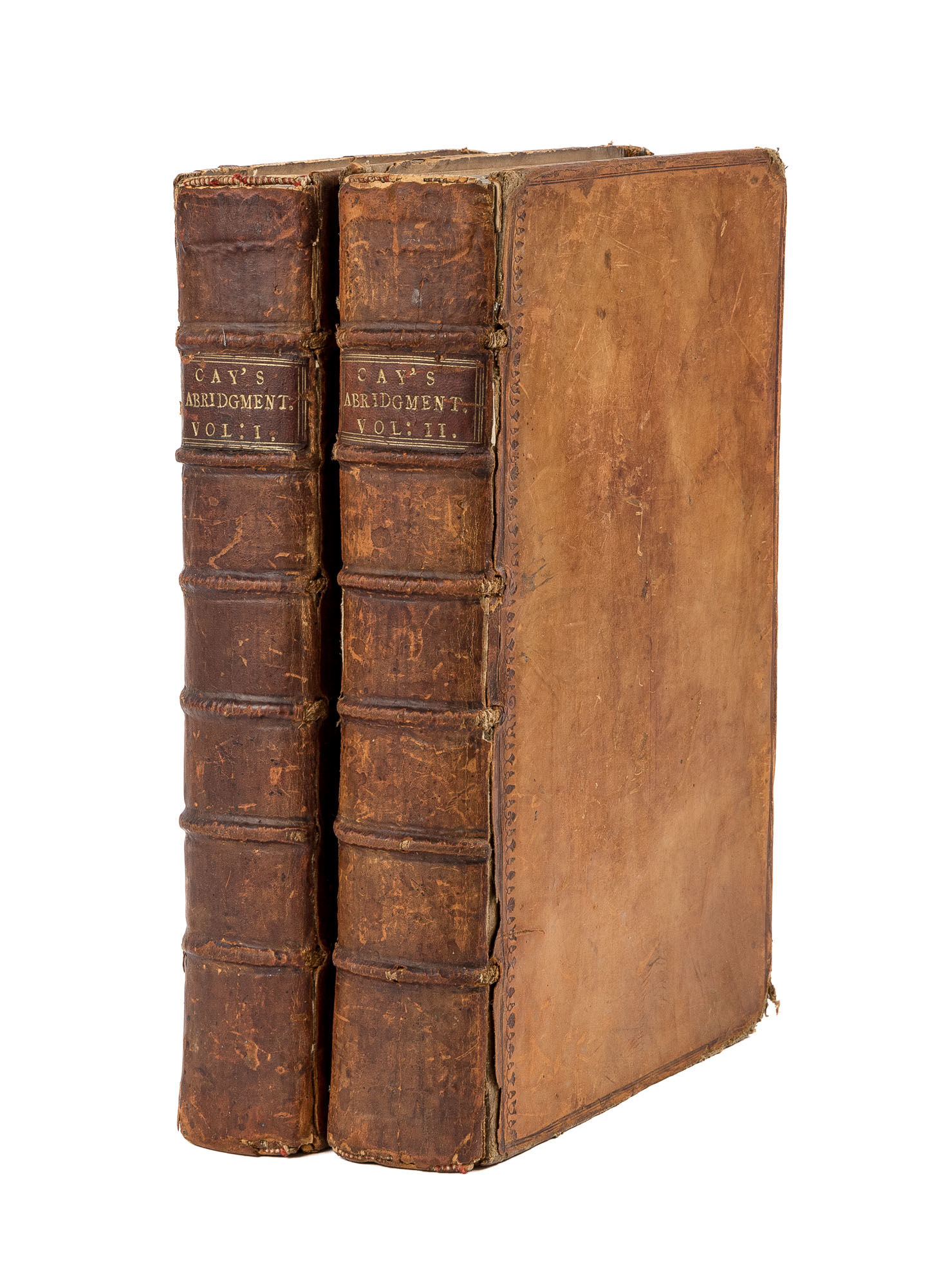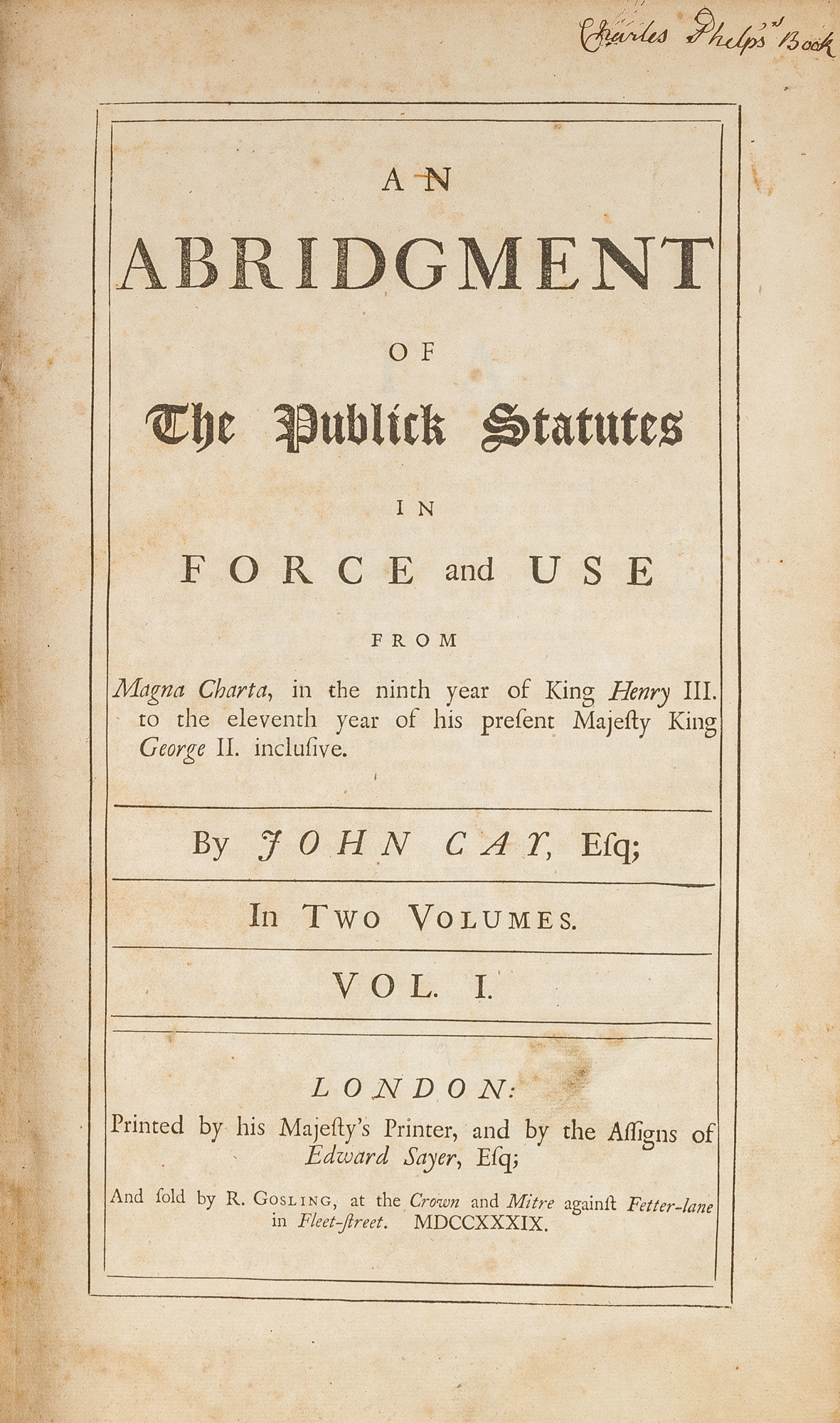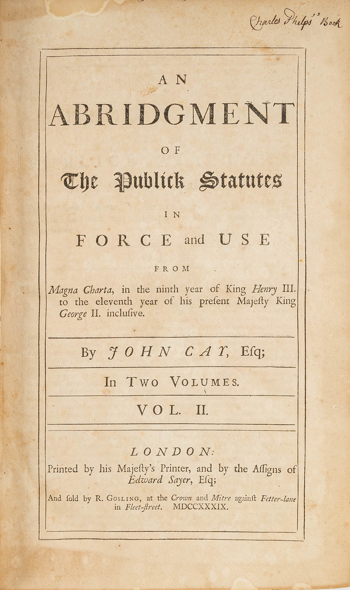 1739. London, 1739. 2 vols.. London, 1739. 2 vols. The Eighteenth-Century Successor to Rastell's Statutes Cay, John [1700-1757]. An Abridgment of the Publick Statutes in Force and Use from Magna Charta, In the Ninth Year of King Henry III. To the Eleventh Year of His Present Majesty King George II. Inclusive. London: Printed by His Majesty's Printer, 1739. Two volumes. [1464] pp. Folio (13" x 8"). Contemporary calf, blind rules to boards, blind fillets along joints, raised bands and lettering pieces to spines, gilt tooling to board edges. Light rubbing and scuffing to boards, heavier rubbing to extremities with wear to spine ends and corners, boards beginning to separate but secure, later library bookplate (of Brattleboro Public Library) and book label, "James H. Phelps, West Townsend, VT," to front pastedowns. Moderate toning to interiors, faint dampspotting in places, faint staining to margins of a few leaves in Volume I, offsetting to margins of endleaves, brief early annotations to rear pastedowns, "Charles Phelps's Book" to heads of title pages. $350. * First edition. "The need for an abridgment of the statutes more adequate than anything that had appeared since the last addition of Rastell's Collection probably gave rise to this compilation... Cay's Abridgment maintained its popularity throughout the [18th] century..." (Cowley). Later editions appeared in 1758, 1762 and 1766. The Phelps's were a notable family in the area around Marlboro and Brattleboro, Vermont. James H. Phelps [1817-1893], a former owner of our copy, was a lawyer, county judge and Vermont state representative and senator. This book may have belonged to his father Charles Phelps [1781-1854], a lawyer, probate judge and member of the Vermont Council, or his great-uncle Charles Phelps [1743-1814], a lawyer and an active partisan in the disputes over the New Hampshire Grants and Vermont's boundaries. Bisbee and Wiese, Charles Phelps (1717-1789) Papers, 1764-1928 (Bulk: 1764-1889) (accessed online). Cowley, A Bibliography of Abridgments, Digests, Dictionaries and Indexes of English Law to the Year 1800 xxxviii, 231. English Short-Title Catalogue T150447.