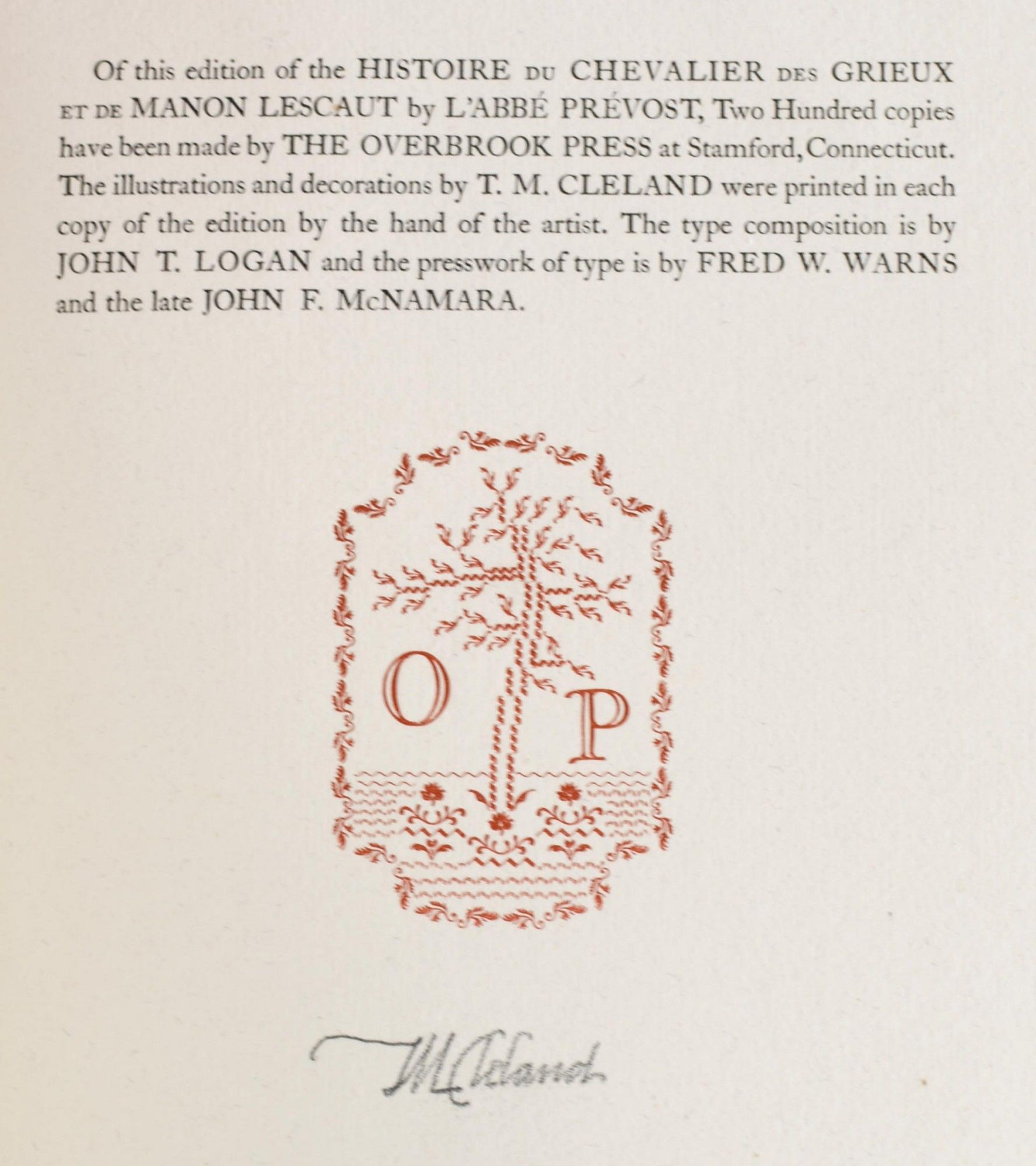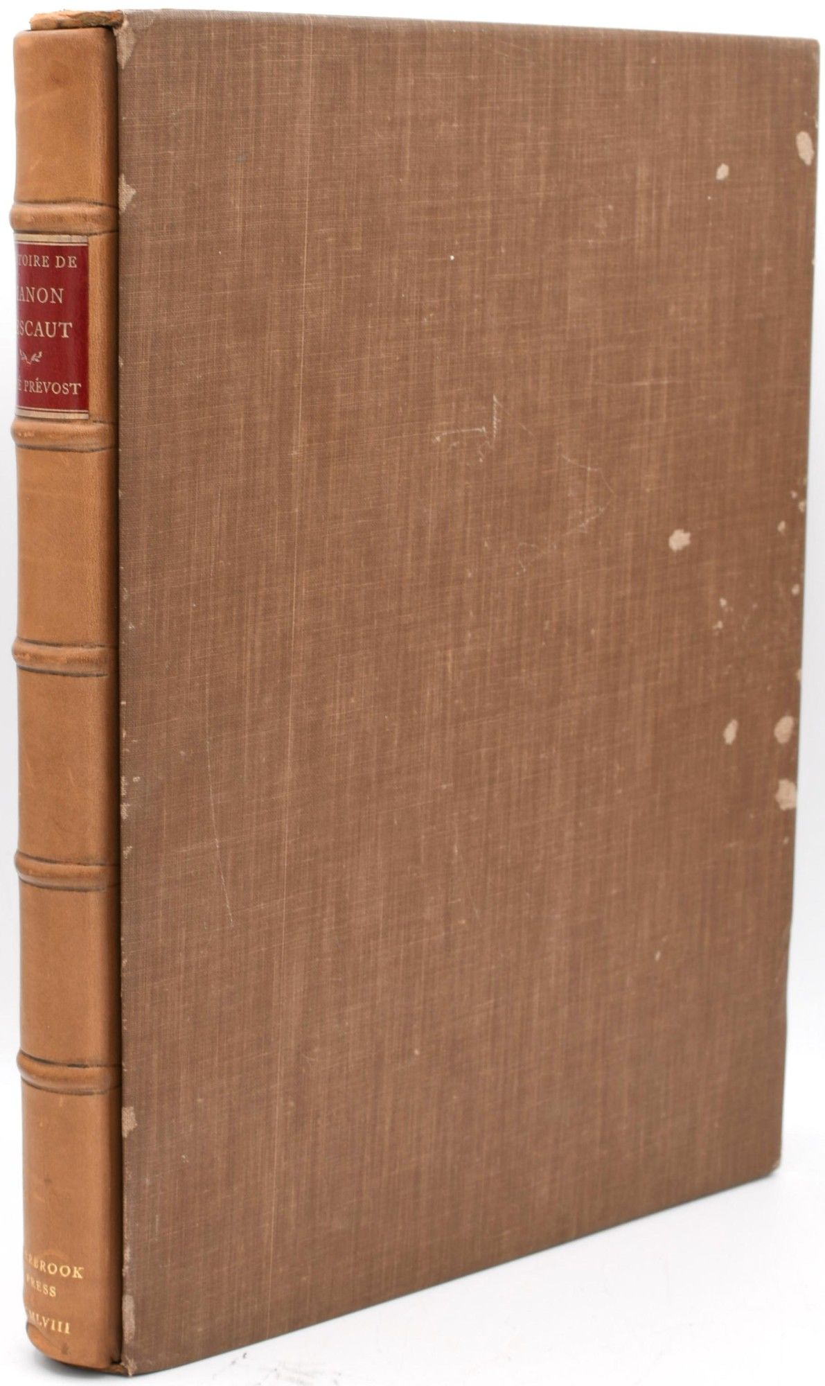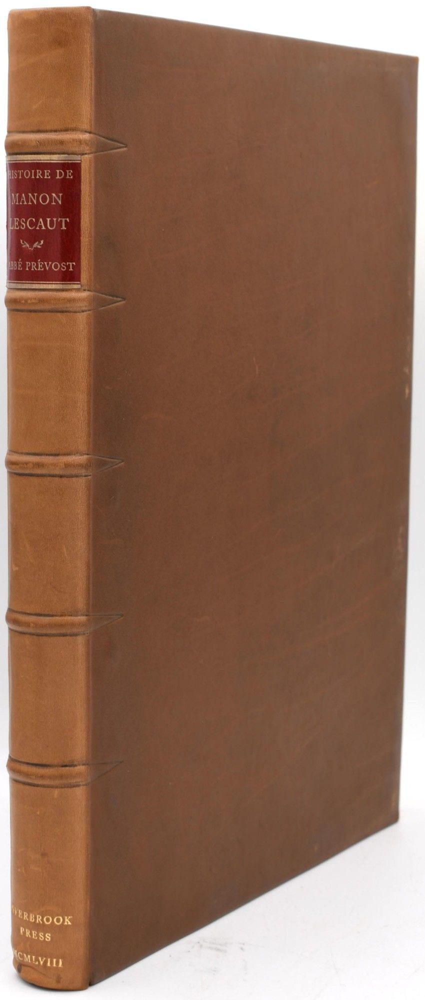 Stamford, Connecticut: The Overbrook Press, 1958. Limited Edition. Full Leather. Very Good binding. Quarto; in full brown calf with label stamped in gilt to the spine; 207 pages; housed in the published brown cloth covered slipcase with ends tipped in calf; one of 200 copies; there are no ownership marks in the book; prospectus is laid in; the spine is lightly sunned and there is small abrasion to the edge of the slipcase.~~From Cave: "[T]he name with which some of the best of the Overbrook books were most closely associated was that of the artist T. M. Cleland. ... In the 1950s he was responsible for the production of hte press's most ambitious book, Prevost's Manon Lescaut. ... As an example of the luxurious book at its most magnificent, and at its furthest remove from commercial printing, the Overbrook Manon Lescaut was unequaled among postwar private press books and had few peers among the books of earlier presses." ~ (Cave 210-211.). Very Good binding.