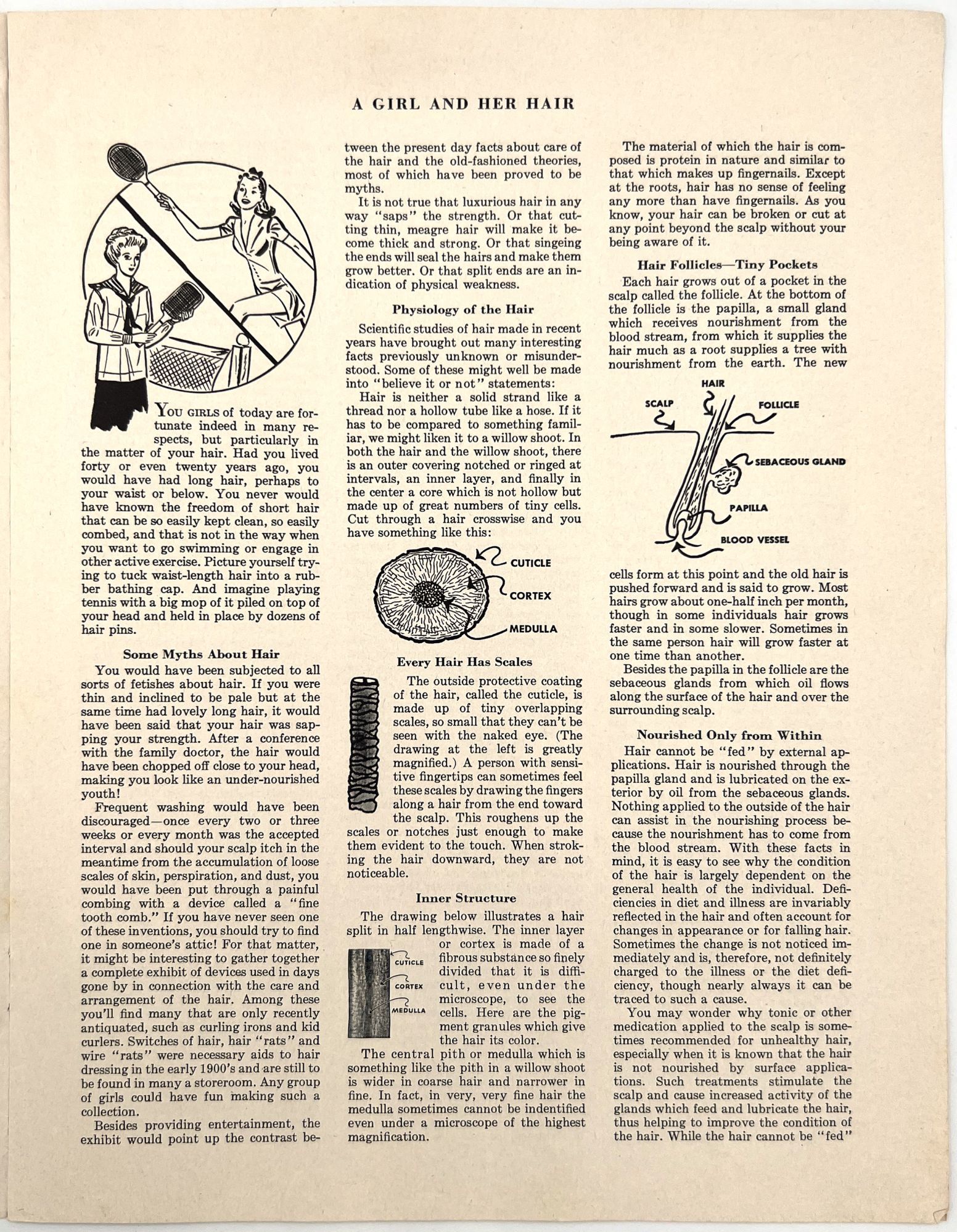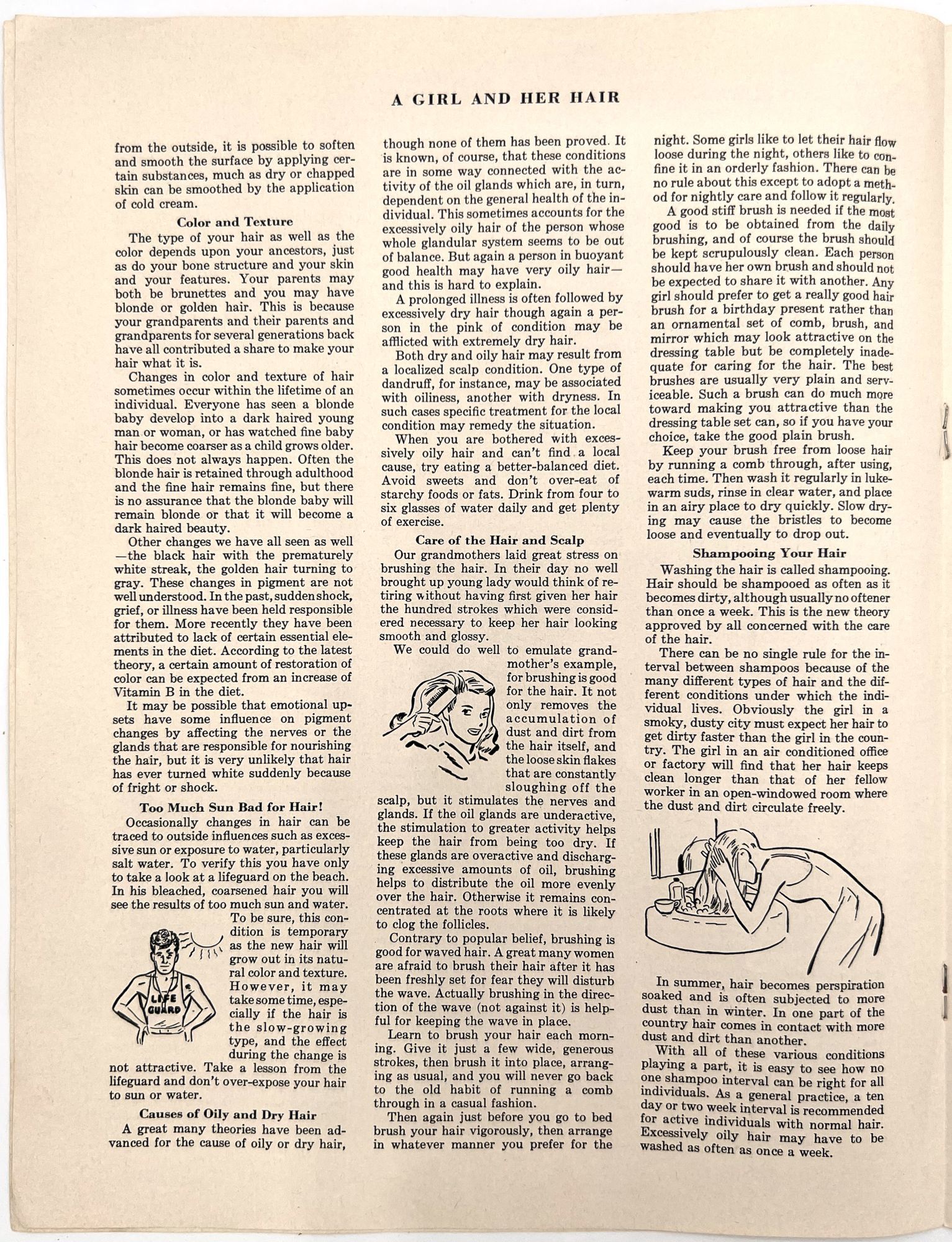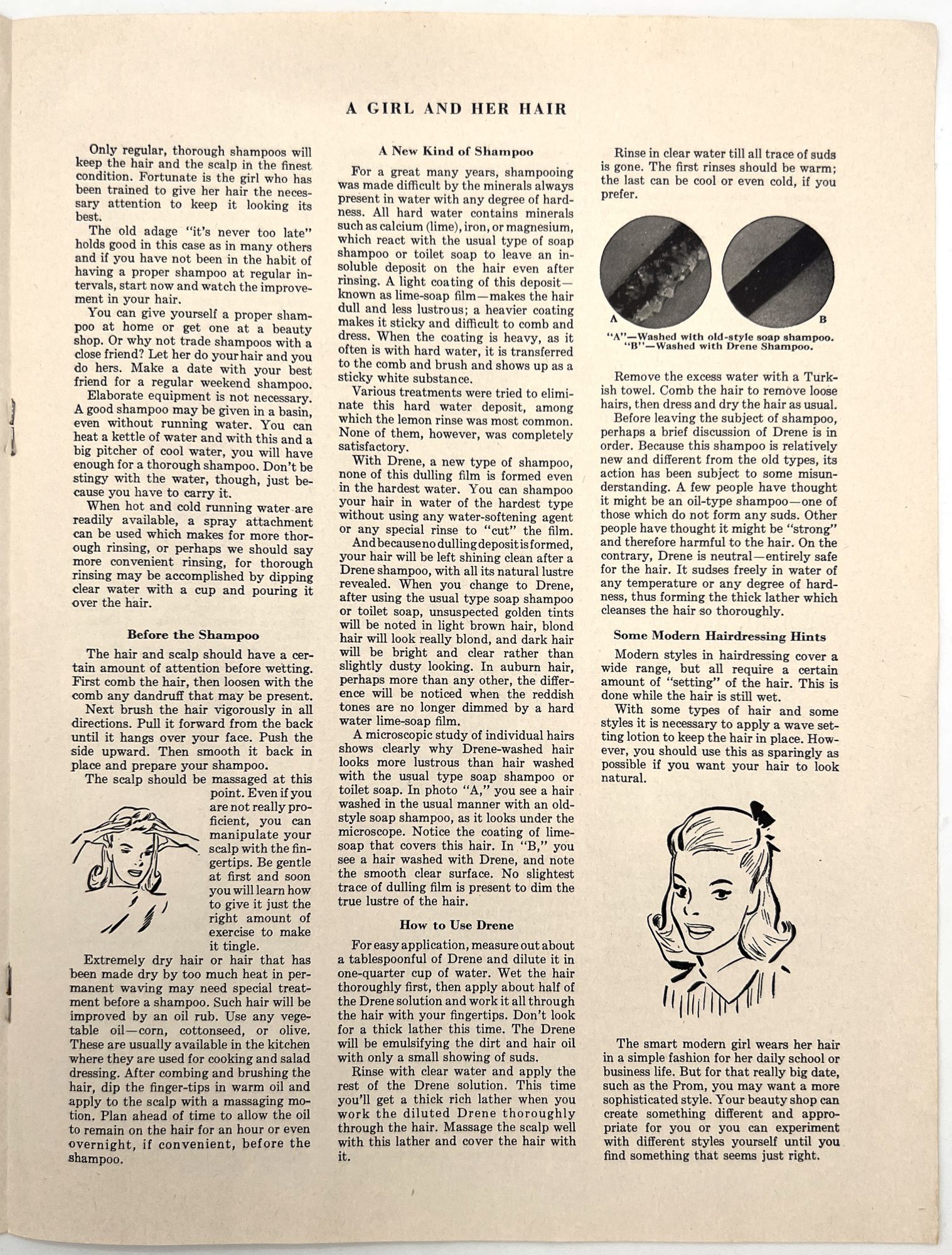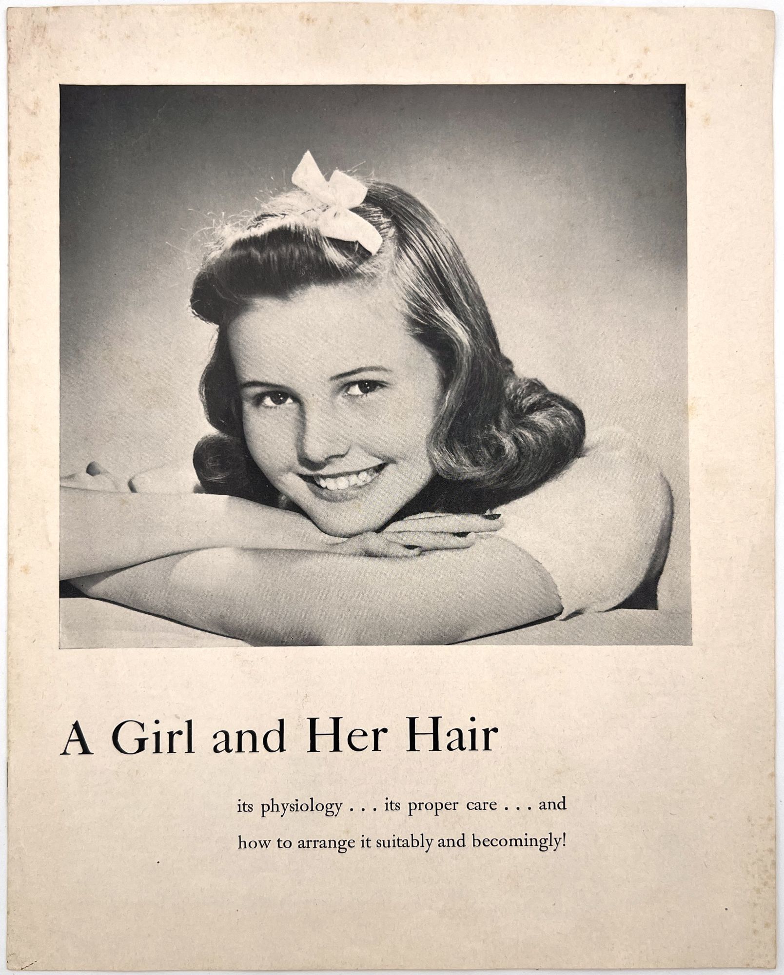 Cincinnati, Ohio: Procter & Gamble, 1945. Very good to near-fine. A little spotting/light dust soiling.. A guide for teen girls on the proper care of hair and "how to arrange it suitably and becomingly!", advertising Drene brand shampoo. Includes information about the physiology of hair, proper care and washing, and instructions for different kinds of styling including pigtails, side curls, pompadour, etc.
