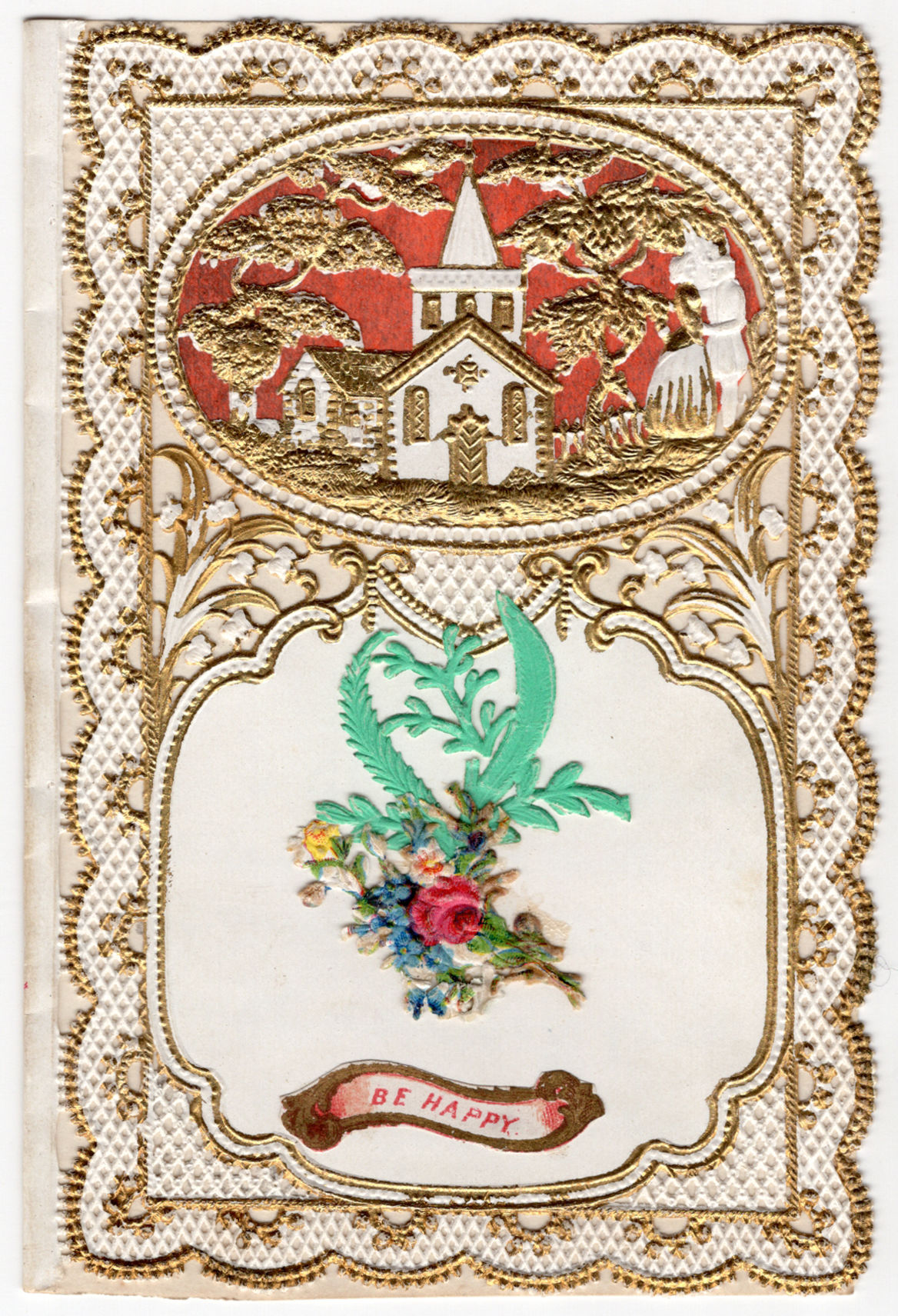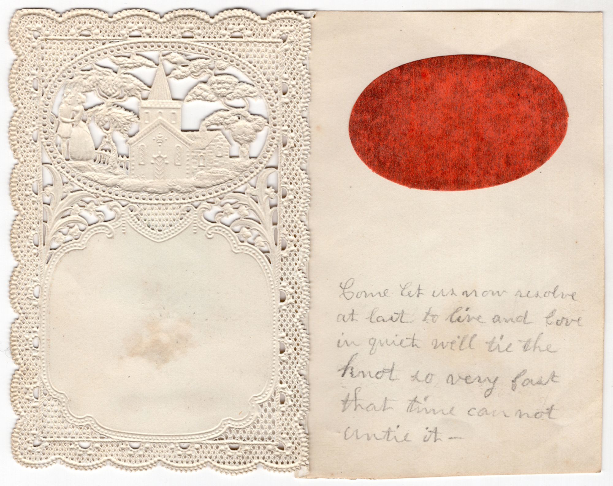 England, 1860. Very good to near-fine. One small part of floral scrap broken off. Minor dust soiling to orange paper on second leaf.. A bright and finely produced 16mo valentine, made from lace paper, and embossed victorian scrap. A piece of orange paper peeks through the spaces in the lace paper, which includes a pictorial scene: a pastoral church, with couple strolling nearby. The lace paper has been heightened with gilt, and is still very bright. Inside, the sender has written sweet lines of verse in pencil: "Come let us now resolve at last to live and love in quiet will tie the knot so very fast that time cannot untie it". Measures approx. 4" by 2.75