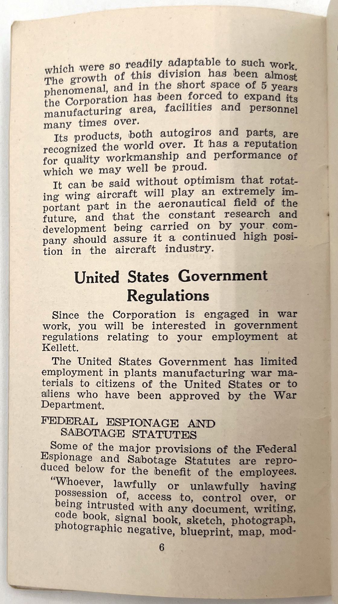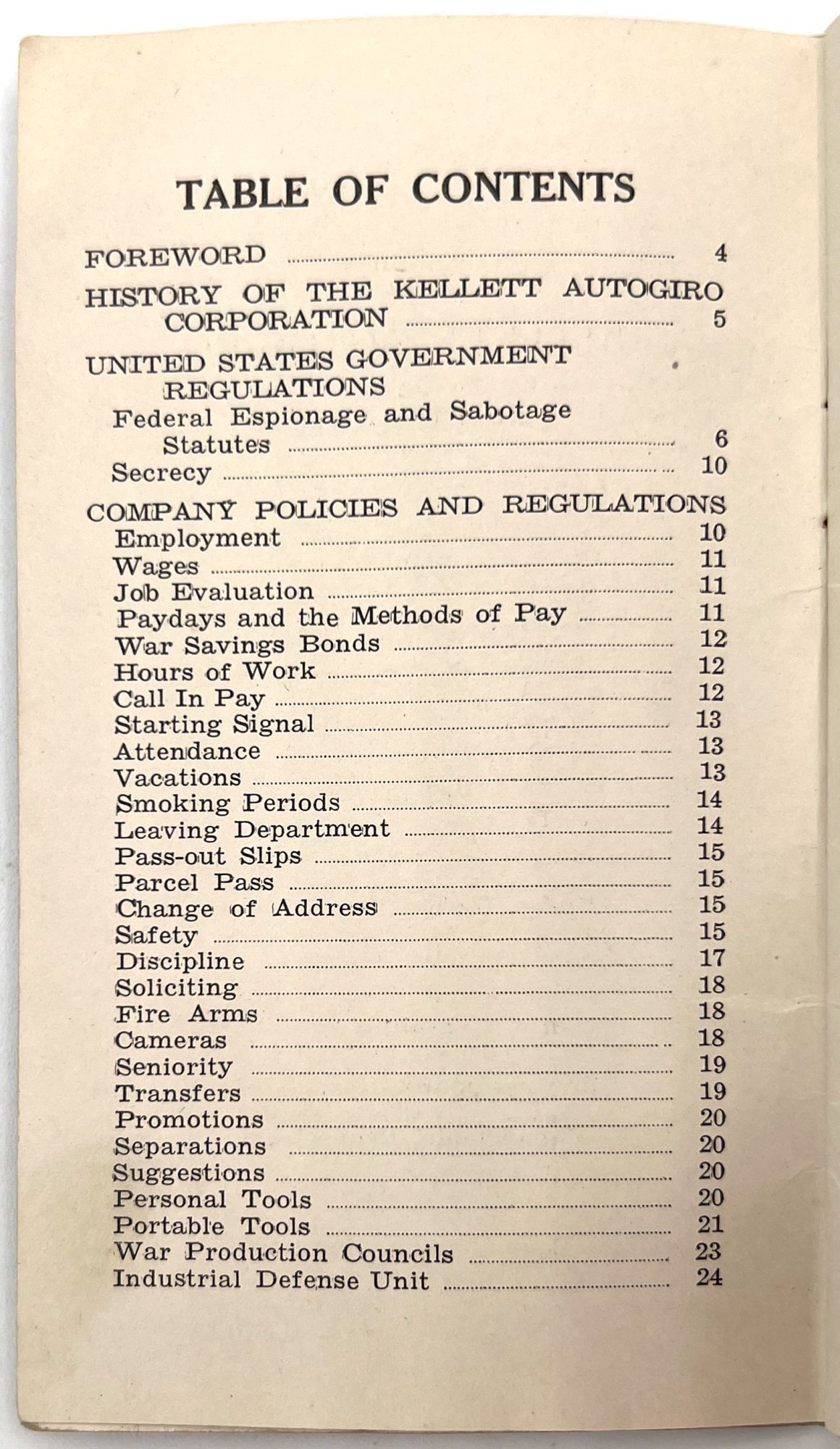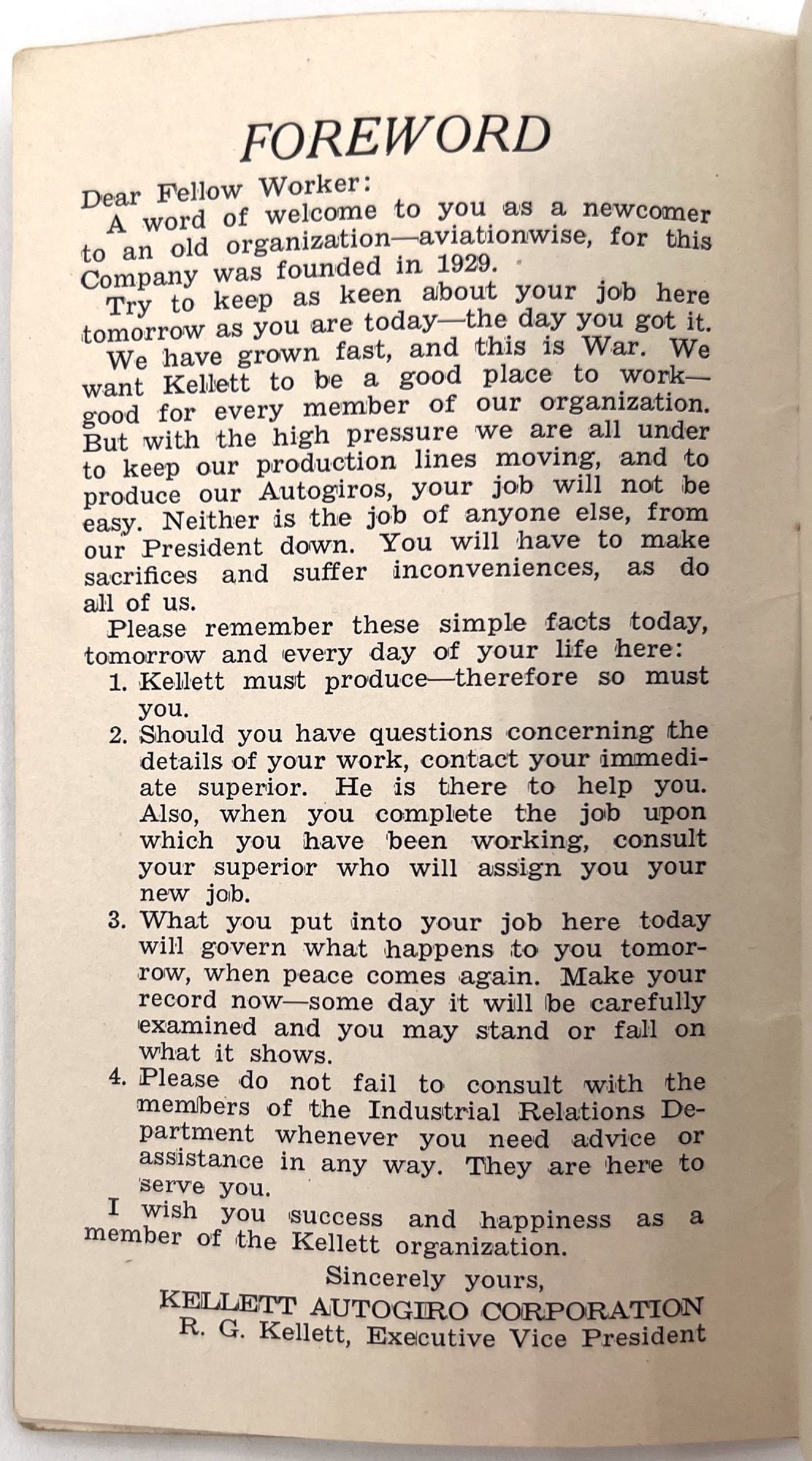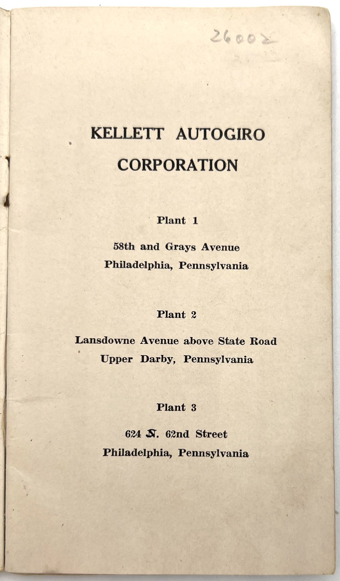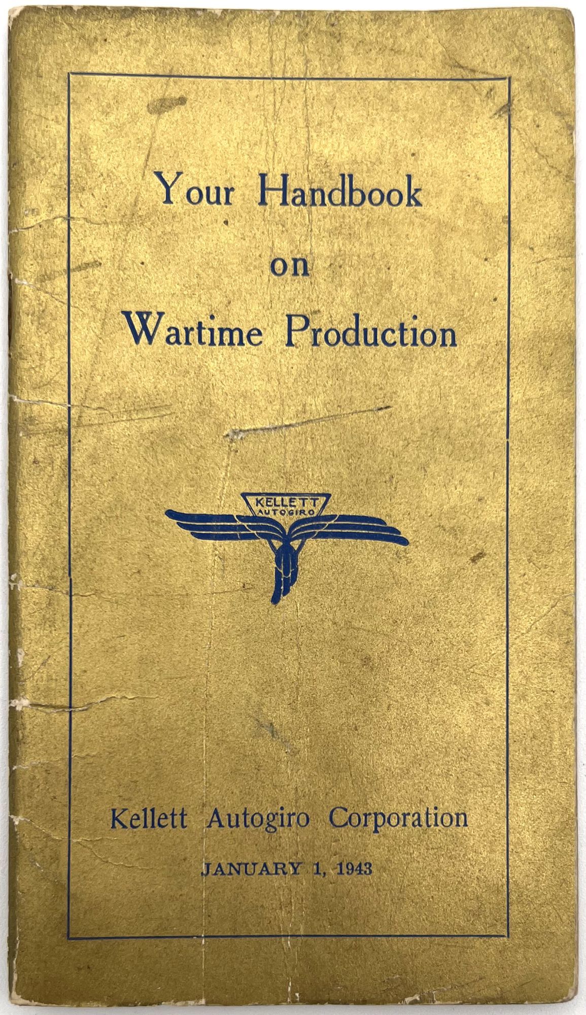 Philadelphia, Pennsylvania: Kellett Autogiro Corporation, 1943. Very good. Wear to wrappers. A WWII-era booklet urging workers in the Kellett Autogiro Corporation to increase production and work as a team to support the war effort. Kellett was an aircraft manufacturer founded in 1929 that designed and produced helicopters for the American military. Note the sense of urgency in the booklet's rhetoric, as well as mentions of things like wartime rubber and gas rationing on the homefront (in this case, since the workers were producing things for the military, rations were curtailed) and the brief section on U.S. Government federal espionage and secrecy regulations. Also includes information on safety training, workflow, worker's comp, Army-Navy standards, and standard rules and measurements for production. A valuable window into the sense of duty and responsibility workers at home must have felt for the war effort abroad. Single vol. (6" by 3.5"), pp. 39, [1], stapled in original gold wrps printed in blue. "Kellett must produce-- therefore so must you.