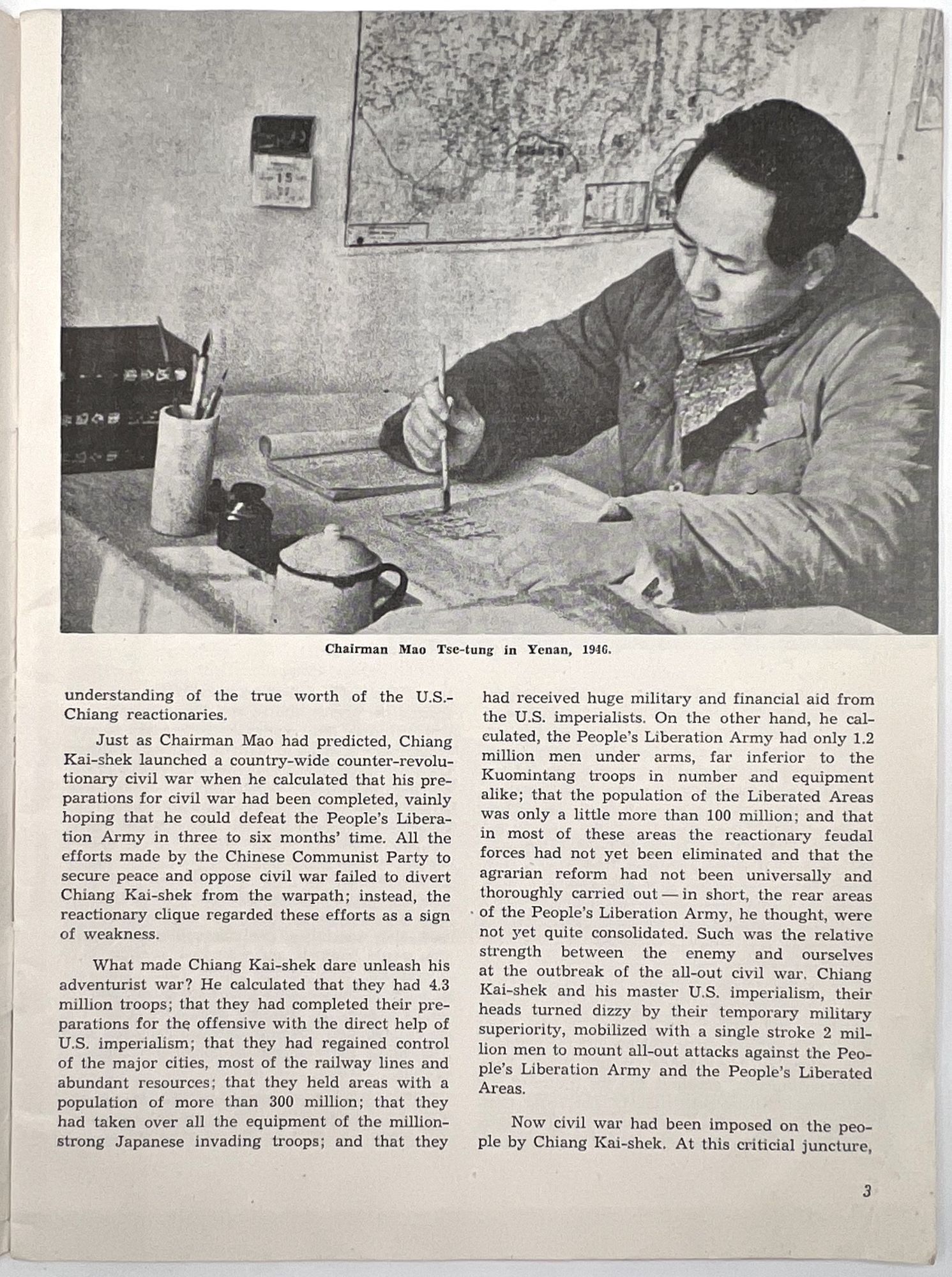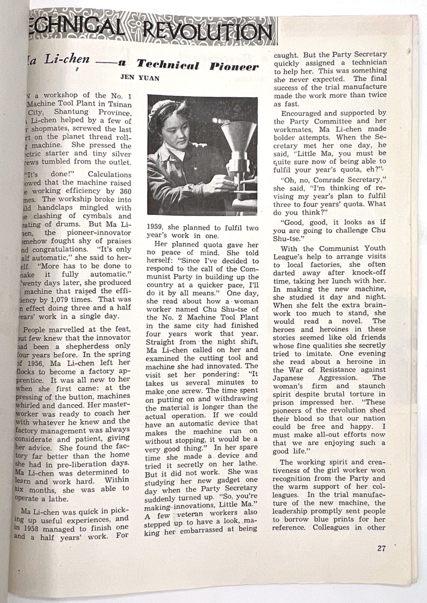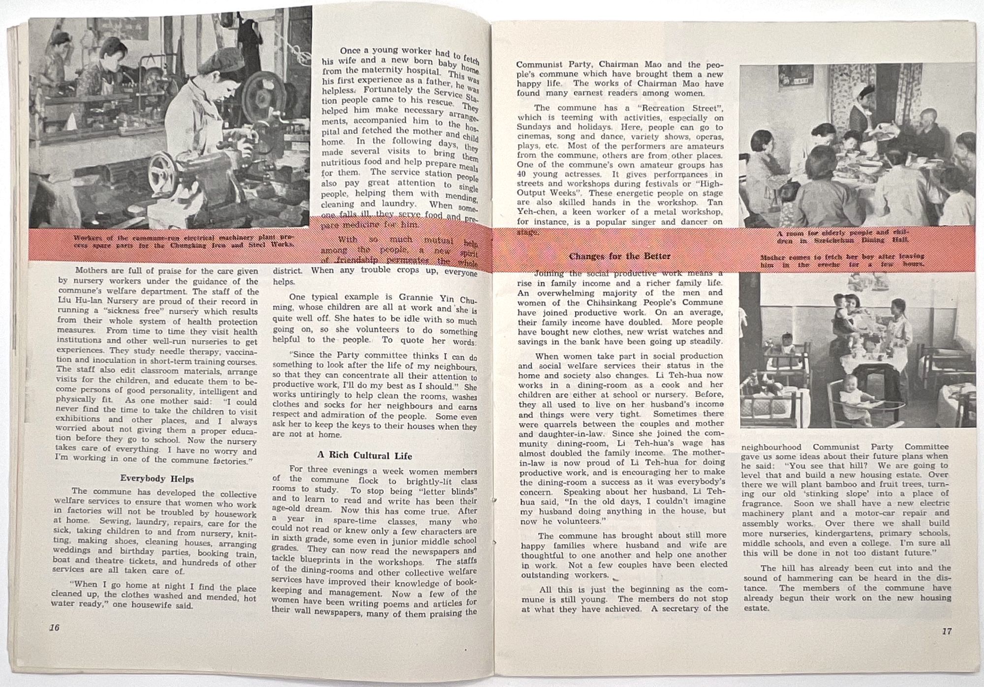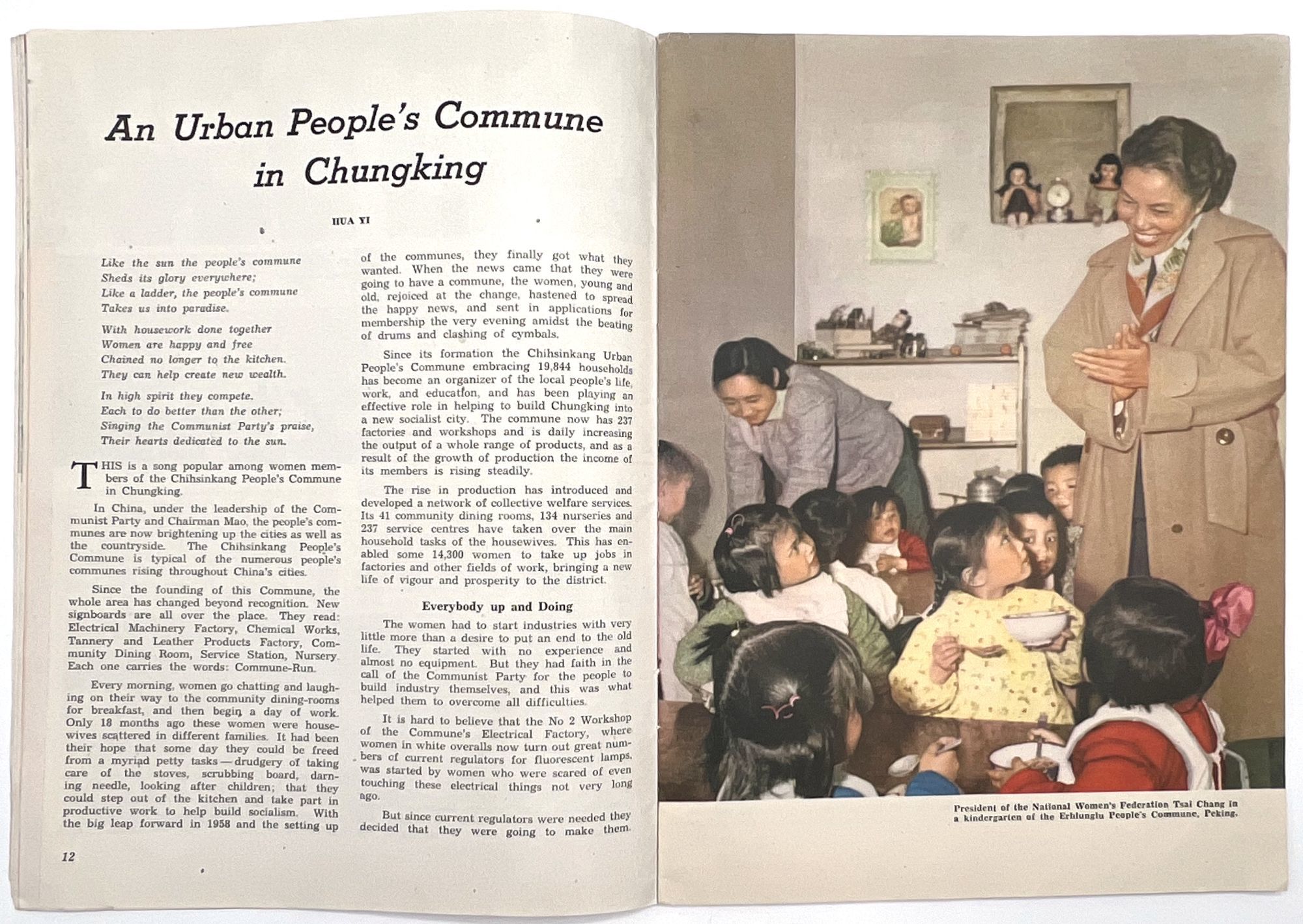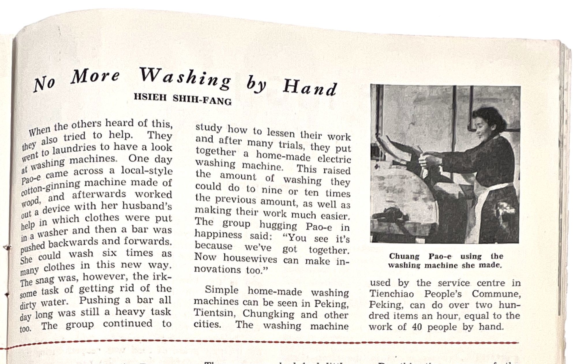 Peking, China: National Federation of the of the People's Republic of China, 1960. Very good. Minor dust soiling, a couple nicks to extremities.. A scarce 1960 issue of the English-language journal, "Women of China", published bimonthly in Peking by the National Federation of the of the People's Republic of China. The aim of this publication was to promote women's equality and empowerment in the Communist Party. This issue features articles showing women as partners and pioneers in the Chinese revolution, such as one article about a Technical Pioneer named Ma Li-chen who innovated a machine that "raised the efficiency" of a factory by "1,079 times" (p.27). Smiling women from both urban and rural settings are shown proudly benefitting from the fruits of their labor throughout the issue. The sentiment of this publication can be summarized by a spoken motto on page 30: "The Party is our home, / The Commune is our mother; / We rely on the Commune. / Even if heaven should collapse and the earth cave in, / We will have no fear". Single vol. (10" by 7.5"), pp. 48, illus., stapled in original color-illustrated wrps. For a more nuanced discussion of this journal and its complicated relationship to feminism in the Mao era, see Zheng, Wang. "Creating a Socialist Feminist Cultural Front: ‘Women of China' (1949-1966)." The China Quarterly, no. 204, 2010, pp. 827-49. JSTOR, http://www.jstor.org/stable/27917835. Note the cover illustration, which shows two men and two women proudly carrying a bundle of wheat and basket of cotton.