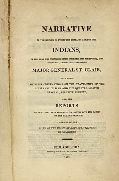 Philadelphia: Jane Aitken, 1812. First Edition. Hard Cover. Fair/No Jacket. 0x0x0. First edition. Amateur repair - new cloth laid over most of boards, free endpapers affixed to paste-downs. Edges of boards and a few pages rubbed. A good candidate for restoration - the original cloth spine appears intact beneath the repair, the boards are original and only marred by a small handwritten label on the front. 1812 Hard Cover. xix, [21], 273, [1] pp. 4to. Includes twenty pages of subscribers, providing an interesting glimpse at some of the well read citizenry of the day. Howes S-24: "Attempts to vindicate his surprise and rout by Ohio Indians." Sabin 75020: "A narrative of the terrible defeat and slaughter of eight hundred soldiers by the Ohio Indians.