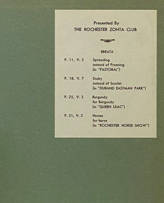 Rochester, New York: Melissa E. Bingeman, 1930. Hard Cover. Very Good/Good. 0x0x0. Includes original tissue jacket. Half inch tear along top edge of front jacket wrapper, a few chips to jacket edges. Errata pasted on front endpaper. 1930 Hard Cover. 35 pp. These poems appeared serially in the Rochester Democrat & Chronicle from March to October, 1930. Places include the Port of Rochester, Oxford Street, Cob's Hill, Browncroft, Genesee, Durand-Eastman Park, Park Avenue, Irondequoit, Highland Park, Pinnacle Hill, East Avenue, and more.