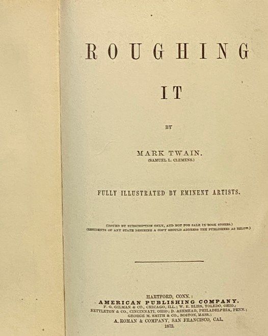 Hartford: American Publishing Company, 1872. First Edition. Hard Cover. Very Good/No Jacket. 0x0x0. First edition, first state (BAL 3337) with ad on p. 592. Edges rubbed (fore edge exposed), single gathering sprung, a few pages faintly foxed. 1872 Hard Cover. xviii, 591, [7] pp. 8vo. Two engraved frontispieces, six plates in text. Numerous engravings throughout. "Roughing It is a book of semi-autobiographical travel literature written by American humorist Mark Twain. It was written during 1870 - 71 and published in 1872 as a prequel to his first book Innocents Abroad. This book tells of Twain's adventures prior to his pleasure cruise related in Innocents Abroad. Roughing It follows the travels of young Mark Twain through the Wild West during the years 1861 - 1867. After a brief stint as a Confederate cavalry militiaman, he joined his brother Orion Clemens, who had been appointed Secretary of the Nevada Territory, on a stagecoach journey west. Twain consulted his brother's diary to refresh his memory and borrowed heavily from his active imagination for many stories in the novel. Roughing It illustrates many of Twain's early adventures, including a visit to Salt Lake City, gold and silver prospecting, real-estate speculation, and his beginnings as a writer. In this memoir, readers can see examples of Twain's rough-hewn humor, which would become a staple of his writing in his later books, such as Adventures of Huckleberry Finn, The Adventures of Tom Sawyer, and A Connecticut Yankee in King Arthur's Court. U.S. astronauts Frank Borman and James Lovell read "Roughing It" aloud to pass the time aboard NASA's Gemini VII, a 14-day-long Earth orbital mission in December 1965. Borman recalls reading the book during an on-camera interview in the 1999 PBS-TV (USA) television program "Nova: To the Moon".