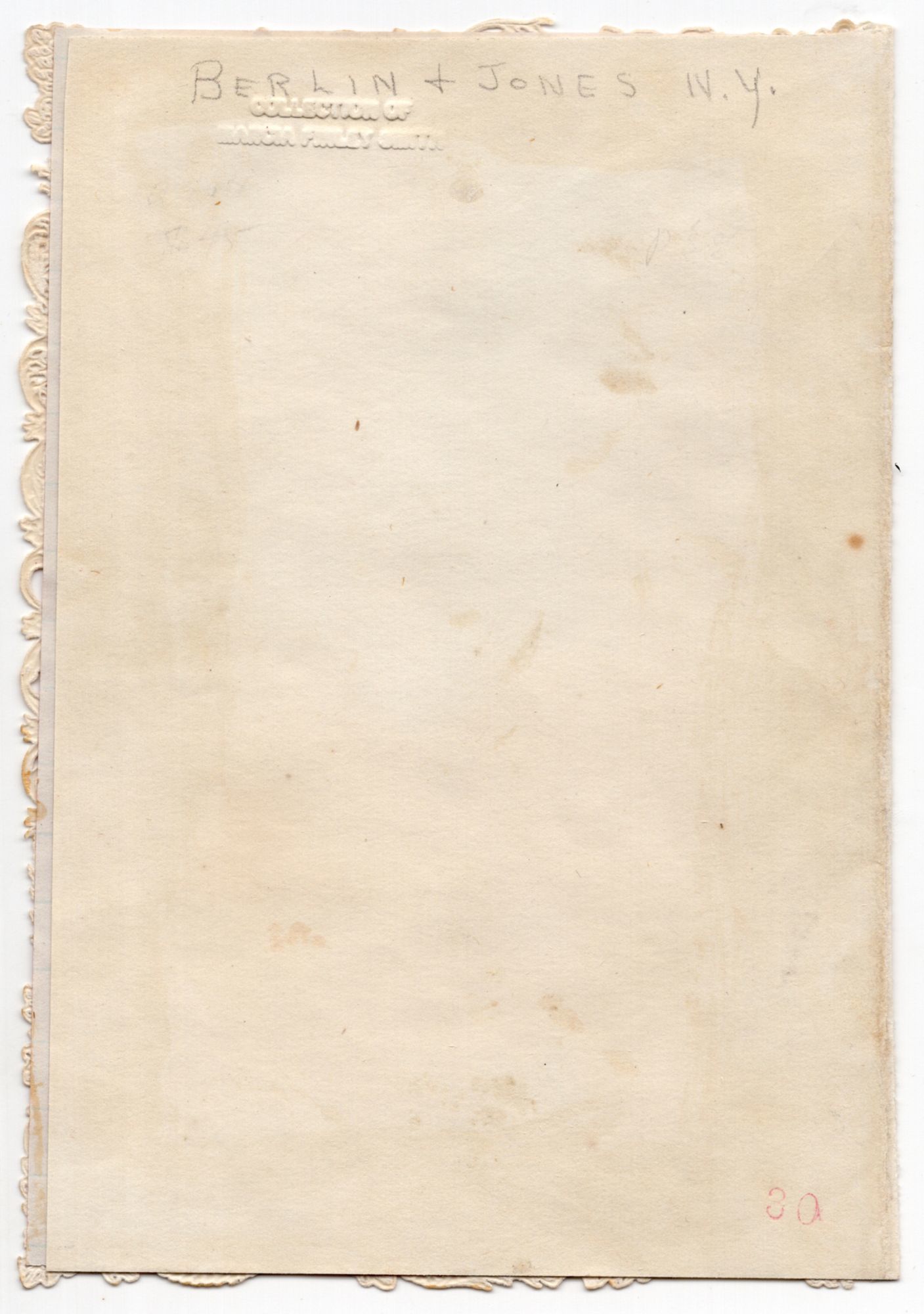 [New York, New York]: [Berlin & Jones], 1870. Very good to near-fine. One or two spots, a little crease and small point of tarnishing to gold scrap.. A striking "paper with a secret"-type Valentine, made from pictorial lace paper, embossed and die cut Victorian scrap, and a chromolithographed scrap with poem. The lace paper features an intricate border of birds and flora. To see the hidden message inside, the recipient must lift up the large gold scrap. The printed text inside reads, "Oh! ay not woman's love is true Who never felt its flame, Tis the man she glories to subdue, And love is but a name." It is addressed in pencil to Miss Minnie Lir(?). Measures approx. 5.25" by 3.5". Modern blind embossed ownership stamp of Marcia Finley Smith to lower leaf.
