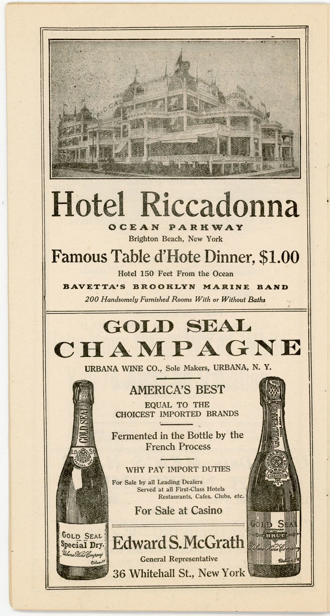 Brooklyn, NY, 1909. Very good. Minor toning.. Printed program for the week of August 23rd, 1909, of the Brighton Theatre in Coney Island: "Ladies will kindly remove their large hats". Dancing, orchestral music, comedy.