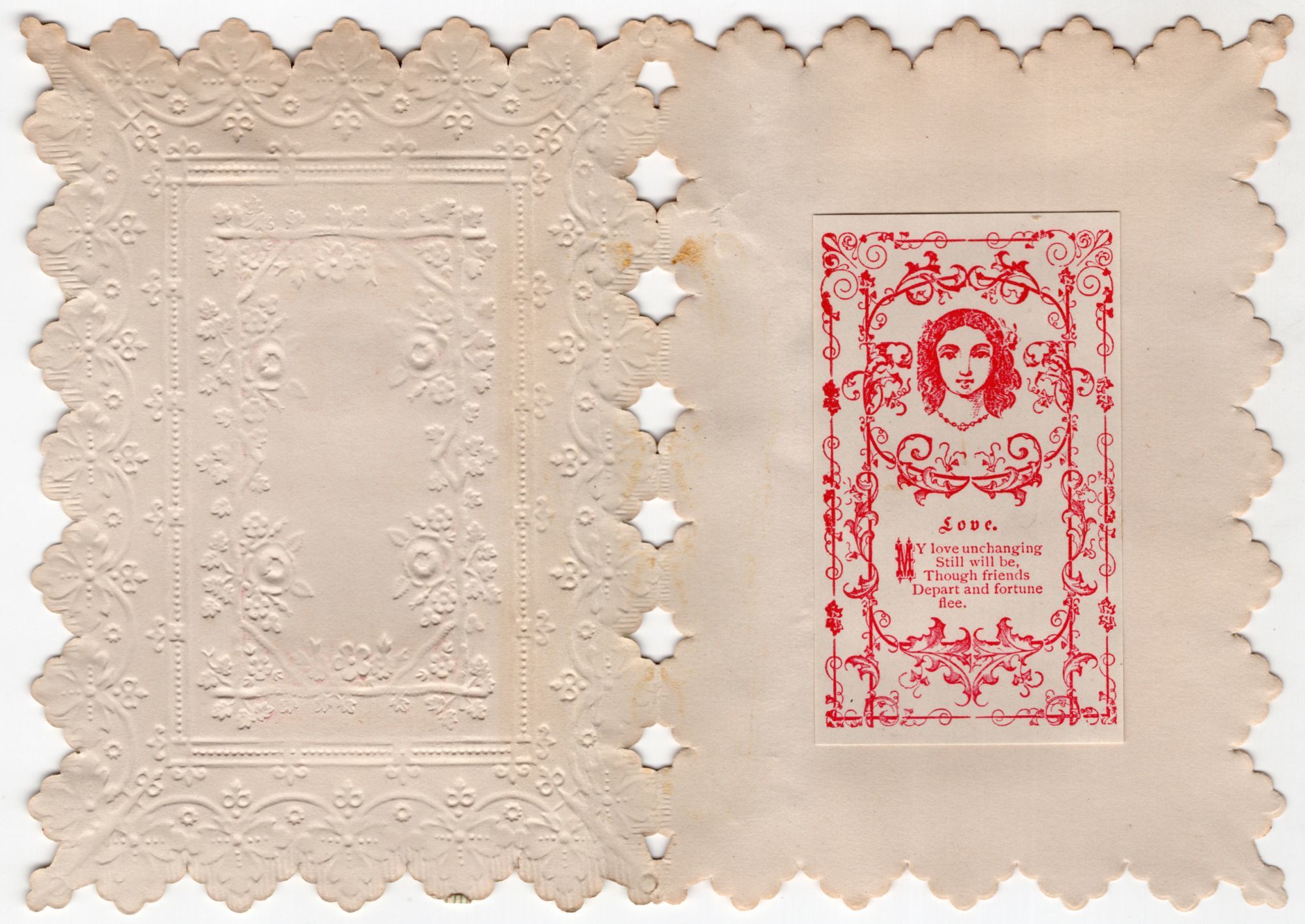 USA: Whitney, 1860. Very good to near-fine.. A finely produced 12mo valentien made from lace paper, Victorian scrap, a chromolithographed illustration, and a lithographed poem inside titled "Love": "My love unchanging Still will be, Though friends Depart and fortune flee". The lace paper has been embossed and die-cut in the shape of a classical shield, with a window revealing the illustration, which depicts a family hunting a wolf. Measures approx. 4.25" by 3