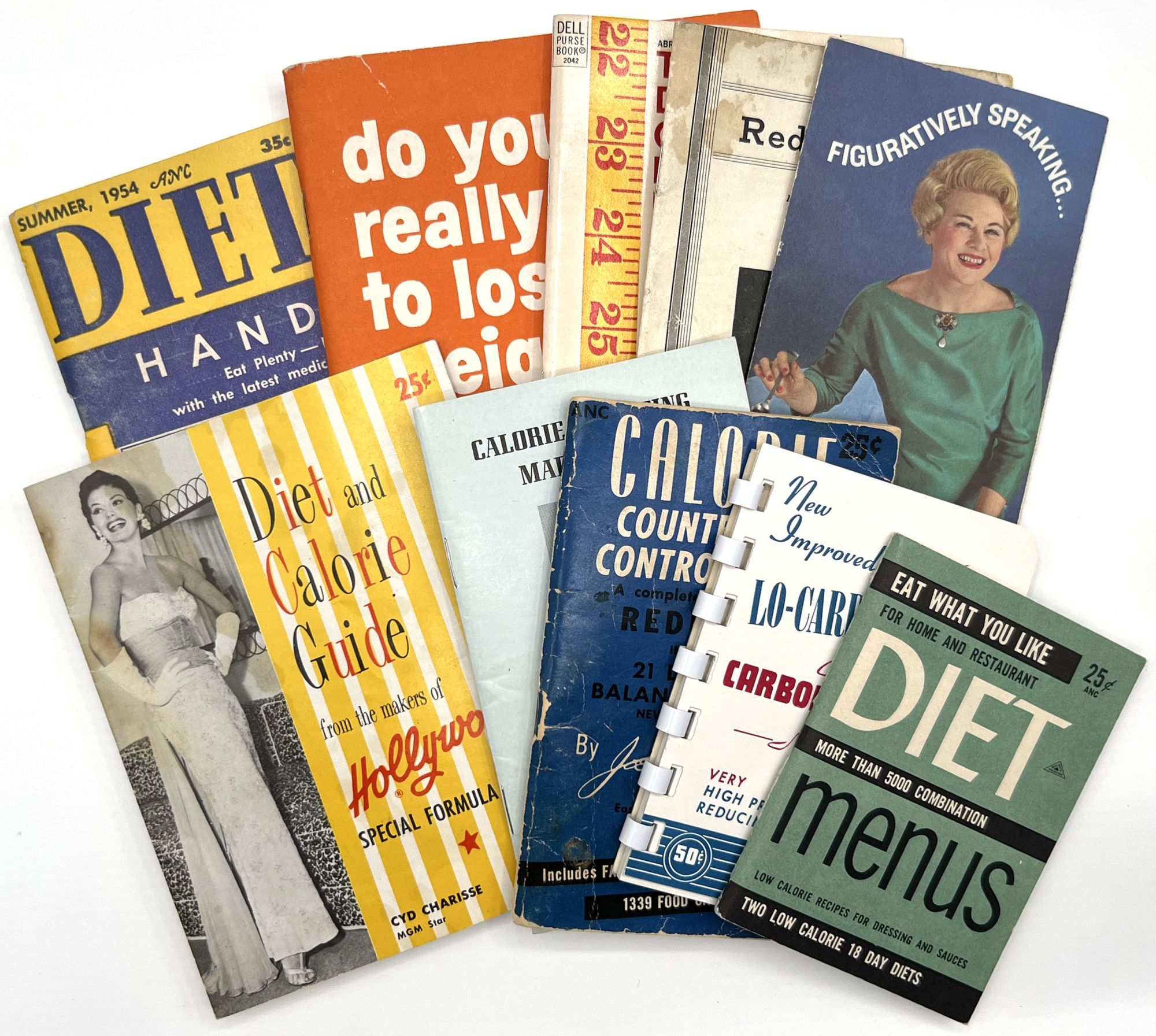 United States, 1970. Very good. Some toning, minor dust soiling, the occasional small nick or short tear. A couple water stains.. A collection of ten (10) items relating to weight loss and dieting in America between 1933 and 1970. Each of the items focuses intensely on weight loss to improve body image, with an emphasis on dieting methods such as calorie counting/restriction and "low-carb" dieting. Often the booklets use rhetoric of restriction or fight to motivate its readers (e.g. "Fight flabbiness!"), charging the ideas of eating and body image with struggle. Recipes and meal plans included. Most advertise some kind of product or weight loss program for sale and are pocket-sized. None of the "ideal weight" charts seem to match. An excellent example of America's tendency to intermingle body image and weight-- and find a way to monetize it.