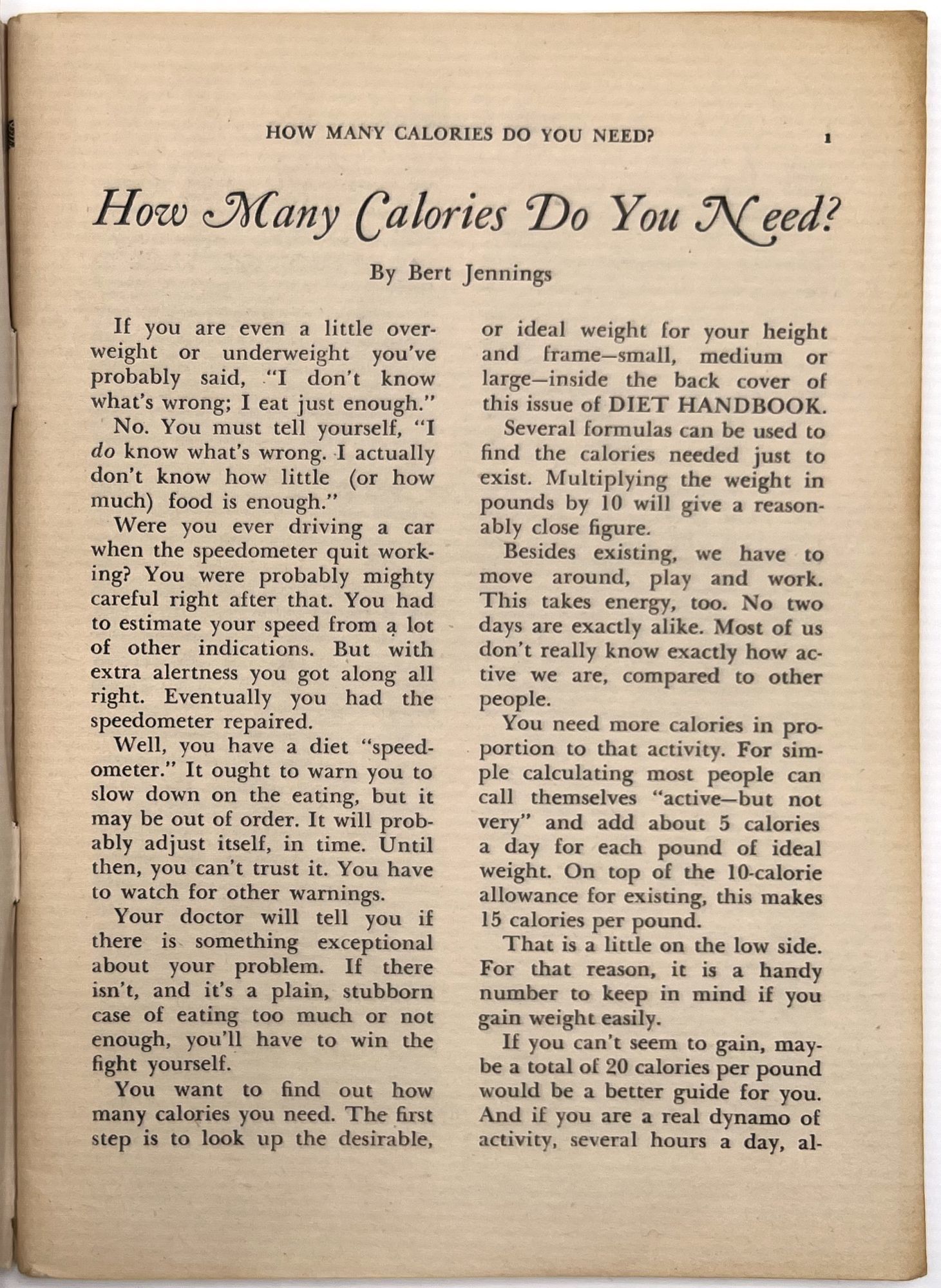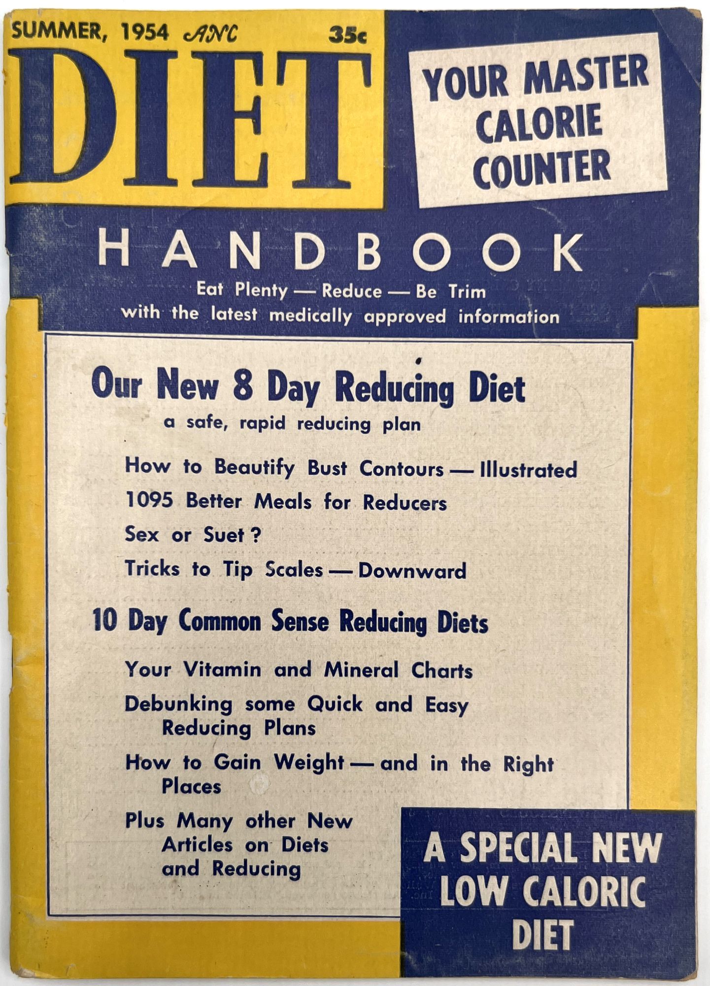 "Diet Handbook". Duluth: Cullum Publications, 1954. Single vol. (7.75" by 5.5"), pp. 64, illus., stapled in original printed wrps. Summer 1954 issue. Contains ideal weight charts, recipes, specific sections for men and women.