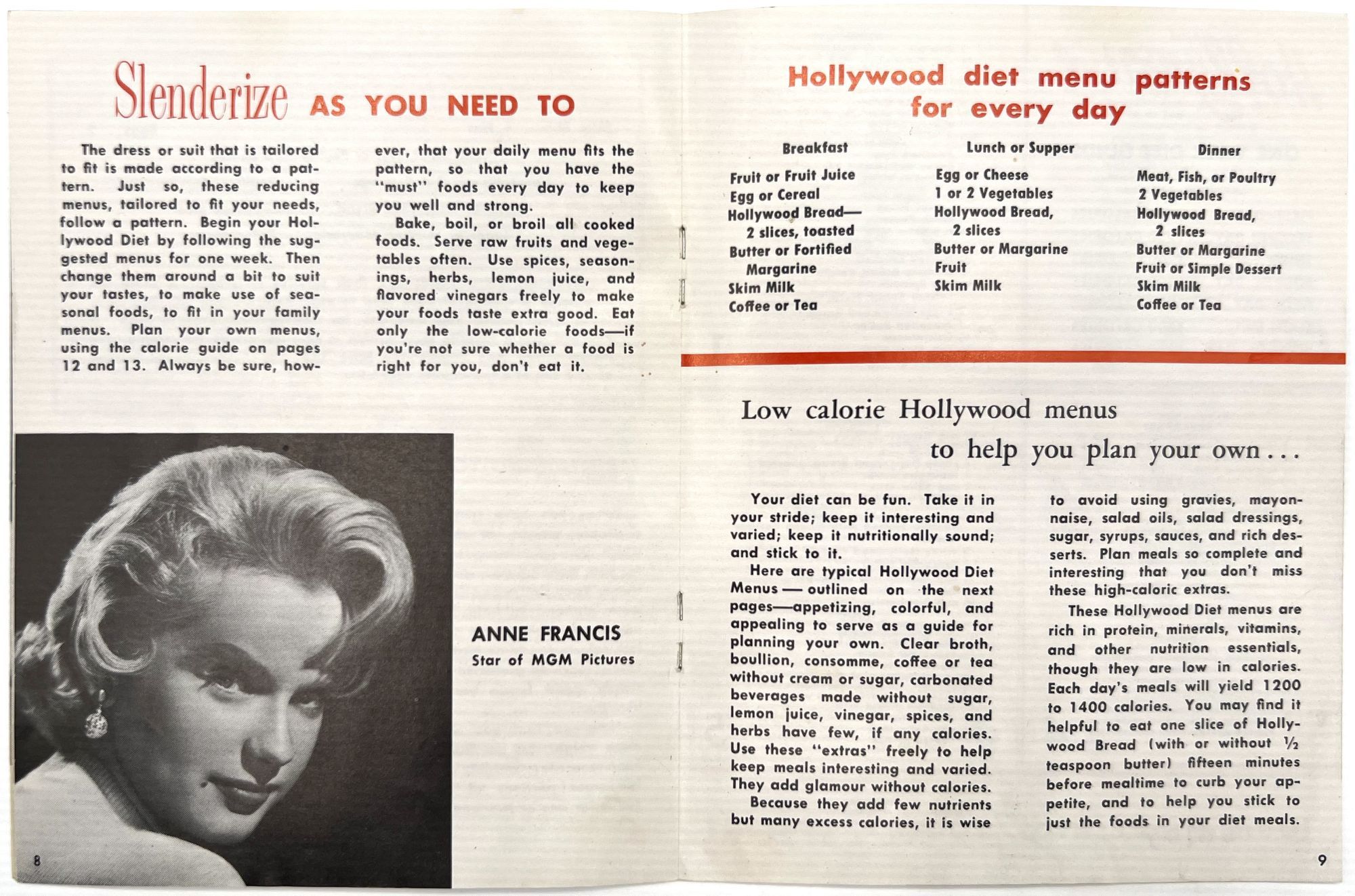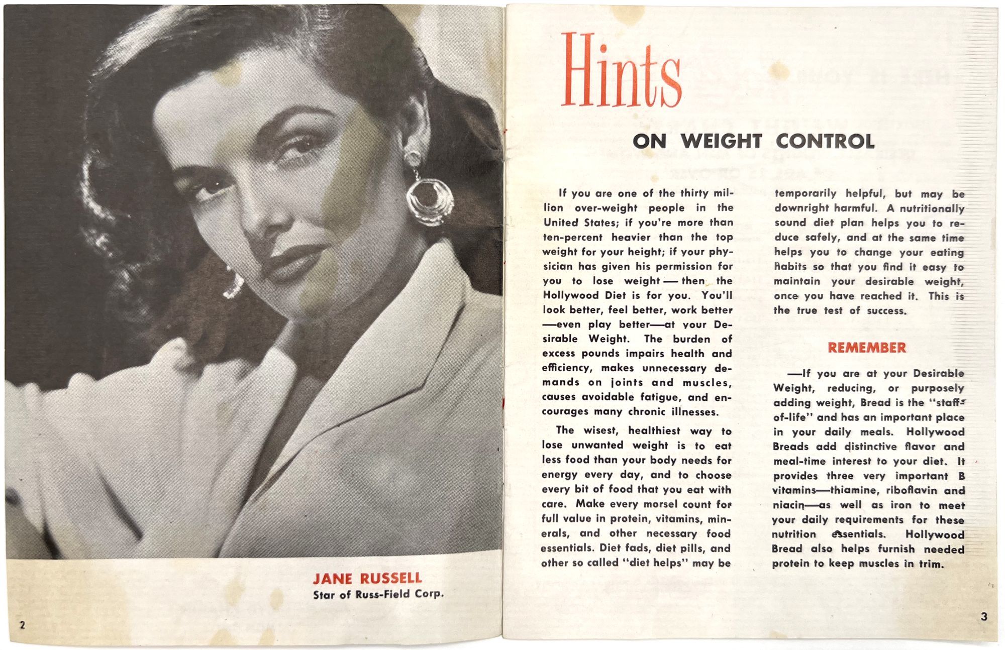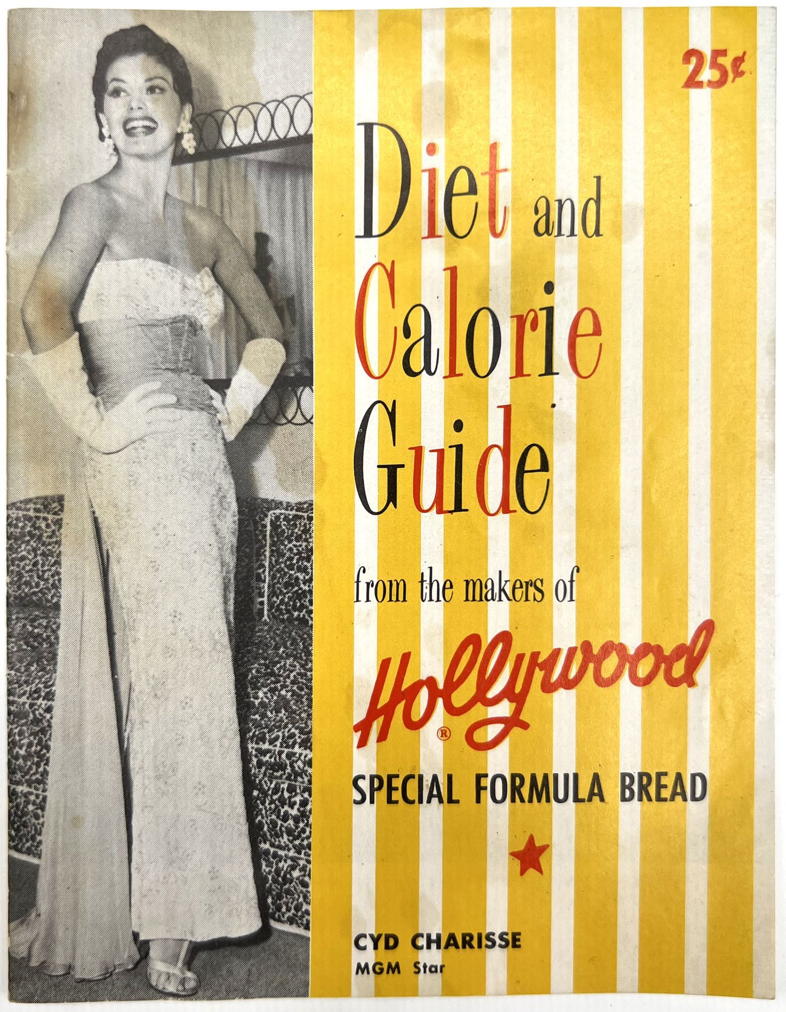 "Diet and Calorie Guide from the Makers of Hollywood Bread". N.pl.: Hollywood Bread, c.1950. Single vol. (5.5" by 4.25"), pp. 16, original illus. self wrps. Advertises diet bread with images of famous Hollywood starlets/sex symbols. Includes ideal weight charts, meal plans, exercises.