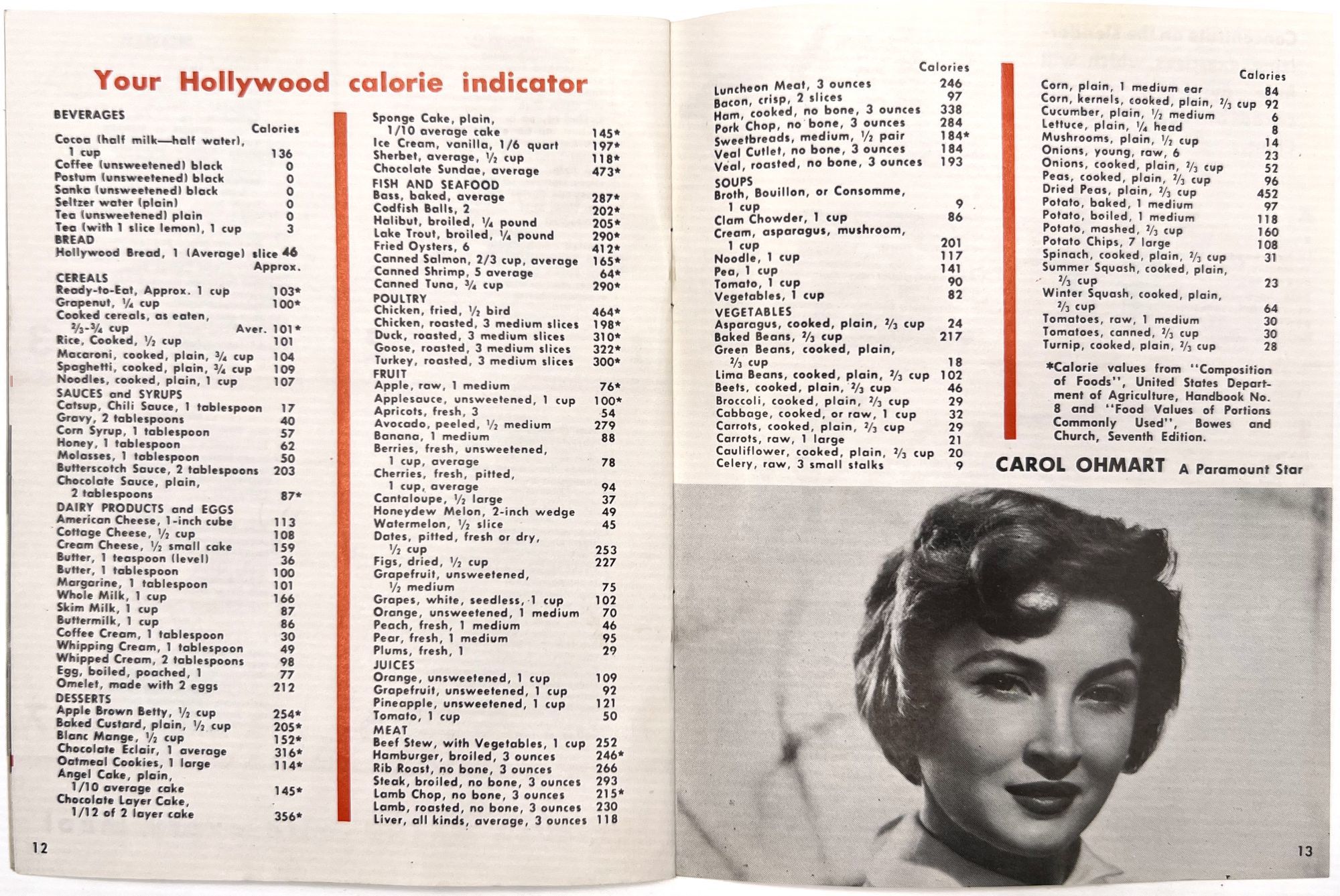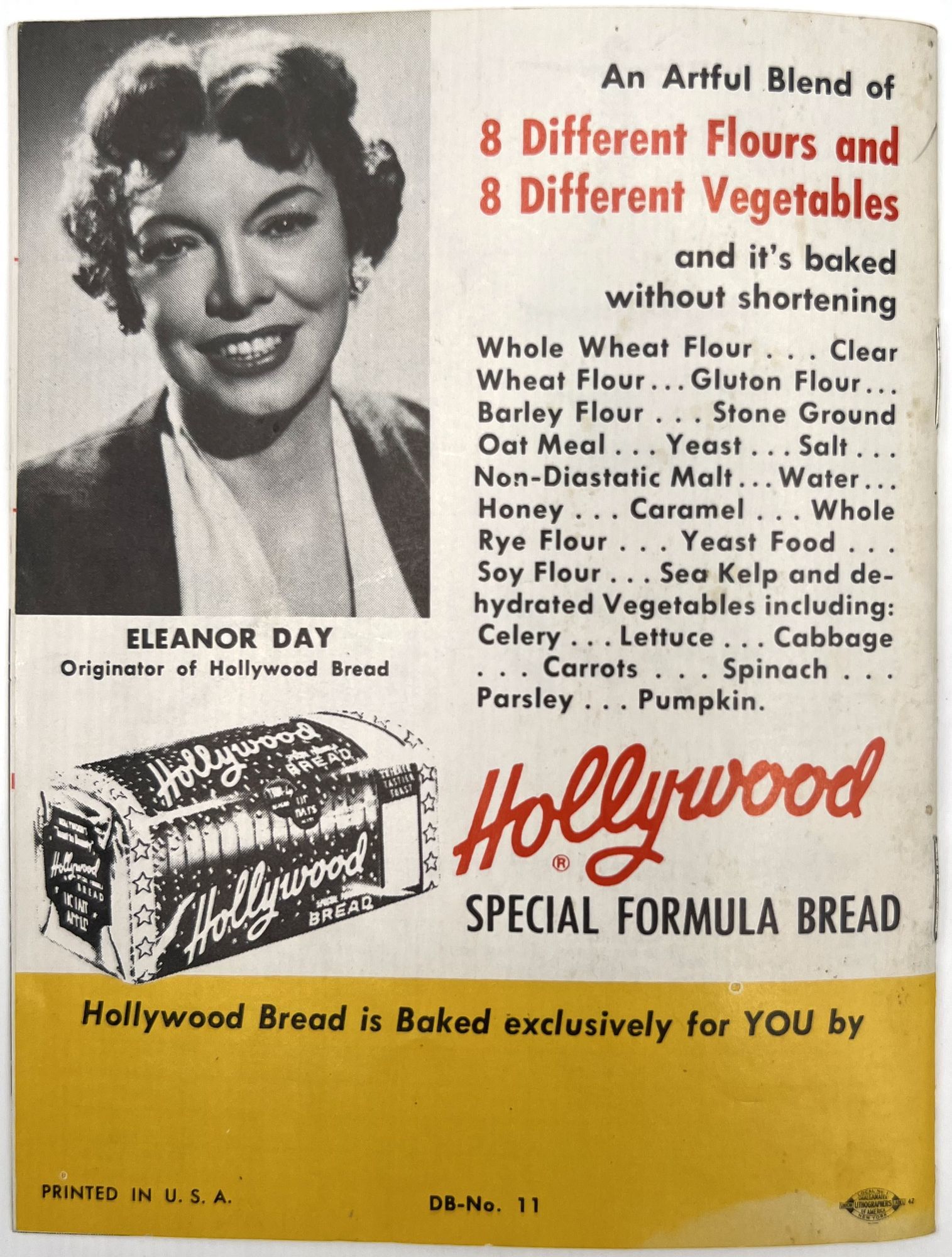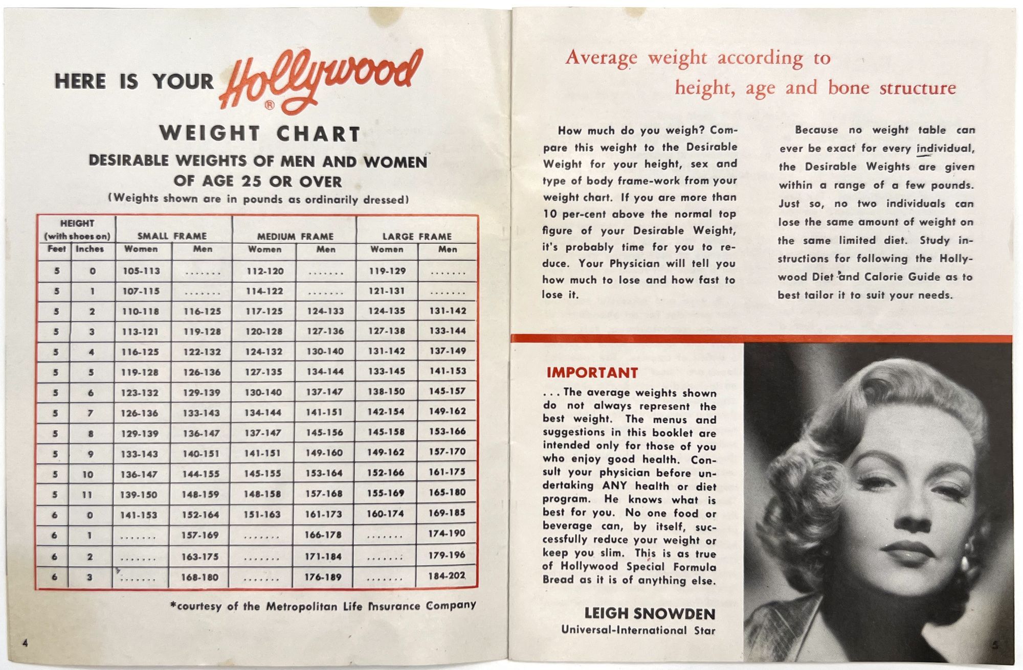 "Diet and Calorie Guide from the Makers of Hollywood Bread". N.pl.: Hollywood Bread, c.1950. Single vol. (5.5" by 4.25"), pp. 16, original illus. self wrps. Advertises diet bread with images of famous Hollywood starlets/sex symbols. Includes ideal weight charts, meal plans, exercises.