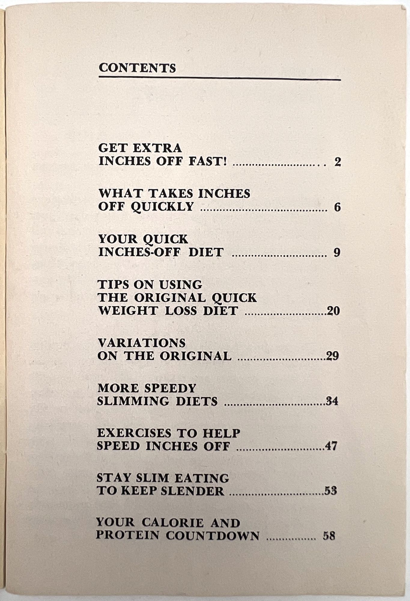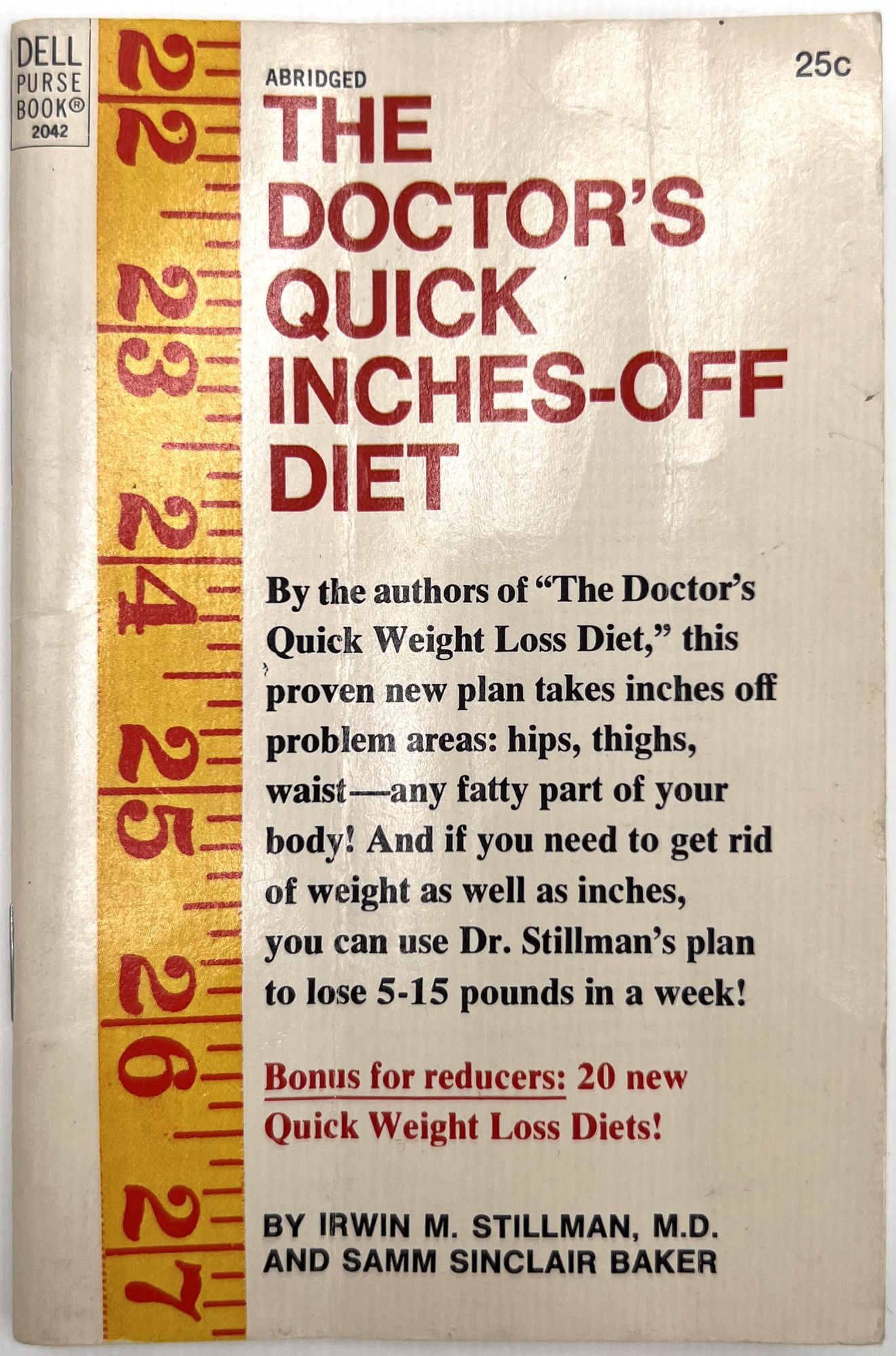 Stillman, Irwin, and Samm Sinclair Baker. "The Doctor's Quick Inches-Off Diet". New York: Dell, 1970. Single vol. (5.25" by 3.5"), pp. 58, [6], stapled in original illus. wrps. with measuring tape image on front. Meal planning, calorie counting, ideal weight chart. Interesting to see what notions have, and have not, survived today about weight loss and healthfulness (e.g. the idea of "Ideal Weights" for men and women).
