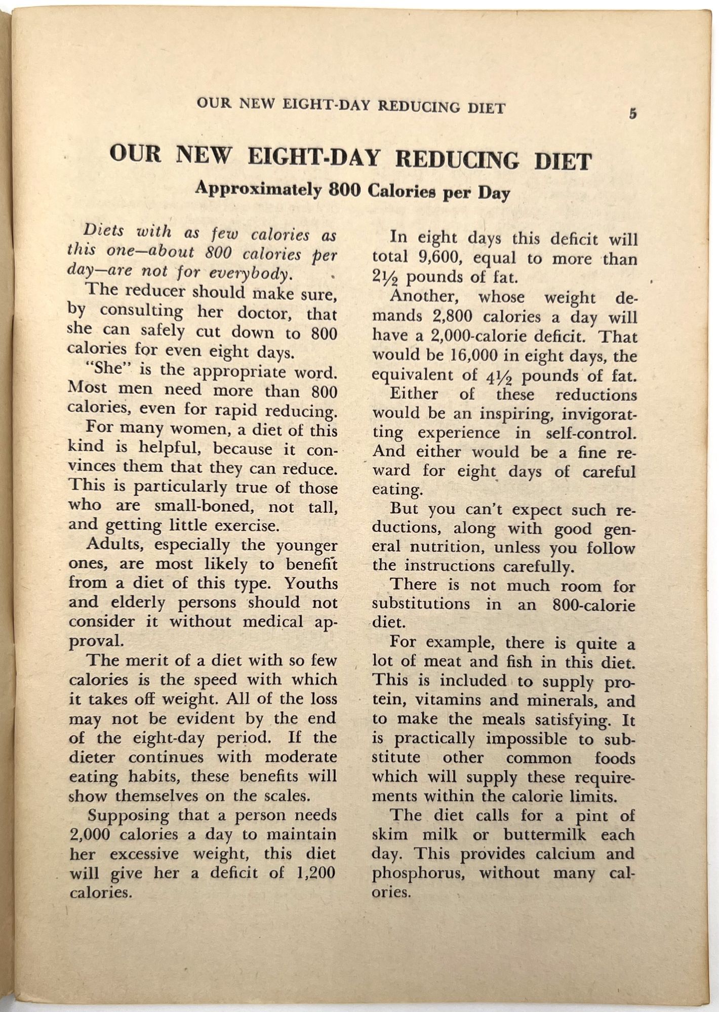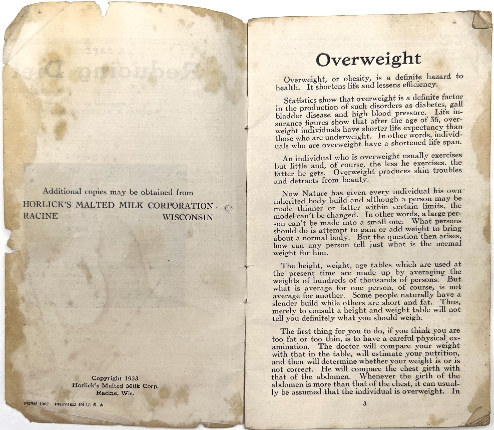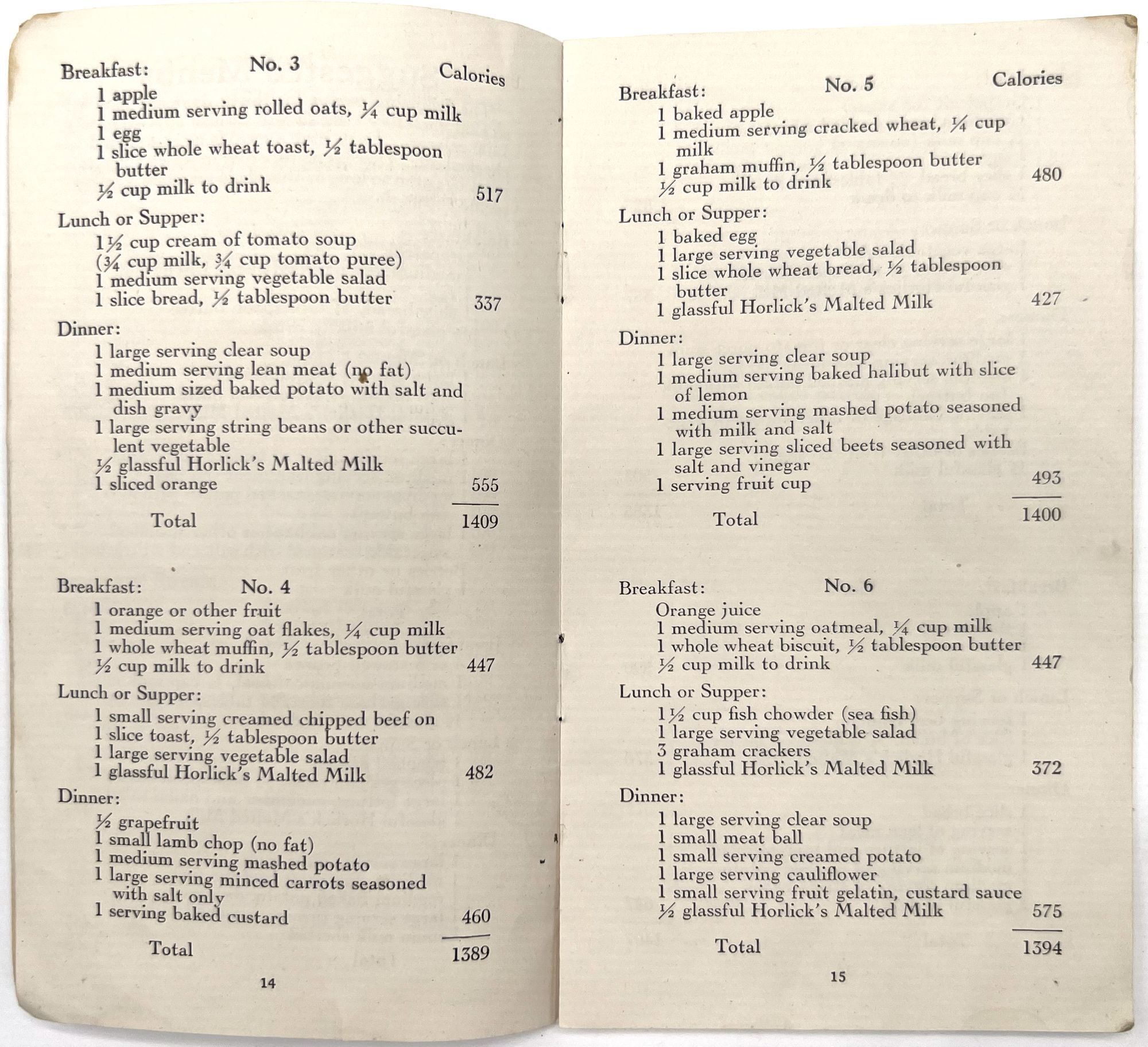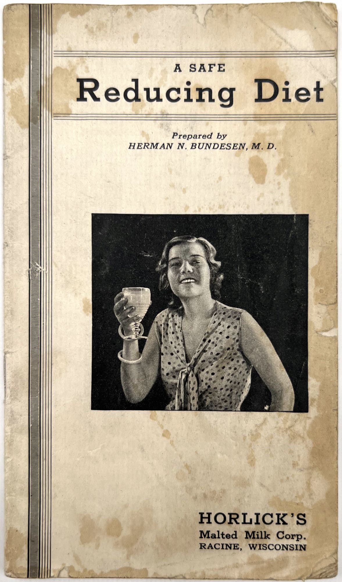 "A Safe Reducing Diet". Racine: Horlick's Malted Milk Corp., 1933. Single vol. (6" by 3.5"), pp. 29, [1], stapled in original illus. wrps. Advertises Horlick's Malted Milk, includes ideal weight charts, meal plans, exercises. Chart of how many calories different activities burn (e.g. 160 calories for bookbinding, 250-300 for housework).