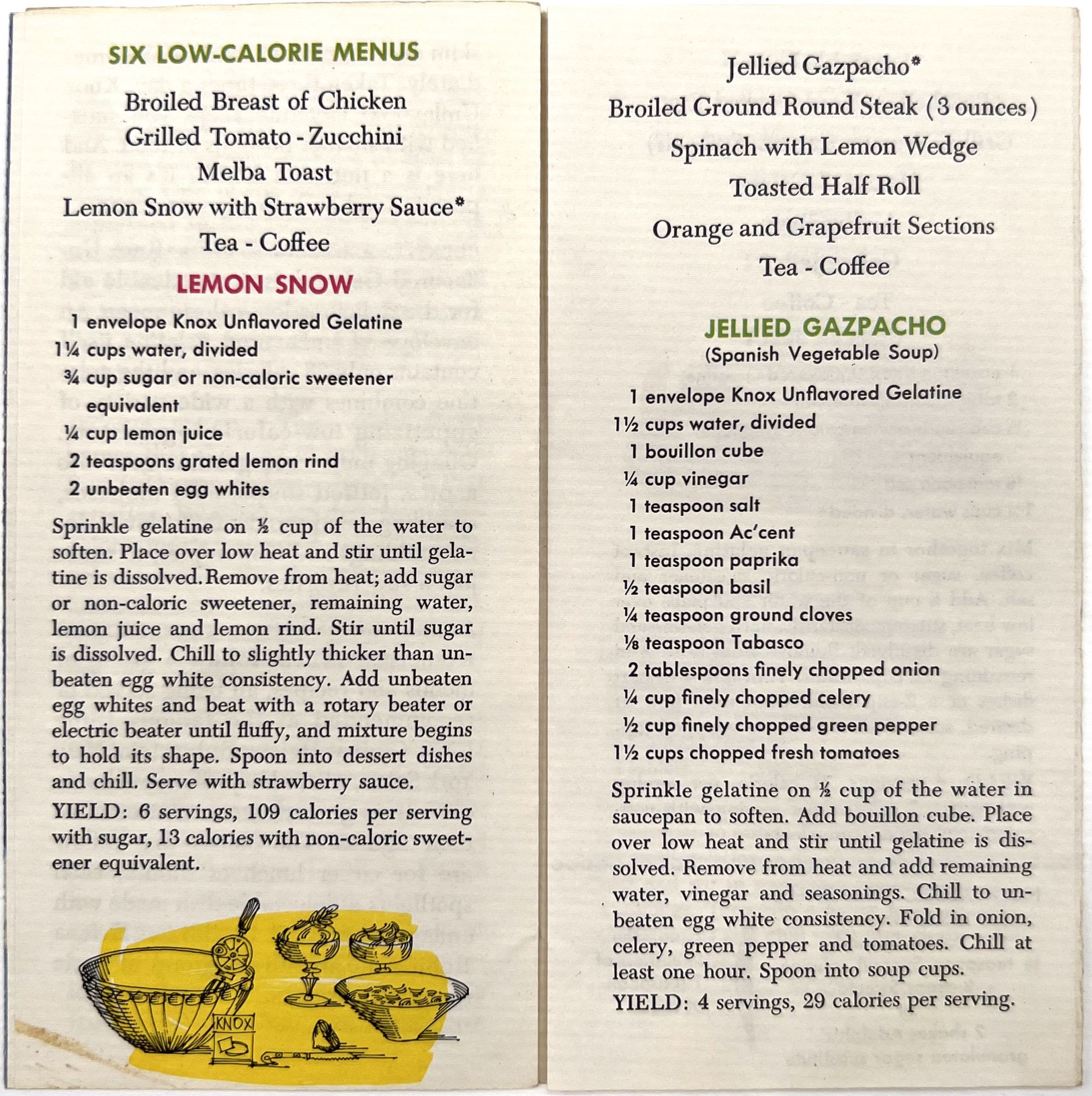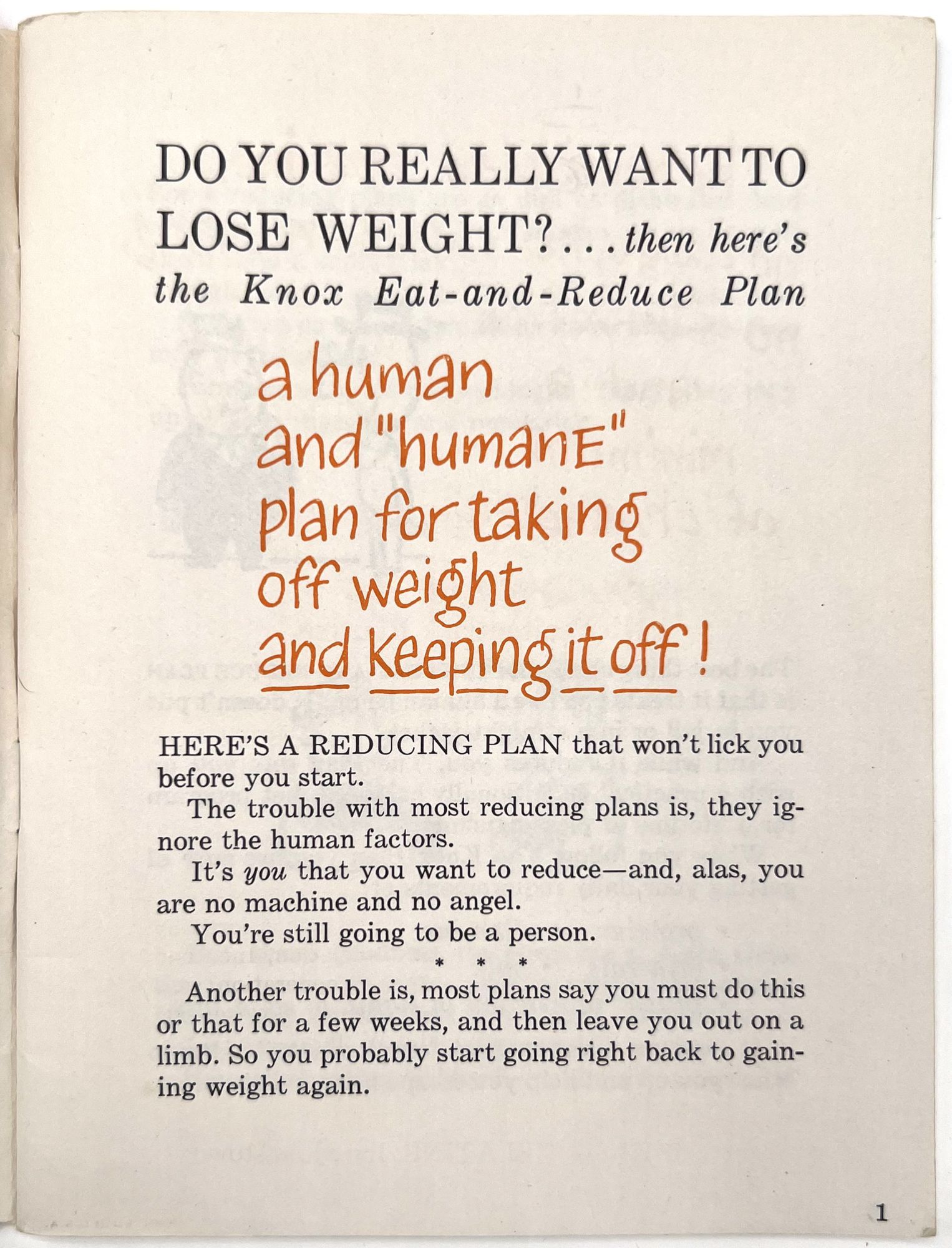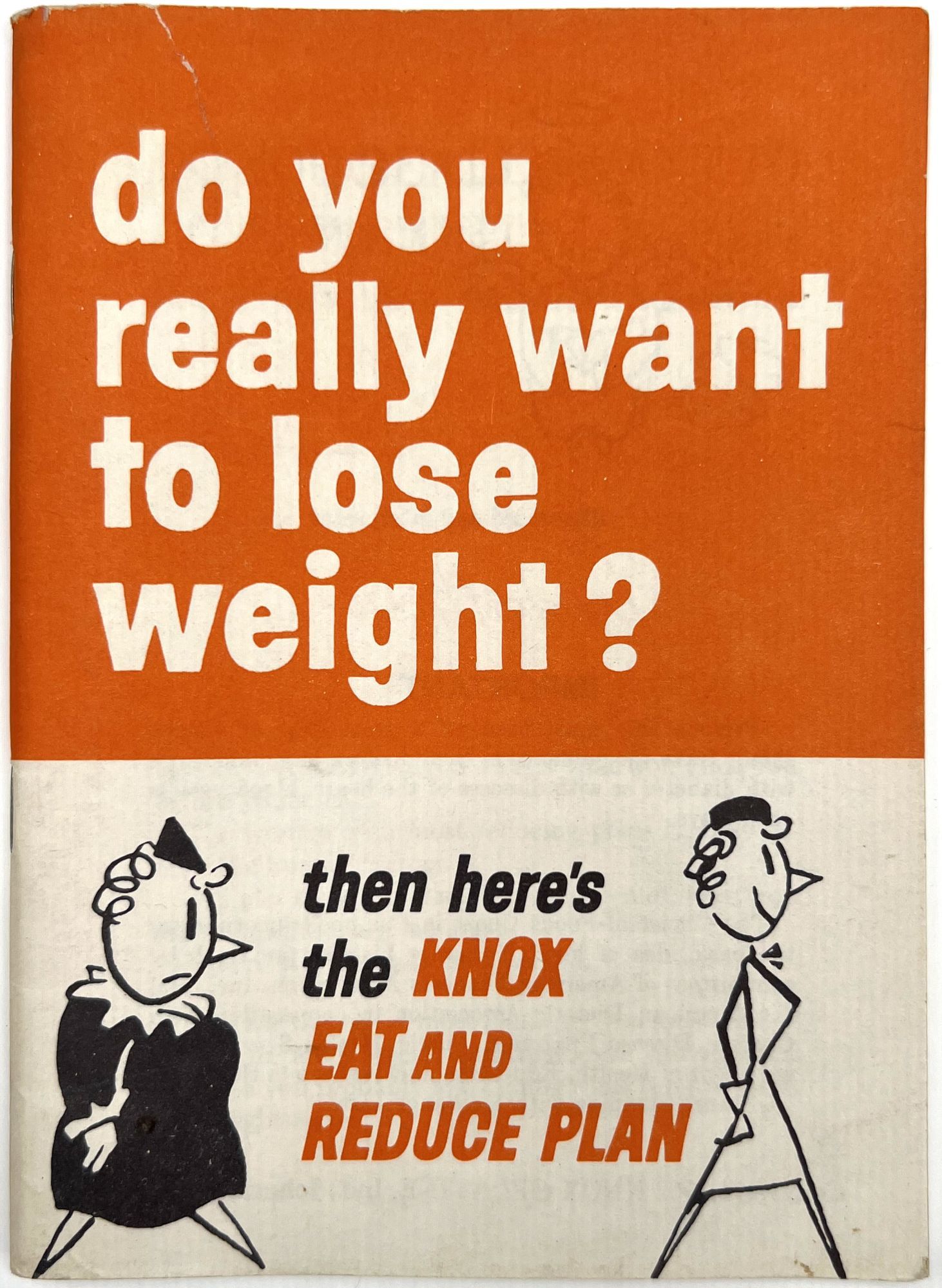 "Do You Really Want to Lose Weight?" Johnstown: Knox Gelatine, Inc., 1962. Single vol. (6.5" by 4.75"), pp. 52, illus., stapled in original illus. wrps. Advertises Knox gelatine, includes meal plans, recipes.