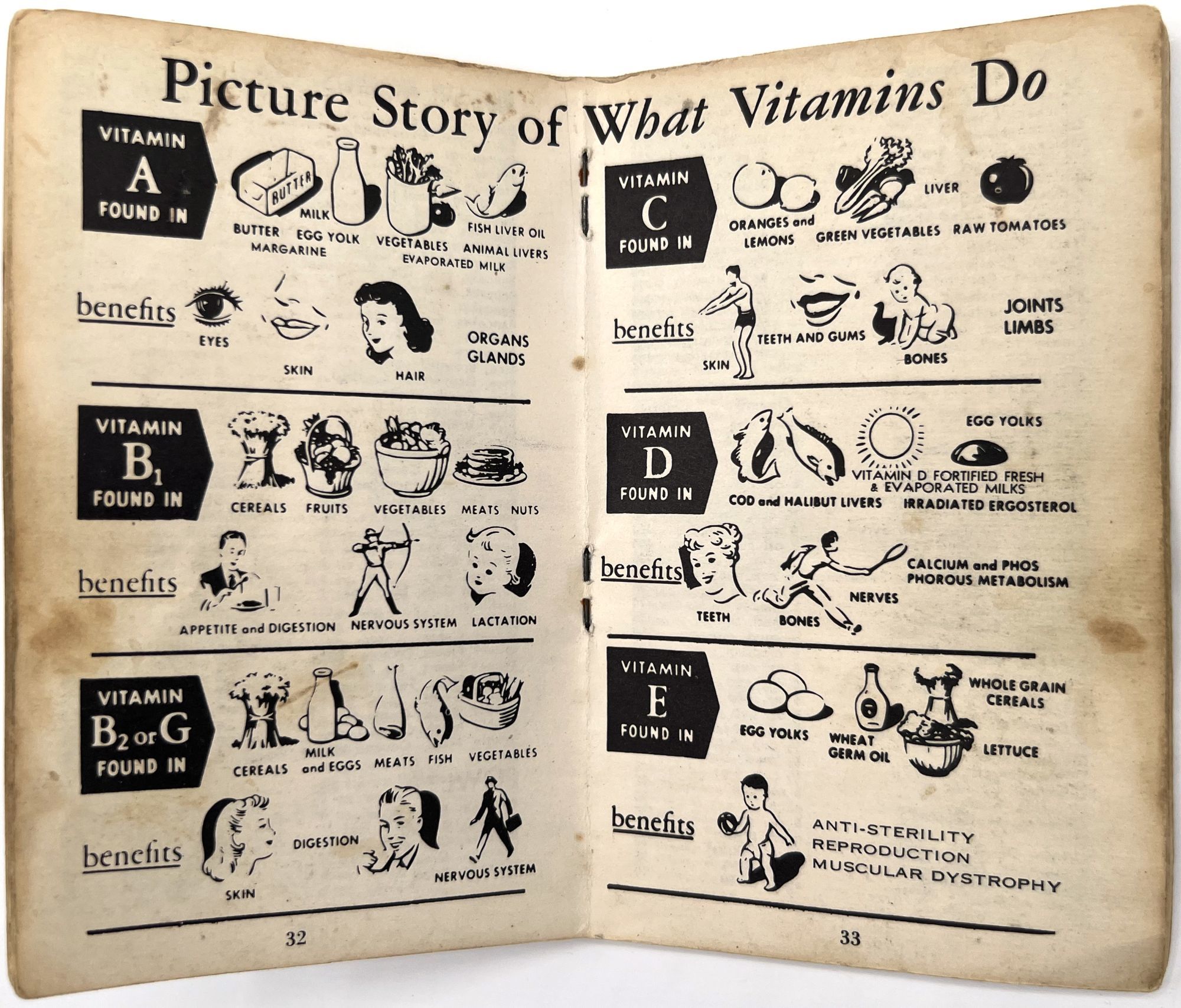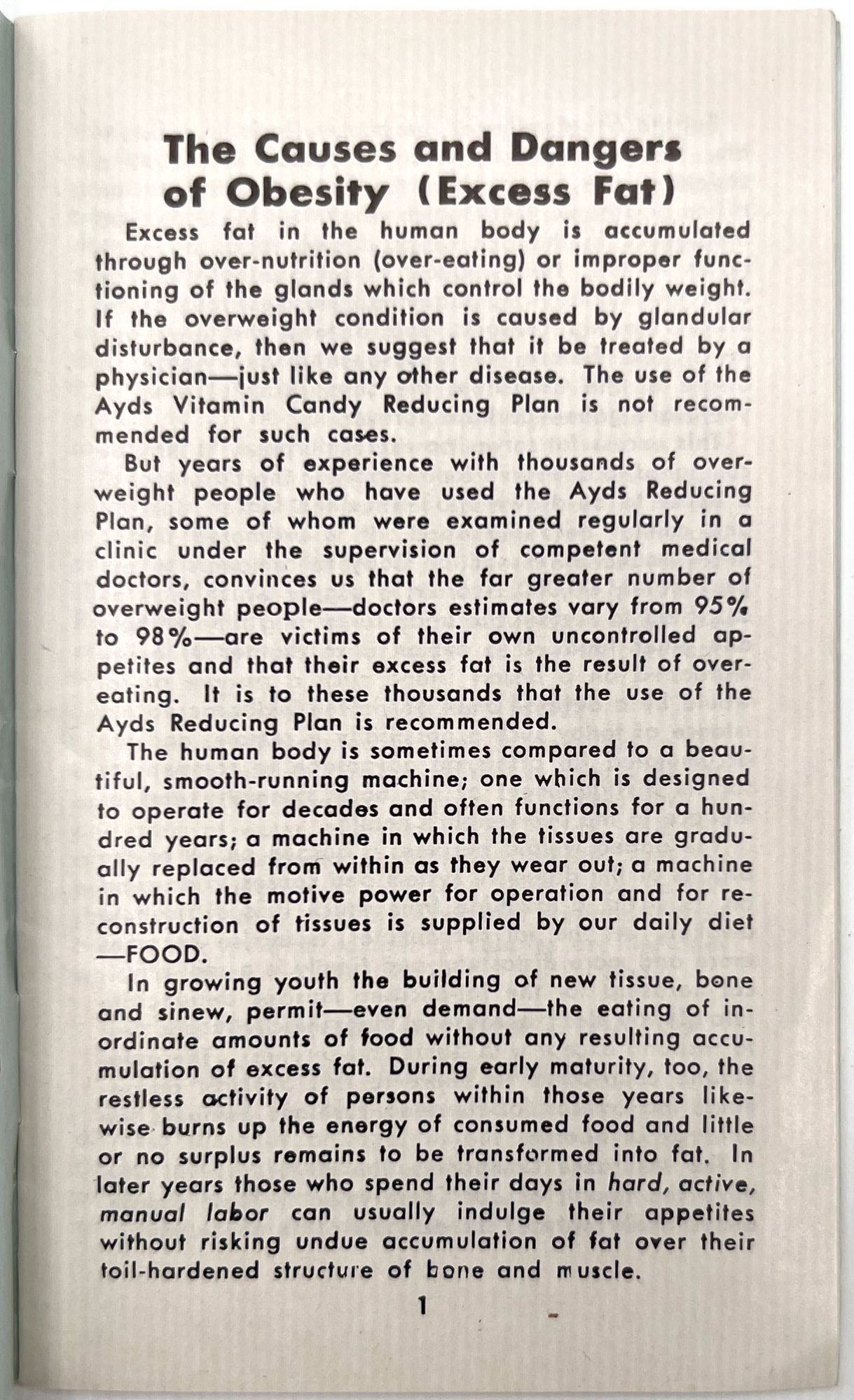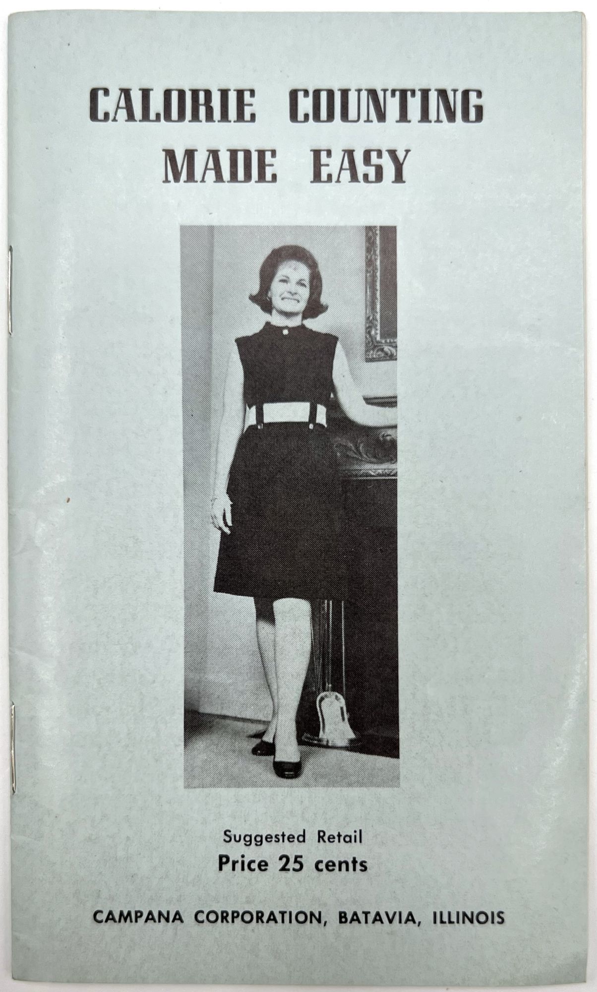 "Calorie Counting Made Easy". Batavia: Campana Corp., c.1965. Single vol. (5.25" by 3"), pp. 32, stapled in original illus. blue wrps. Includes ideal weight chart, calorie counts for different foods, advertises smoking deterrent tablets and Ayds weight loss candies.