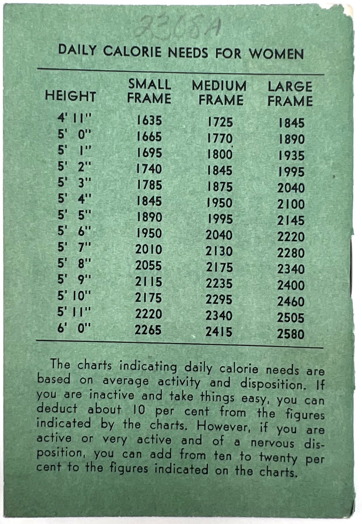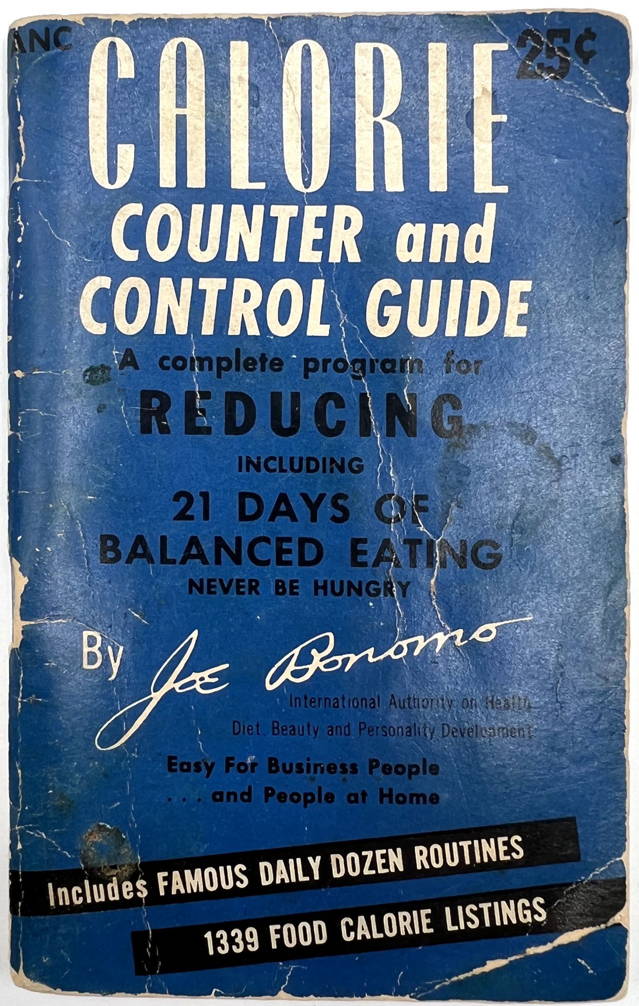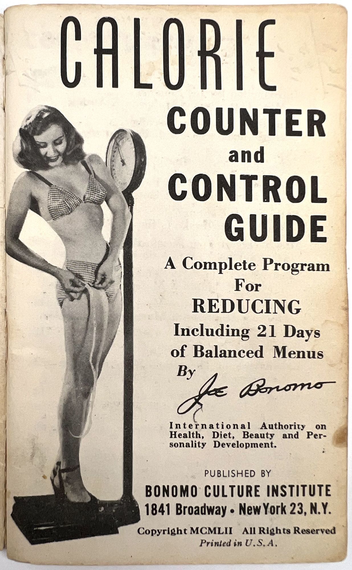 "Calorie Counter and Control Guide". New York: Bonomo Culture Institute, 1952. Single vol. (5" by 3.25"), pp. 64, illus., stapled in original blue wrps. Endorsed by Joe Bonomo, American weightlifter. Ideal weight charts for men and women, calorie counts for different foods.