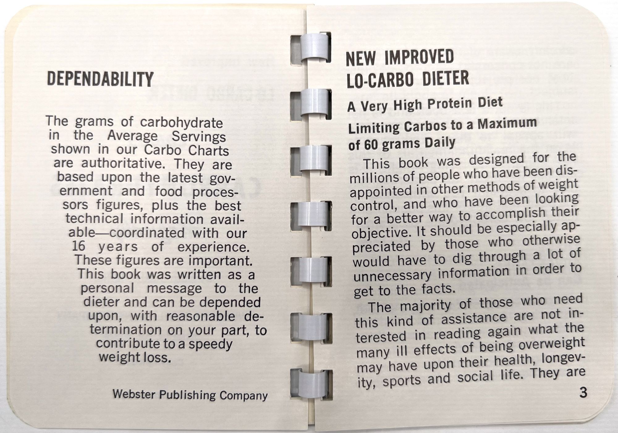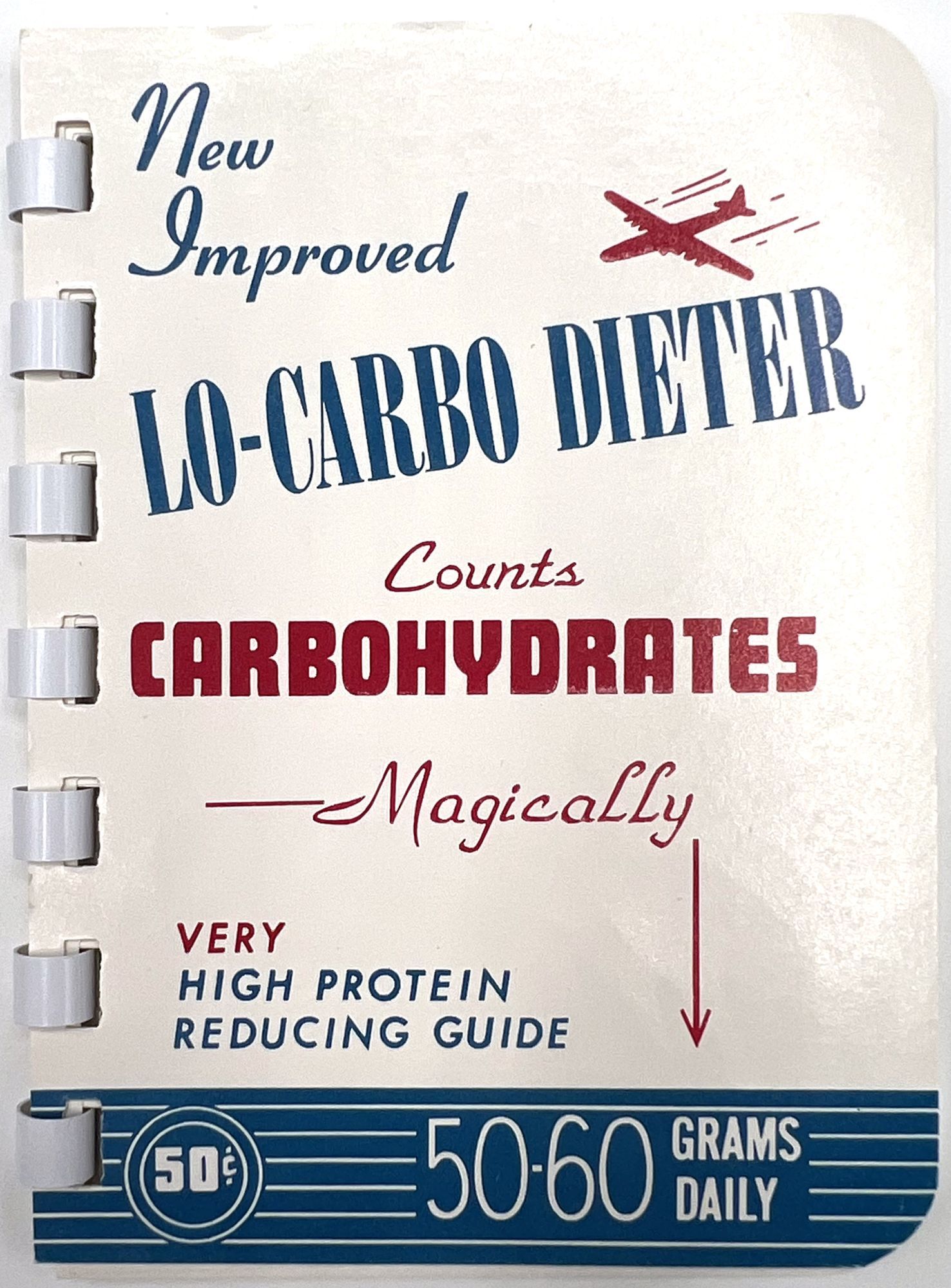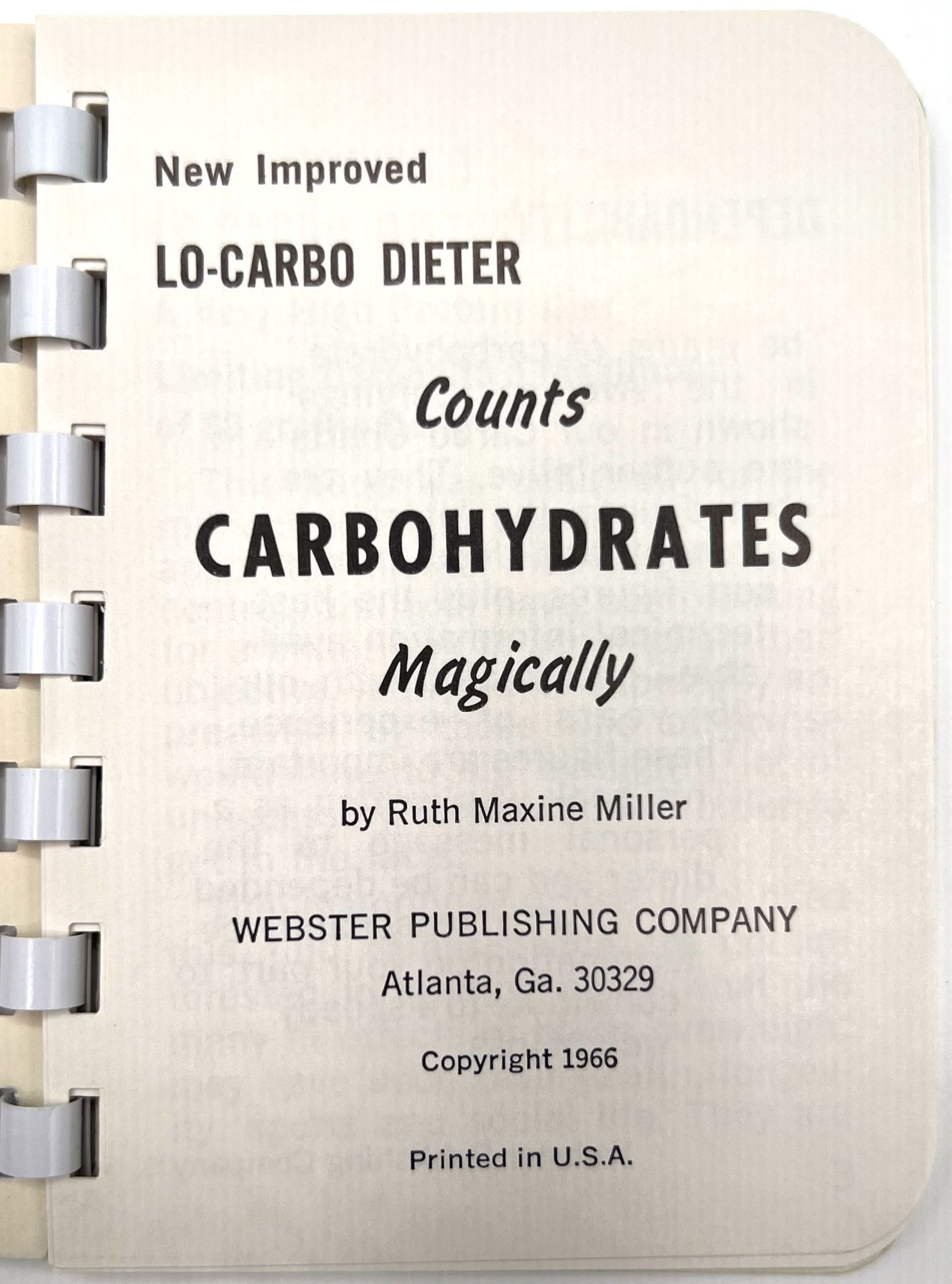 "New Improved Lo-Carbo Dieter Counts Carbohydrates Magically". Atlanta: Webster, 1966. Single vol. (4.25" by 3.25"), pp. 48, in original white comb binding, rounded corners. Includes carb counts for different foods, blank chart for "my favorite low carb foods".