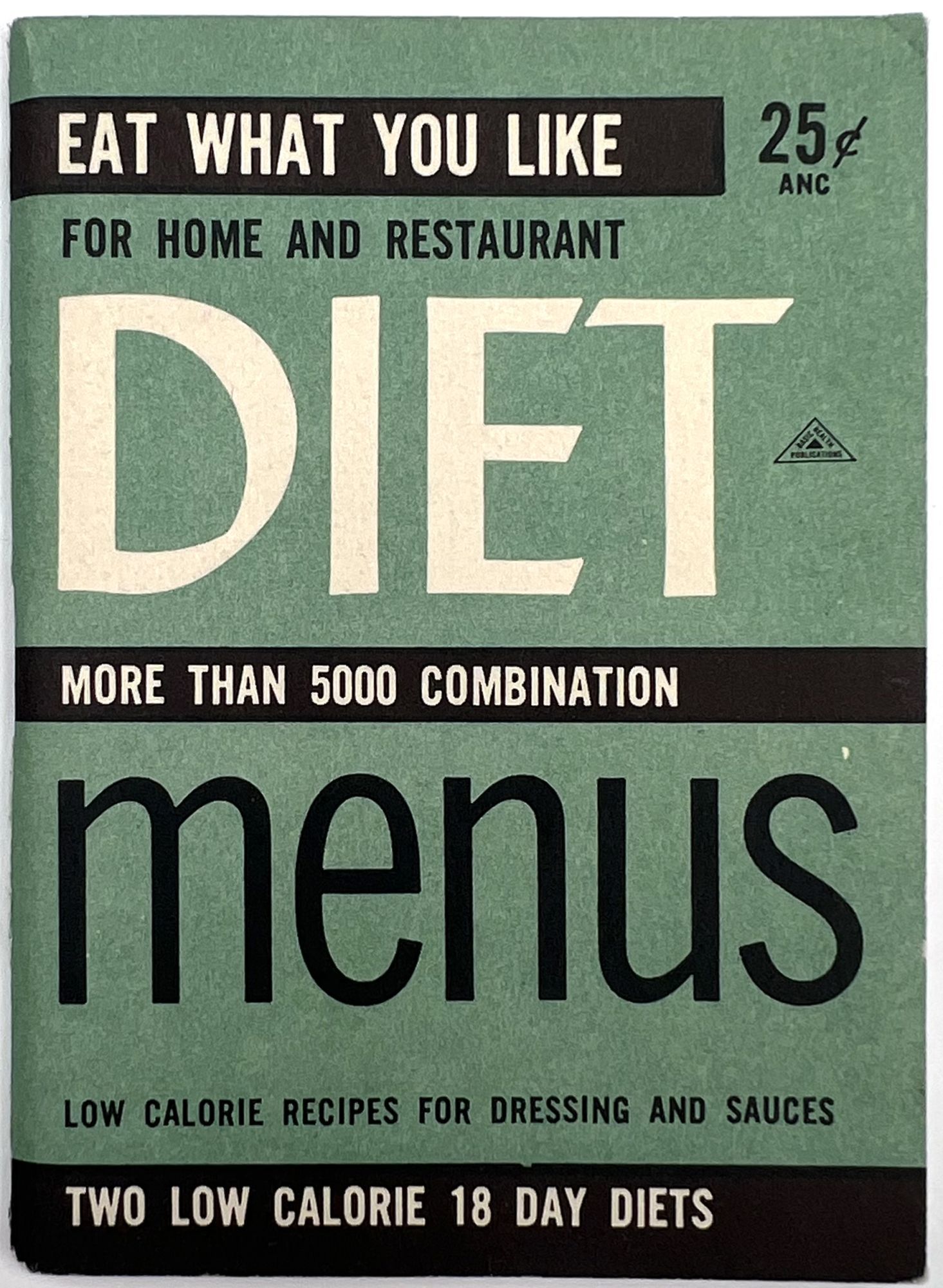 "Diet Menus". New York: Basic Health, 1956. Single vol. (4" by 2.75"), pp. 48, stapled in original printed green and black wrps. Menu and calorie counts, for women.