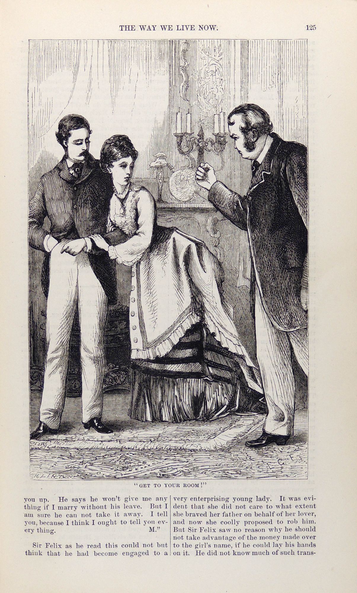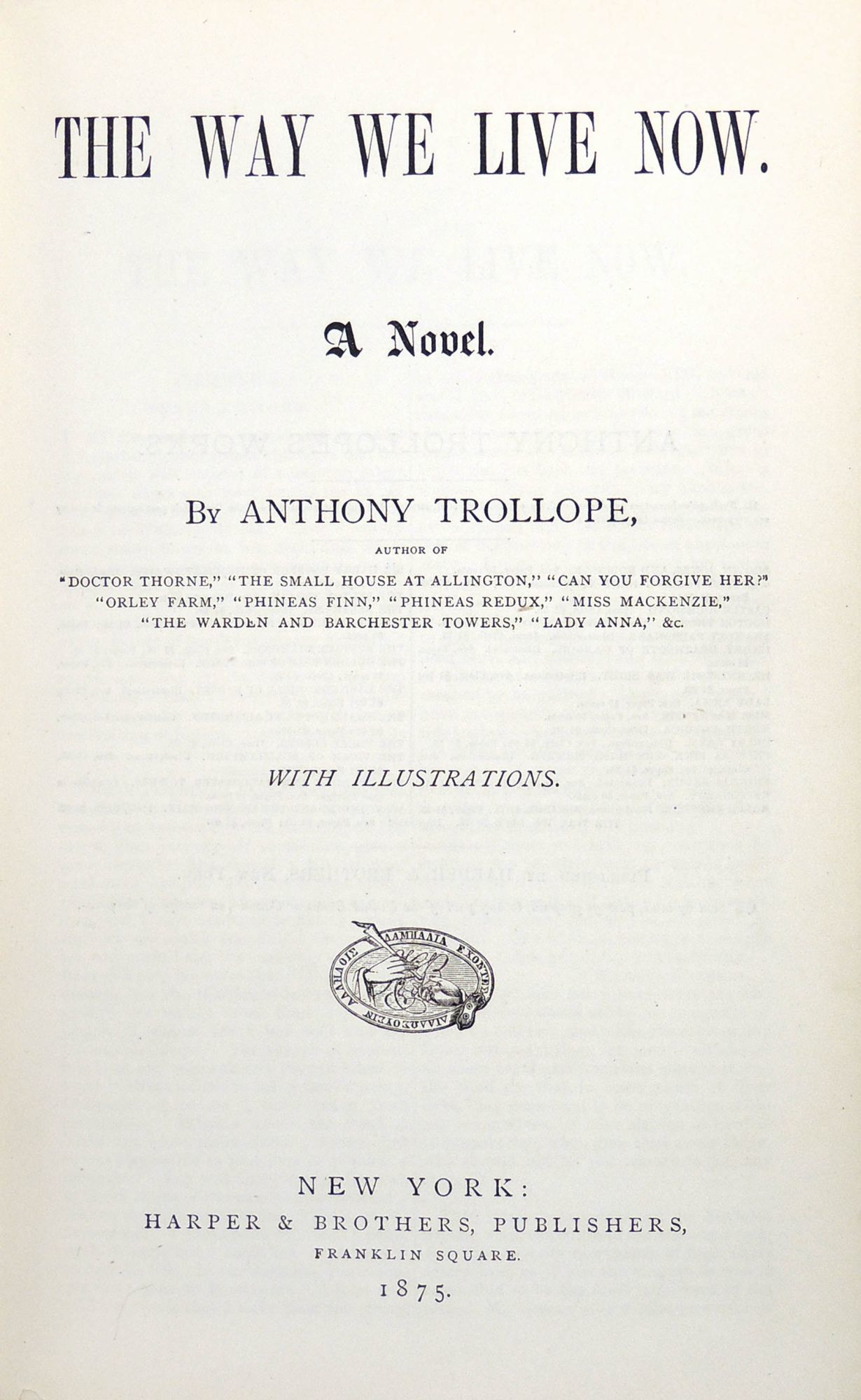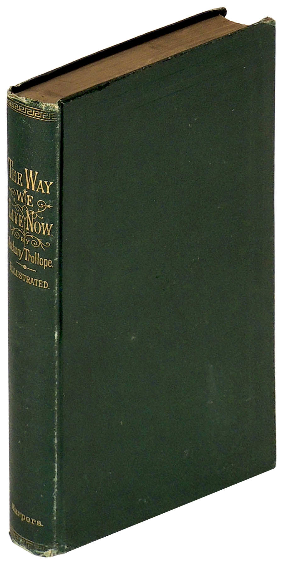 New York: Harper & Brothers, 1875. Hardcover. Very Good. Hardcover. This is the first American edition of Trollope's novel, published in the United States the same year as the first edition in England. It is one of Trollope's later novels, and is considered by many as his great masterpiece. It is his longest novel, and was inspired by the British financial scandals of the early 19870s. It depicts how greed and dishonesty pervaded the commercial, political, moral and intellectual life of that era. Bound in publisher's original green cloth with gilt titling to spine. Light fraying to spine ends and edges and bumping to corners. Slight signs of wear to cloth. Some wear along hinges. Interior pages clean and bright. Extensively illustrated by "LGF," attributed to Lionel Grimshaw Fawkes. A nice copy in very good condition. Size: 6 x 9.25 inches. 408 pages plus 8 pages of publisher ads. LIT/061824.