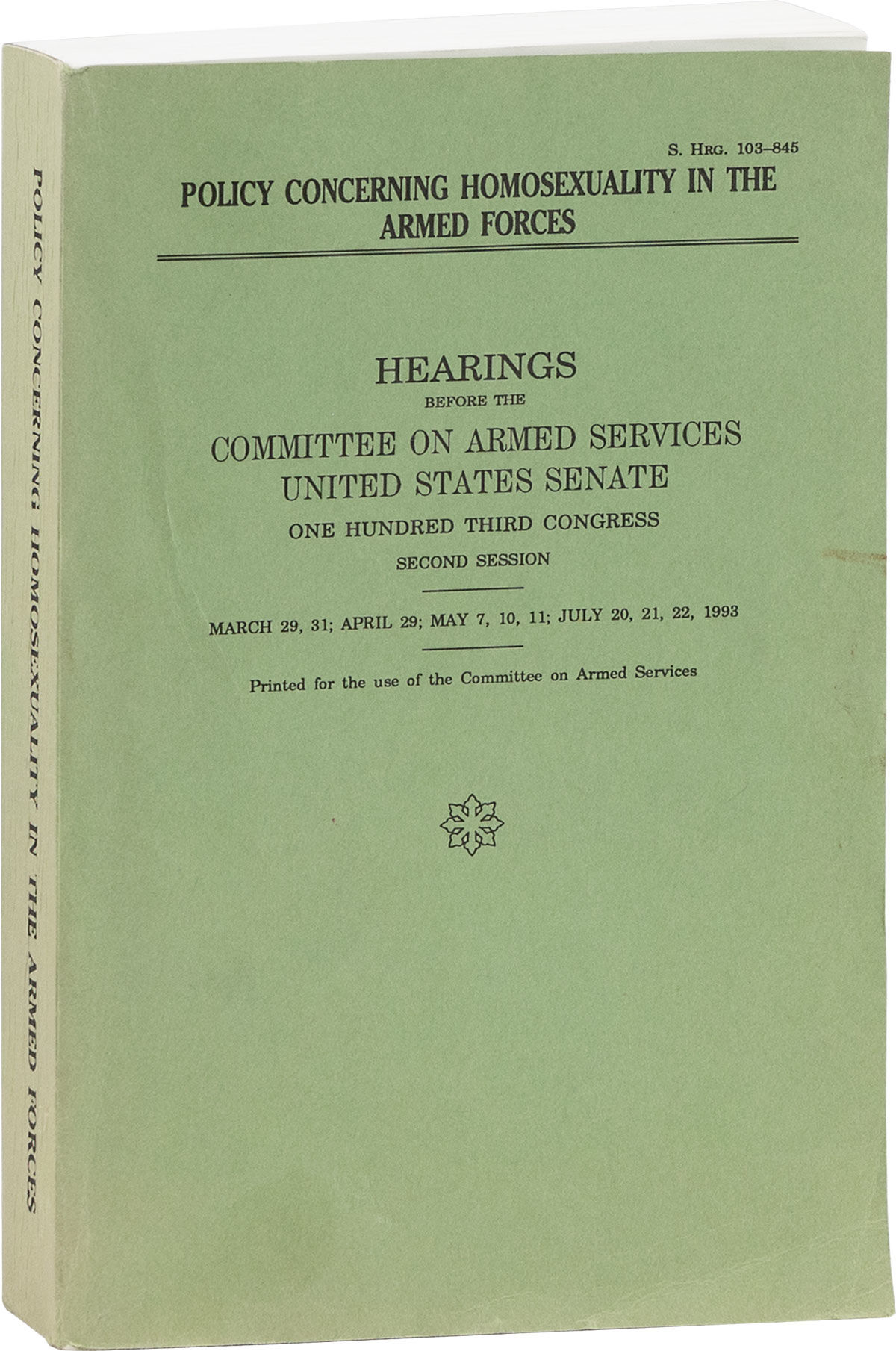 Washington, DC: US Government Printng Office, 1994. First Edition. Octavo. 23cm. Original printed green card wraps titled in black to spine panel and front wrap. 1075pp. Some light creasing to corners, and some very slight sunning to the spine panel, a very good, strong, clean copy. Internally clean. The report and findings of the Committee on Armed Services under the Clinton Administration that produced the infamous "Don't Ask, Don't Tell" policy.