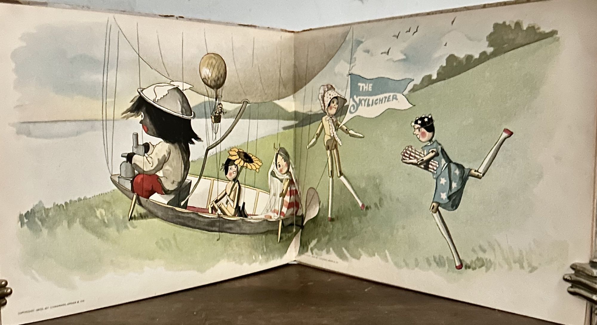 New York, London & Bombay: Longmans, Green & Co, 1902. First edition. Hardcover. Orig. illustrated boards, beige cloth spine. Very good. Upton, Florence. 64 pages. 22 x 28 cm. Clean, fresh copy with full color plates and small line drawings printed in brown on the text pages. Sarah Jane, Meg, Peg & Midget, are 4 wooden dolls who begin an exciting adventure when they build an Airship and take flight. Upton's book and its many sequels were extremely successful in England, largely because of the popularity of the Golliwogg. Wear to corners and spine head and foot, decorated endpapers. Some light cover smudges.