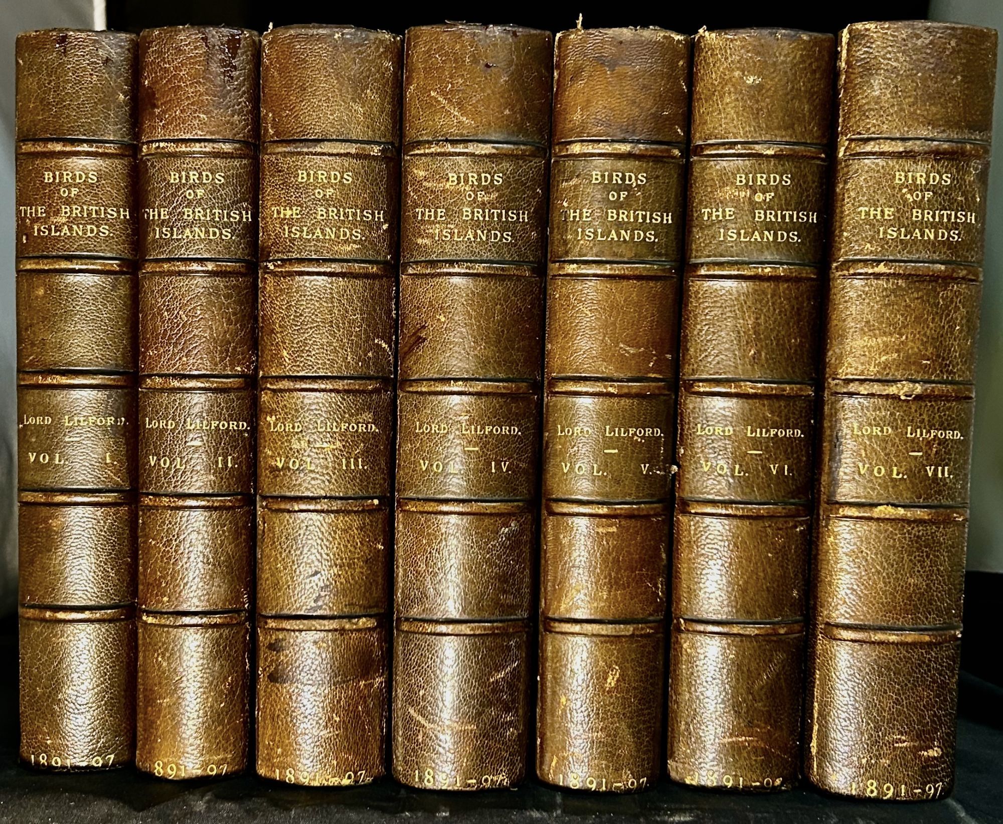 London: R.H. Porter, 1897. Second edition. Hardcover. Three quarter brown morocco, marbled endpapers and matching marbled endpapers. 7 Vols. Very good. 25.5 x 18 cm. All plates printed recto or verso only. The first edition was originally issued in parts beginning in October 1885 and ran through January 1898; the second edition, issued in 36 parts, began in 1891. By issue 28, the two editions were appearing simultaneously. Most parts of the second edition are the same as the first, except parts 7-17, which were reprinted with some changes, including the plates for eight birds. The first edition was limited to 550 copies, the second to 450. Chromolithography was at the apex of its development when Thorburn received this, his first major, commission. While Thorburn's plates are printed in color, many of Keuleman's plates continued to be colored by hand. List of subscribers, photogravure portrait frontispiece, 421 chromolothographed or hand-coloured lithographed plates, mainly after Archibald Thorburn and J. G. Keulemans, COPENHAGEN./ANKER. 308. FINE BIRD BOOKS. 9. McGILL/WOOD. 436. MULLINS & SWANN 354. NISSEN IVB 563. Some scattered foxing, mostly marginal. Rubbing to extremities. Raised bands, spine panels lettered in gilt.