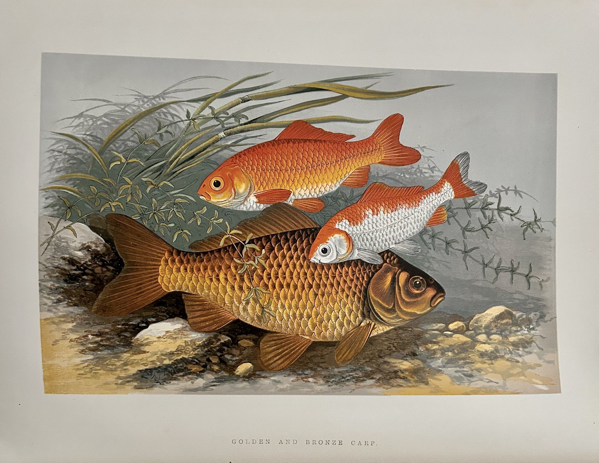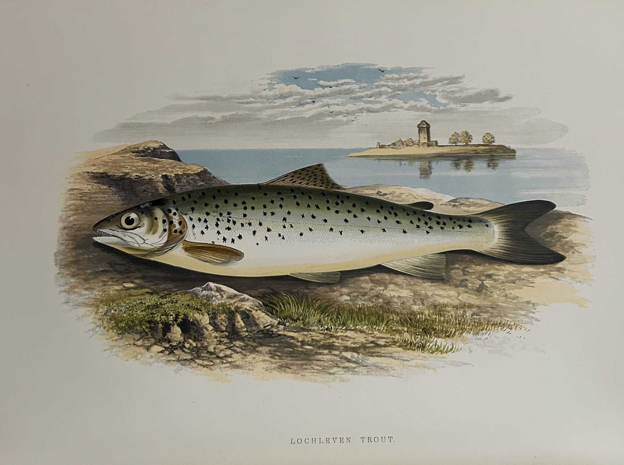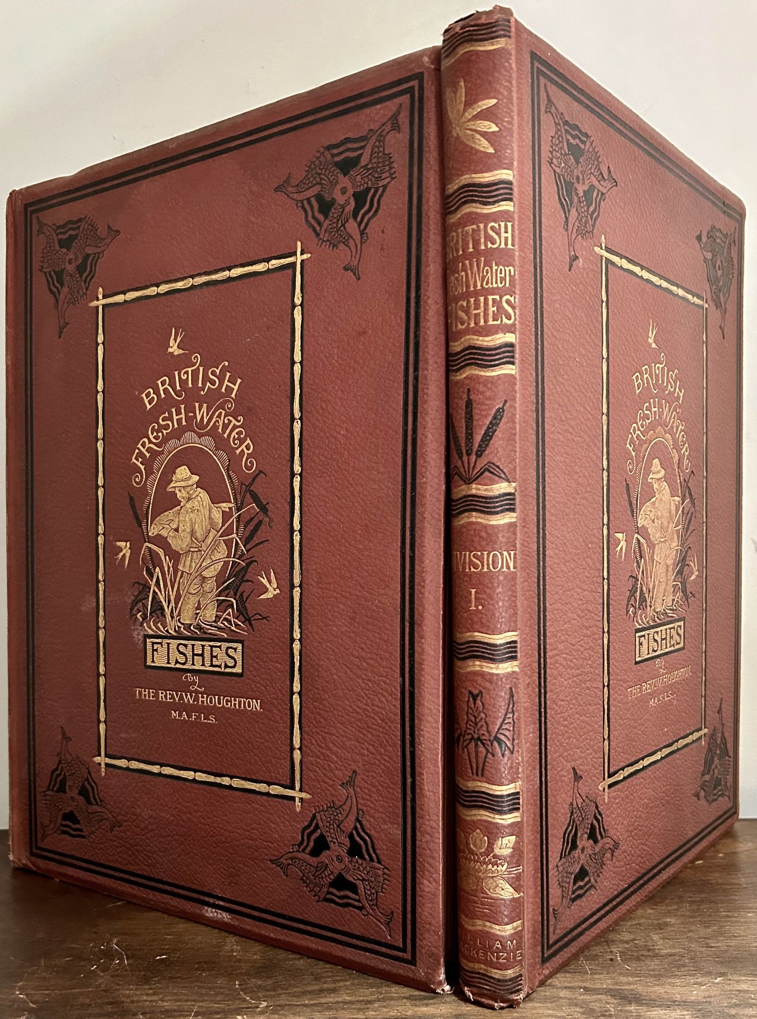 London: William Mackenzie, 1879. First edition. Hardcover. Light brown cloth lettered and decorated in gilt with backstrip also similarly detailed. Near Fine. 2 Vols.. 204 pages. Folio, 36.7 x 27 cm. illustrated with 41 fine chromoxylographed plates of fish engraved by Benjamin Fawcett after drawings by A.F. Lydon, and numerous steel-engraved plates of angling locales. Houghton, a Shropshire clergyman, aimed his book at the fisherman rather than the naturalist, and the text (of which there is, unusually, plenty) gives information about recognition, feeding and breeding habits, habitat, bait and so on. BUCHANAN, NATURE INTO ART. 168. Alexander Francis Lydon's plates, which were printed by Benjamin Fawcett, show each fish in what is meant to be its natural habitat. For this work, Houghton studied the specimens in the collection of the British Museum. British Fresh-Water Fishes is notable for its incorporation of the naturalistic backgrounds of the fish habitats. Index.