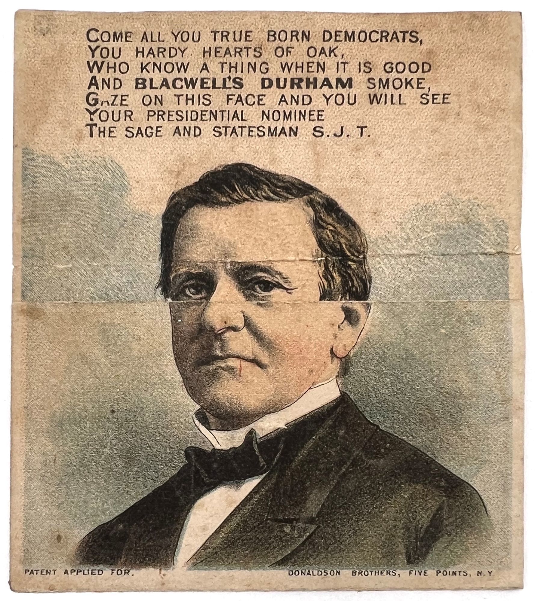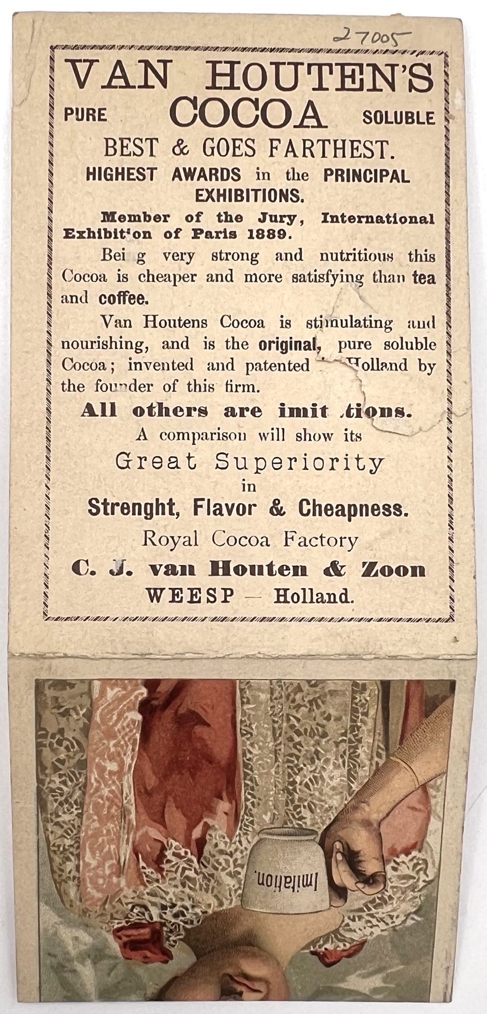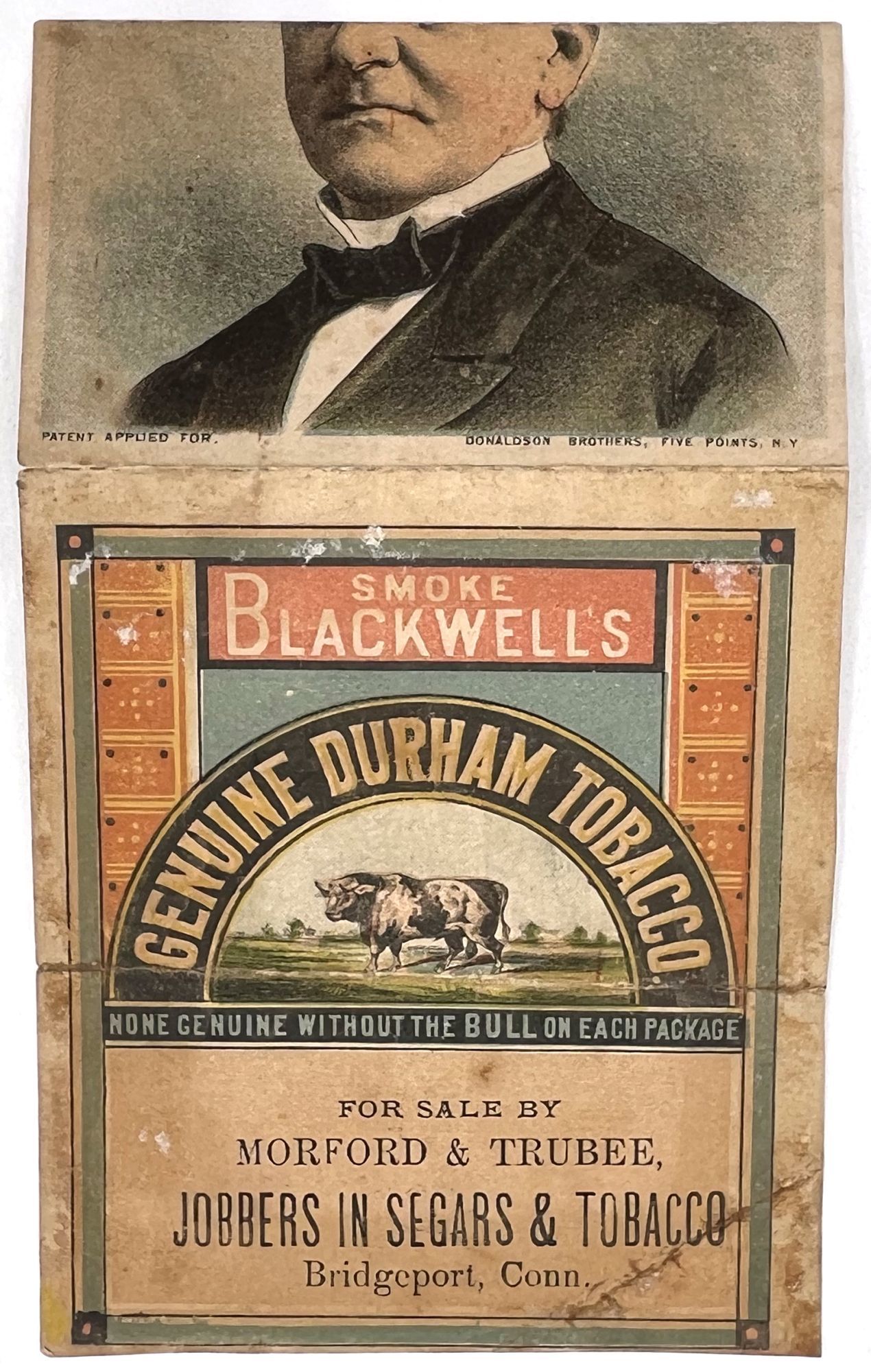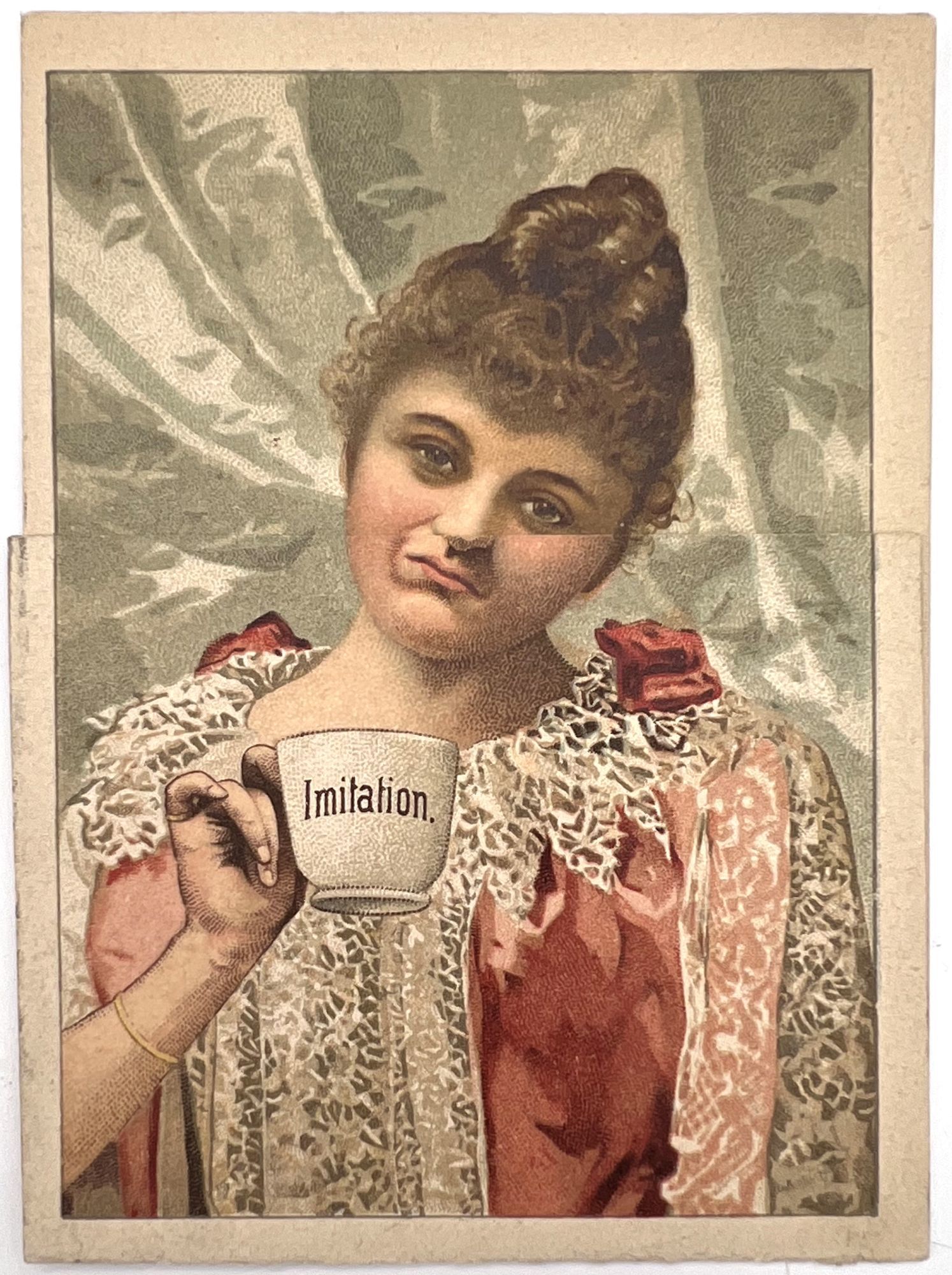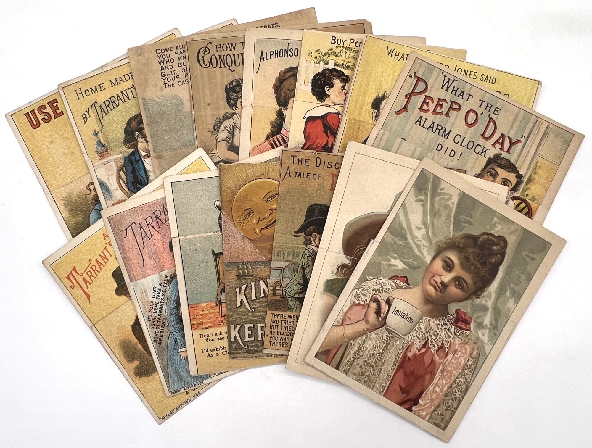 New York, New York: Donaldson Bros, 1880. Very good. Toned with some dust soiling. One larger tear to a corner of the Kinslow Kerosene oil lamp transformation. A couple modern tape repairs.. A nice grouping of fifteen (15) humorous 1880s advertising transformations. A fun example of "paper with a secret", advertising transformations were common ways to market products to the public, and usually used a folded flap of paper to "transform" an image and make a punch line. For example, a young woman frowns, until the flap is lifted to reveal her pretty smile with the caption "Use Tarrant's Seltzer Aperient ... The Faithful Friend to Suffering Women". Each is chromolithographed and measures approx. 3.5" by 3.5" folded, and 5.25" by 3.25" unfolded. Most with jokes or humorous rhymes. Most, if not all, produced by Donaldson Bros. of New York. Common themes in the humor include gender roles, domestic living, and politics.