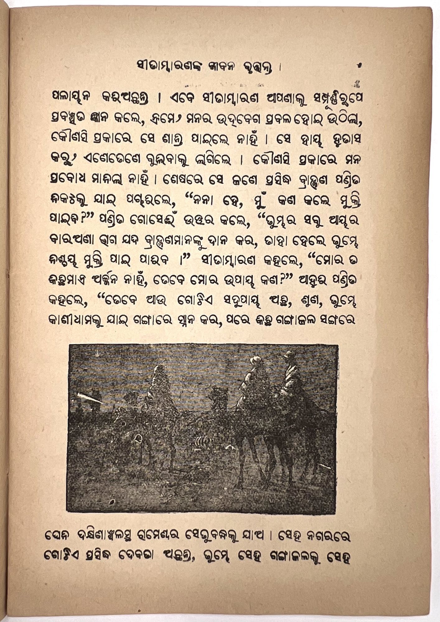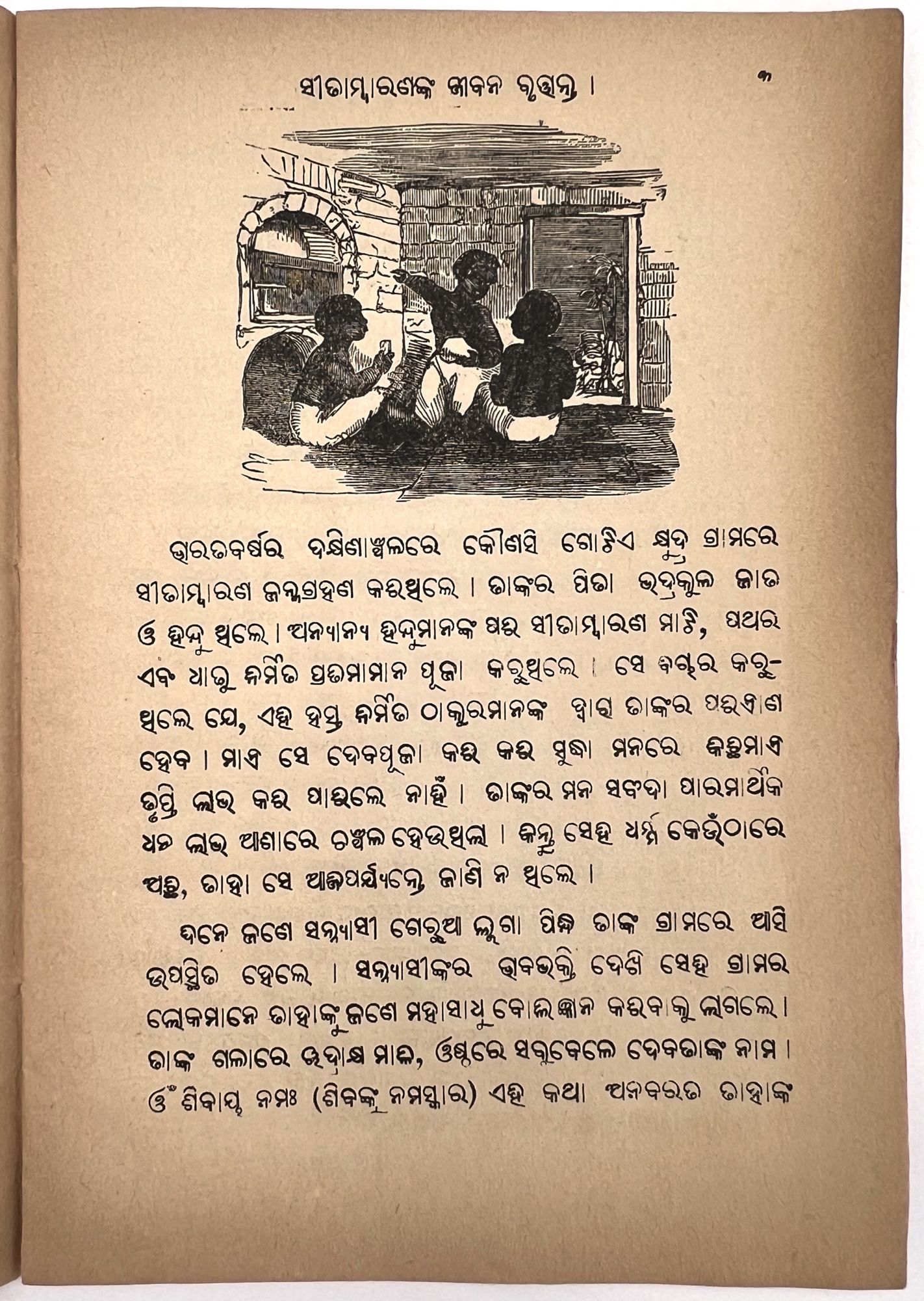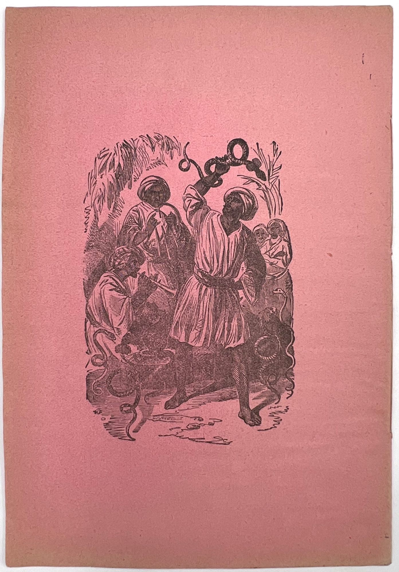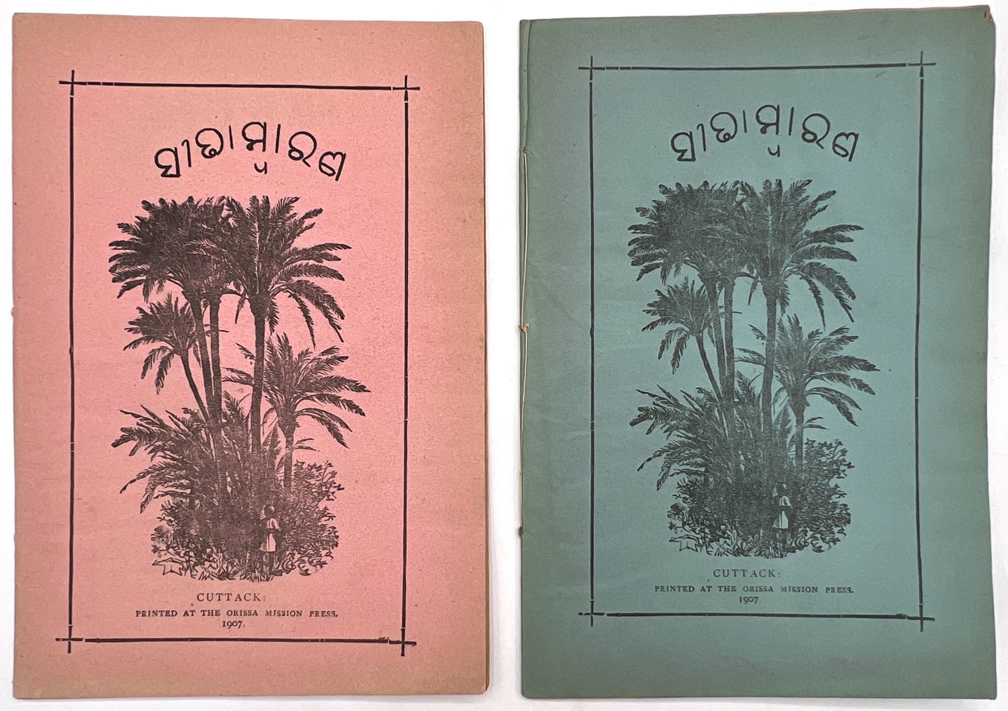 Cuttack, Odisha, India: Orissa Mission Press, 1907. Very good. Toned, water staining.. Two (2) copies of a scarce ephemeral missionary publication by the Orissa Mission Press, one in blue wrappers, the other in pink. They are printed in Odia, the official language of the Indian state of Odisha (formerly "Orissa"). The Orissa Mission Press was established in 1838 when British missionary Charles Lacey brought a printing press to Cuttack, and began printing textbooks in vernacular languages for the local population. It soon began printing tracts, gospels, and scriptures as a part of its religious mission. It would become seminal in the Oriya Language Movement. This publication's aim was to educate Odisha locals in Christianity, and appears to combine local history and lore with Christian ideology and Bible stories. It is illustrated, including a large image of a snake charmer on the lower wrapper. Upper wrapper has image of palm trees. Single vol. (6.75" by 4.75"), pp. [16], illus., in original illus. wrappers (blue or pink). No copies located in WorldCat as of June 2024.
