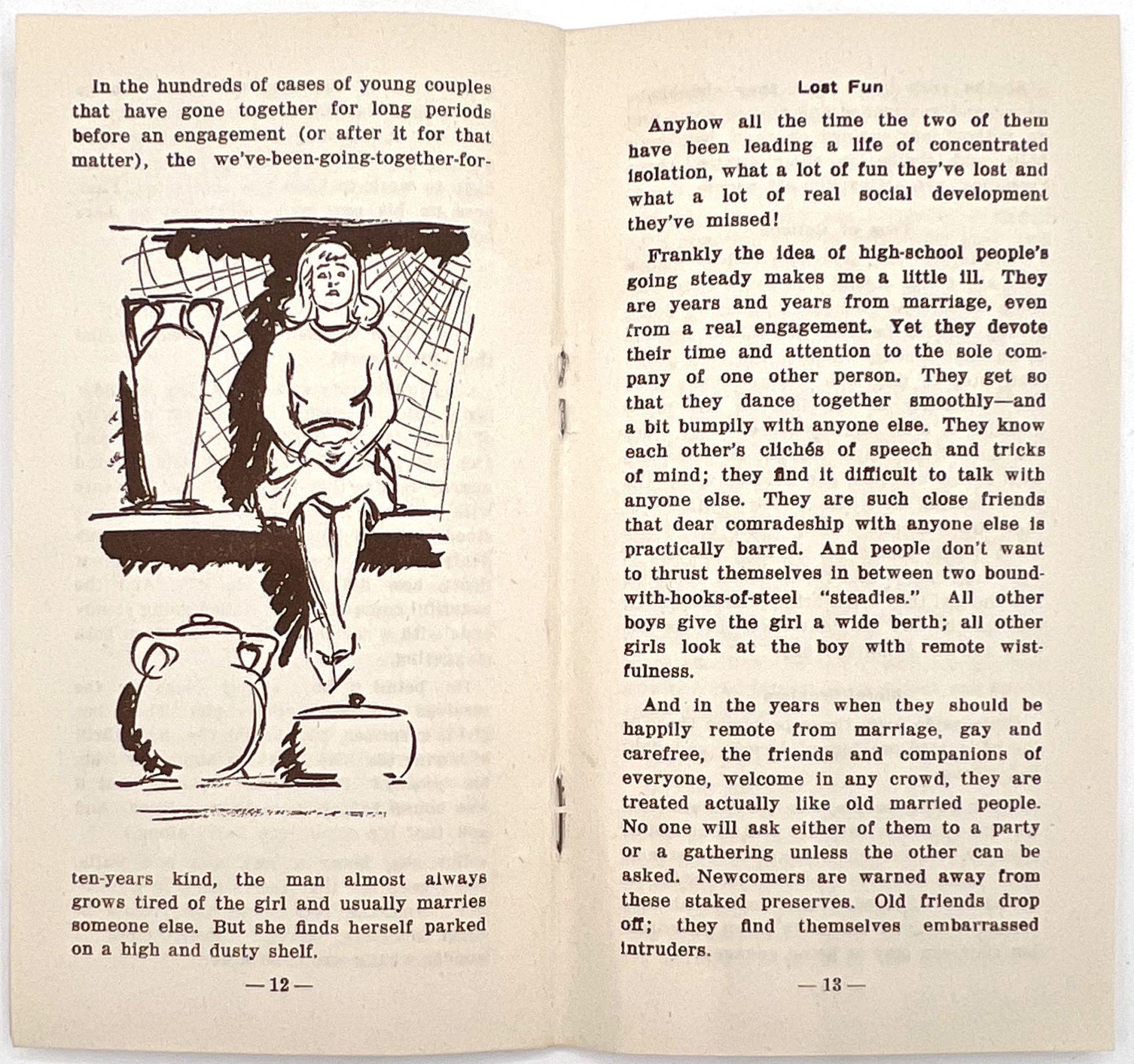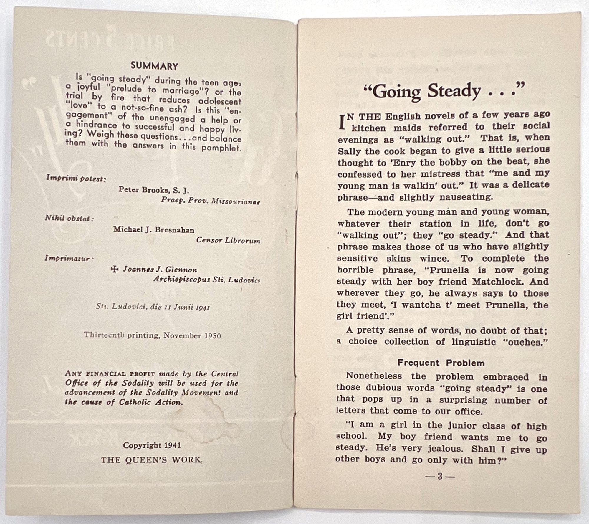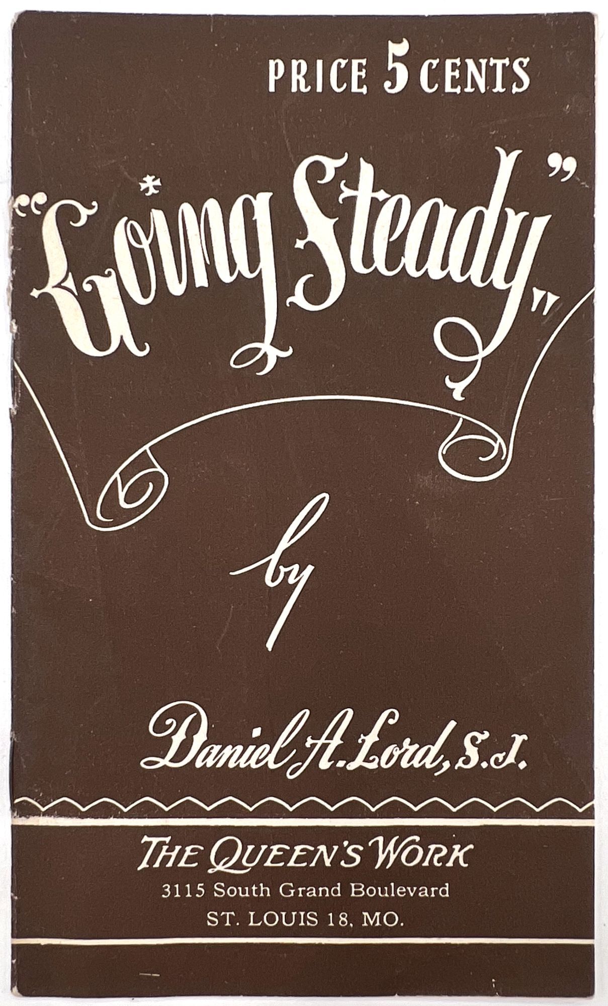 St. Louis, Missouri: The Queen's Work, Inc, 1950. Very good.. A guide to "Going Steady" for teens, penned by a Jesuit Priest in the interest of reinforcing Catholic morals in America's young people. The author does not hesitate to state his own personal opinion on the subject, as well: "Frankly the idea of high-school people going steady makes me a little ill" (p. 13). Warns against the related sins, especially for girls, noting that they may find themselves "soiled for the future" (p. 15). An entertaining (disturbing?) look for modern readers into expectations for Catholic teens c.1941. Single vol. (6" by 3.25"), pp. 20, [2], illus., original printed wrps. Thirteenth printing. "The Queen's Work was founded by Jesuits of the Missouri Province, specifically at the bequest of Jesuit General Father, Francis Xavier Wernz, and the Missouri Province leadership in the persons of Alexander J. Burrowes and Edward Garesche, to provide 'a journal of national character "which would '[publish] articles of interest to all Catholics." (jesuitarchives.org).
