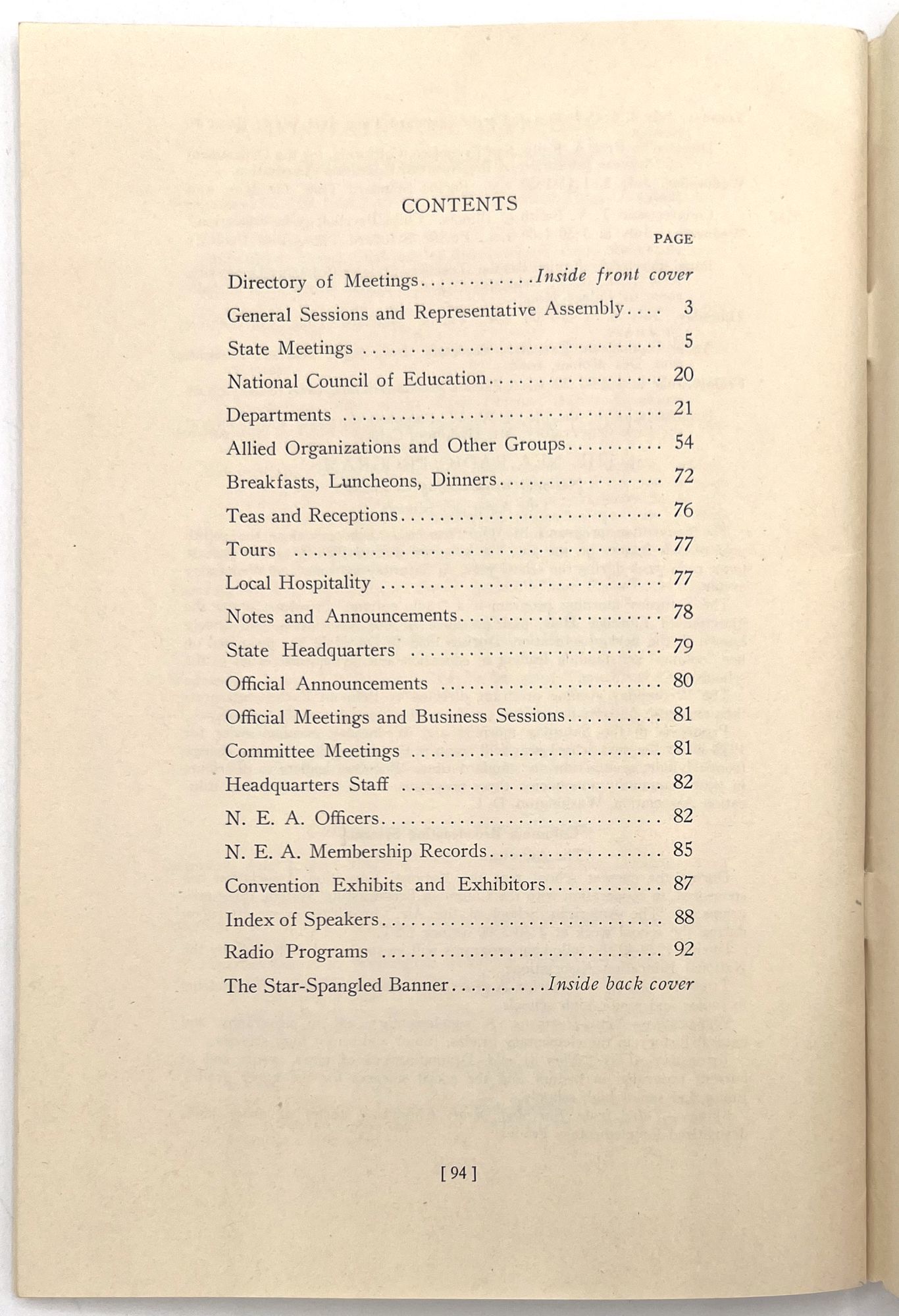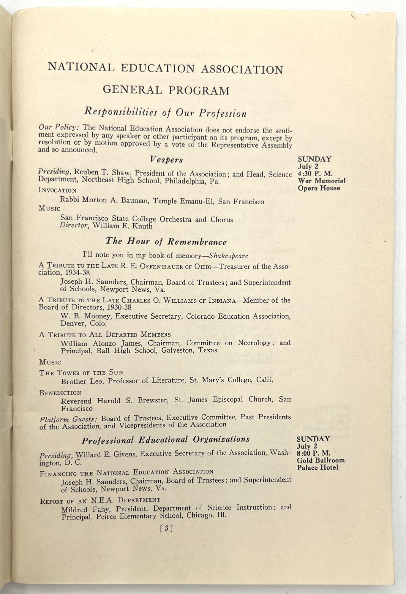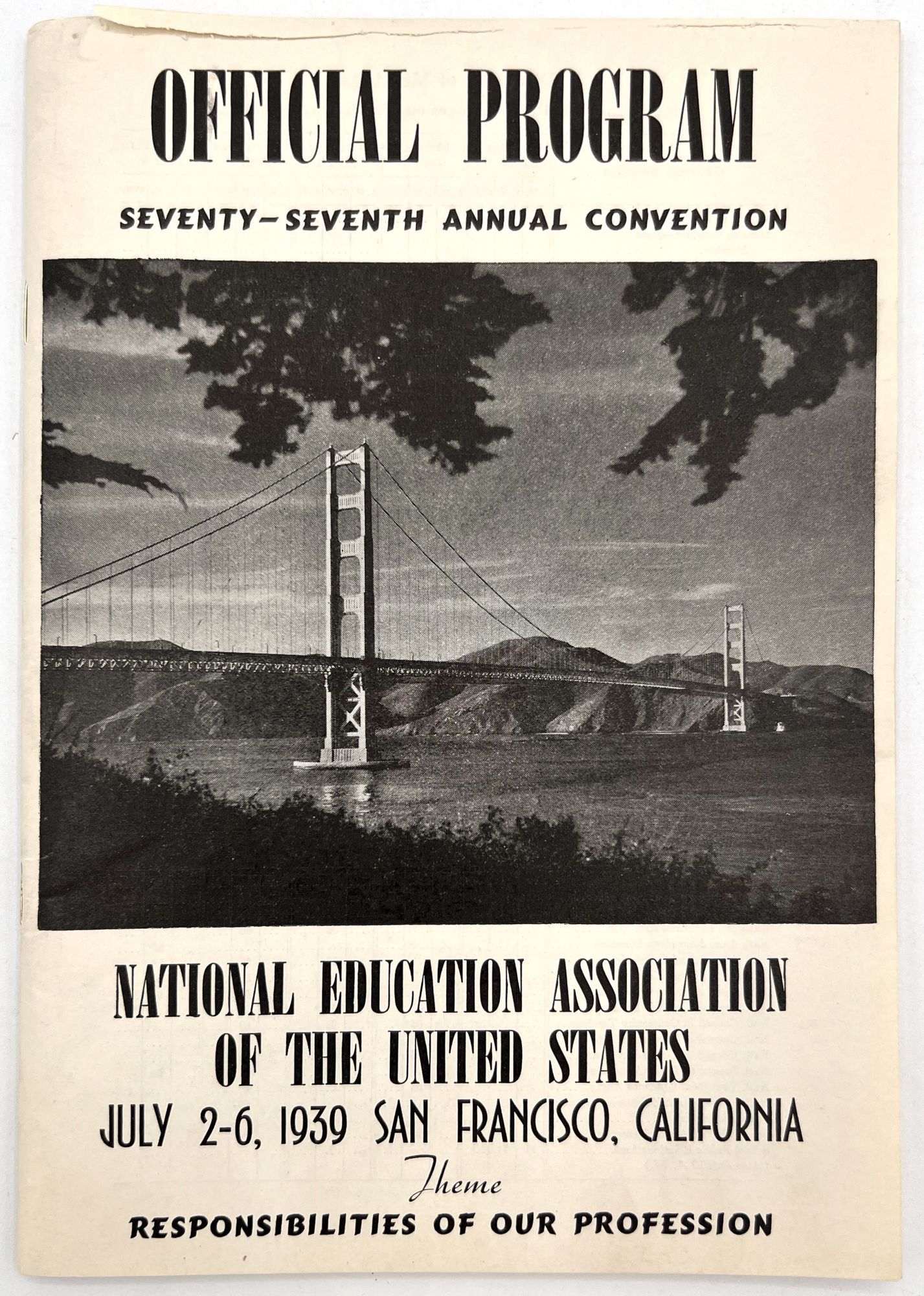 "Official Program". San Francisco: NEA, 1939. Single vol. (9" by 6"), pp. 96, in original self. wrps. with photo illus. of the Golden Gate Bridge on front. Complete program for the Seventy-Seventh Annual Convention of the Association, with directories, events, meetings, and a map of the city with meeting places highlighted.