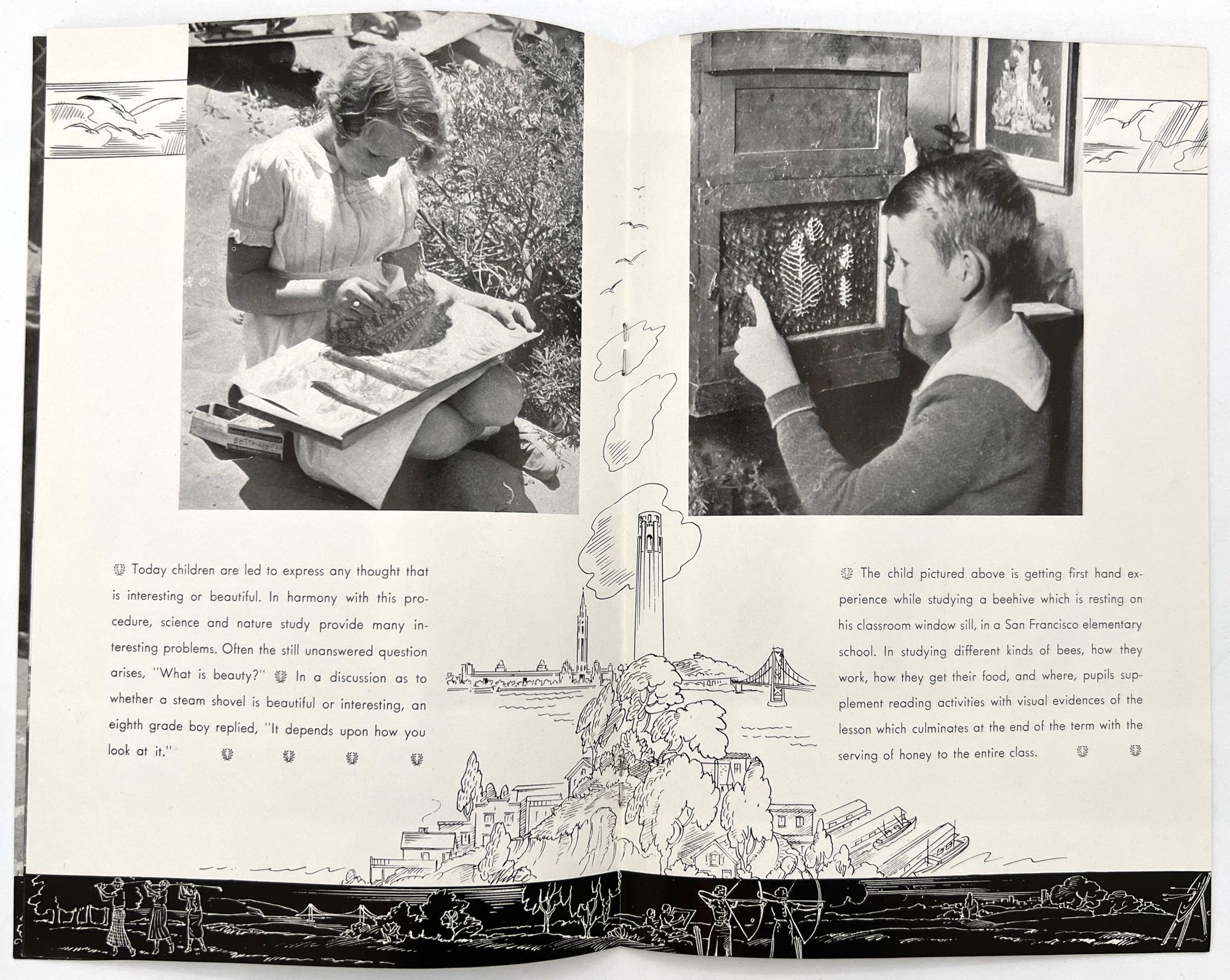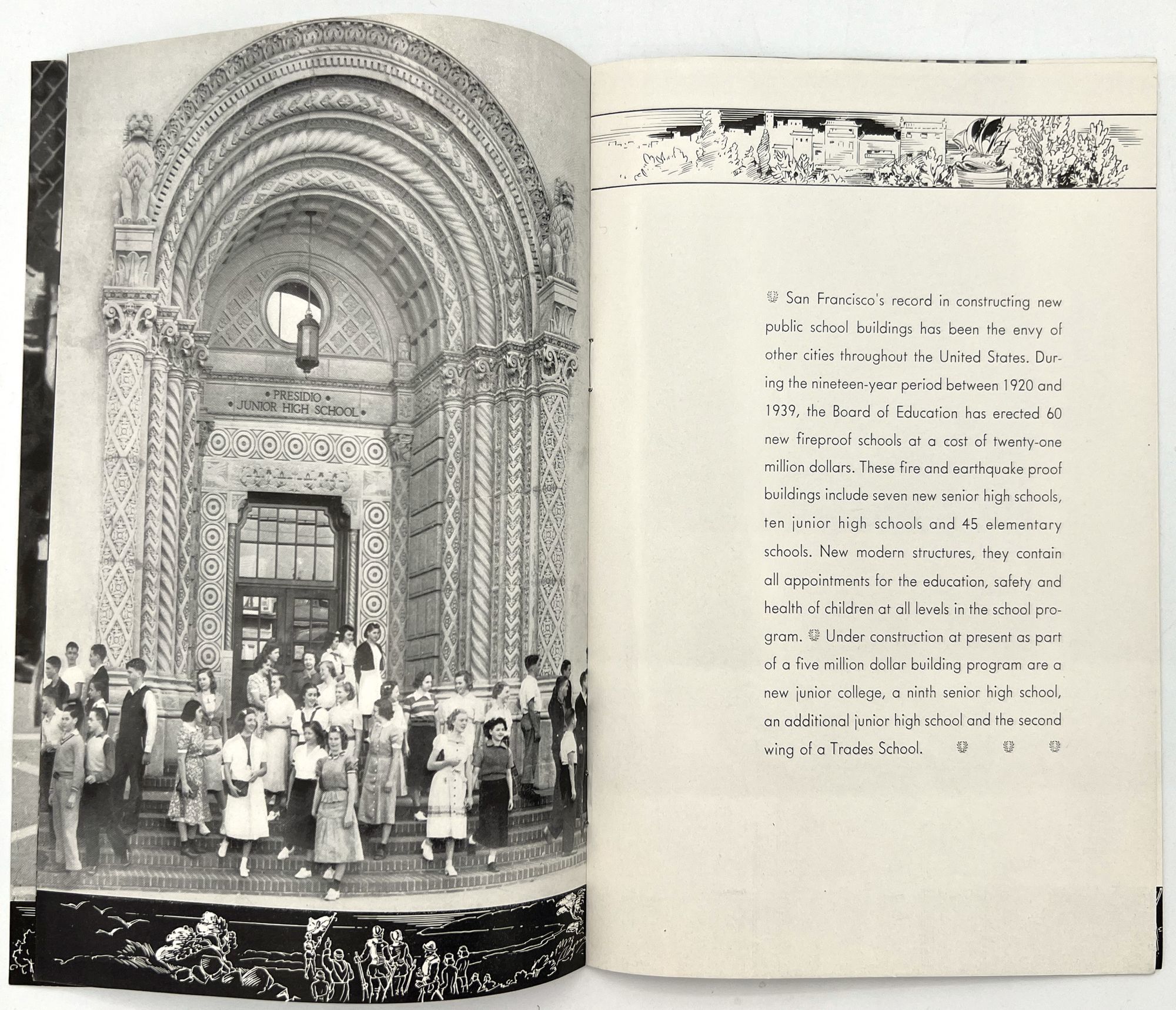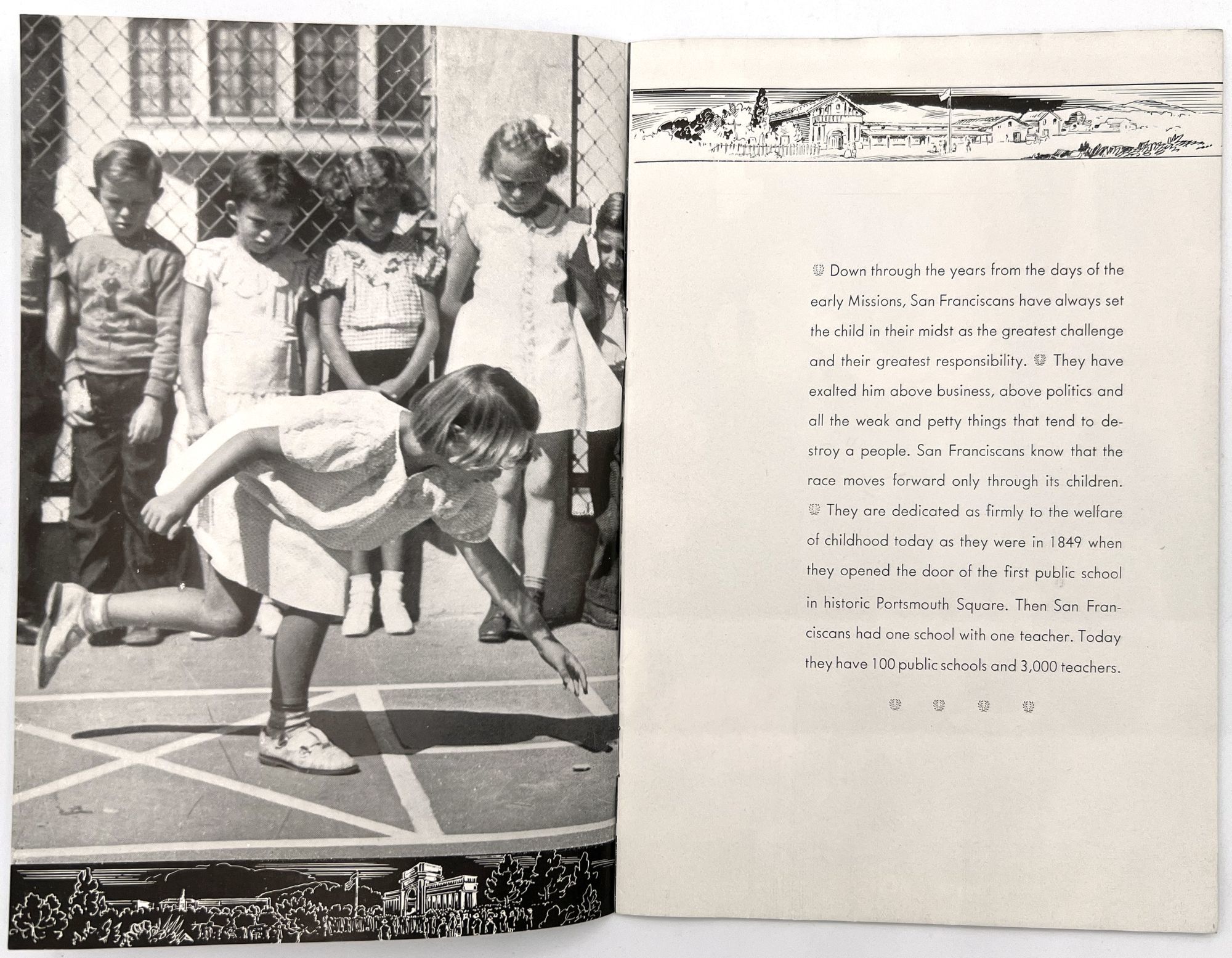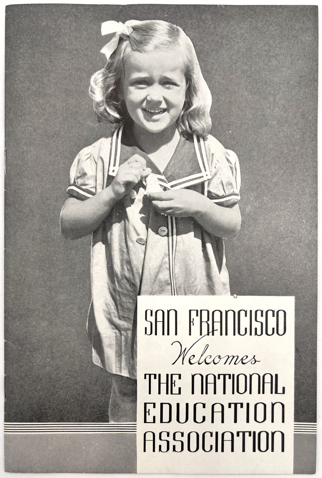 "San Francisco Welcomes the National Education Association". [San Francisco: San Francisco Public Schools, 1939]. Single vol. (9" by 6"), pp. [16], photo-illus., in original illus. self wrps with blonde girl on front. Prospectus from the local public school system welcoming the Association, and giving a brief overview of public education in the state.