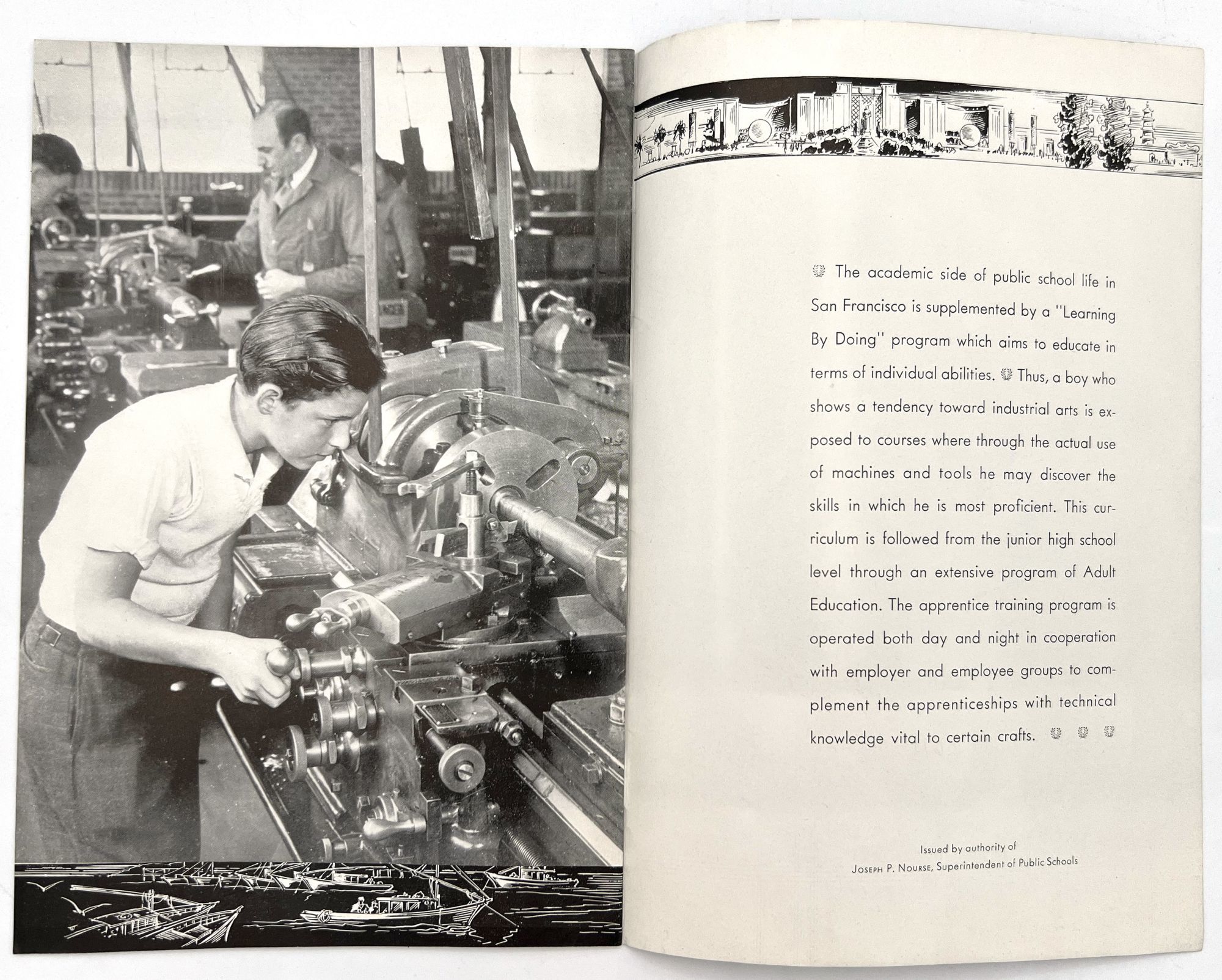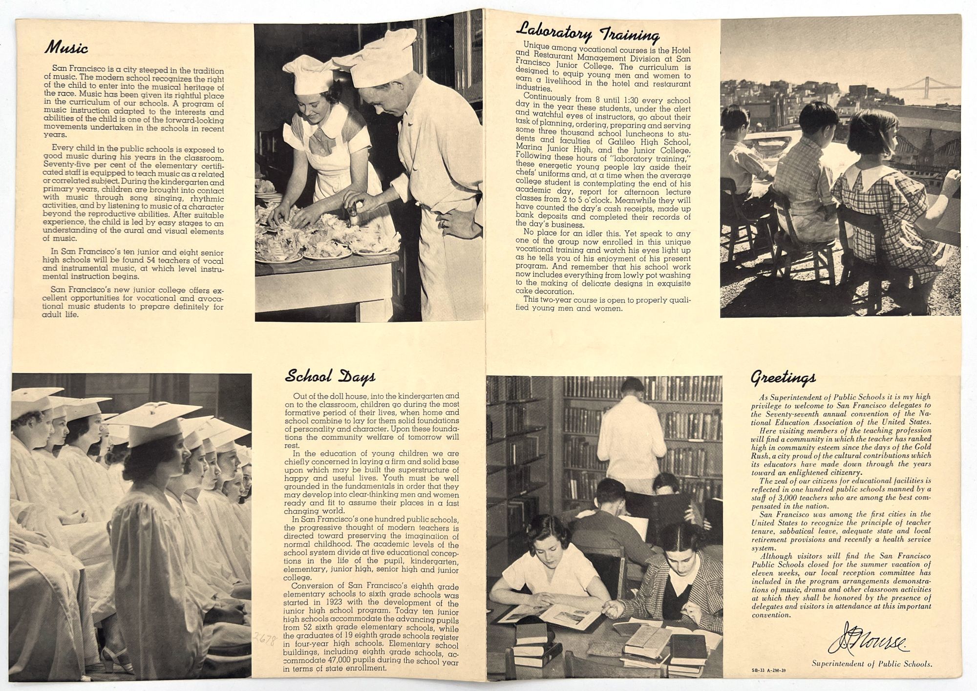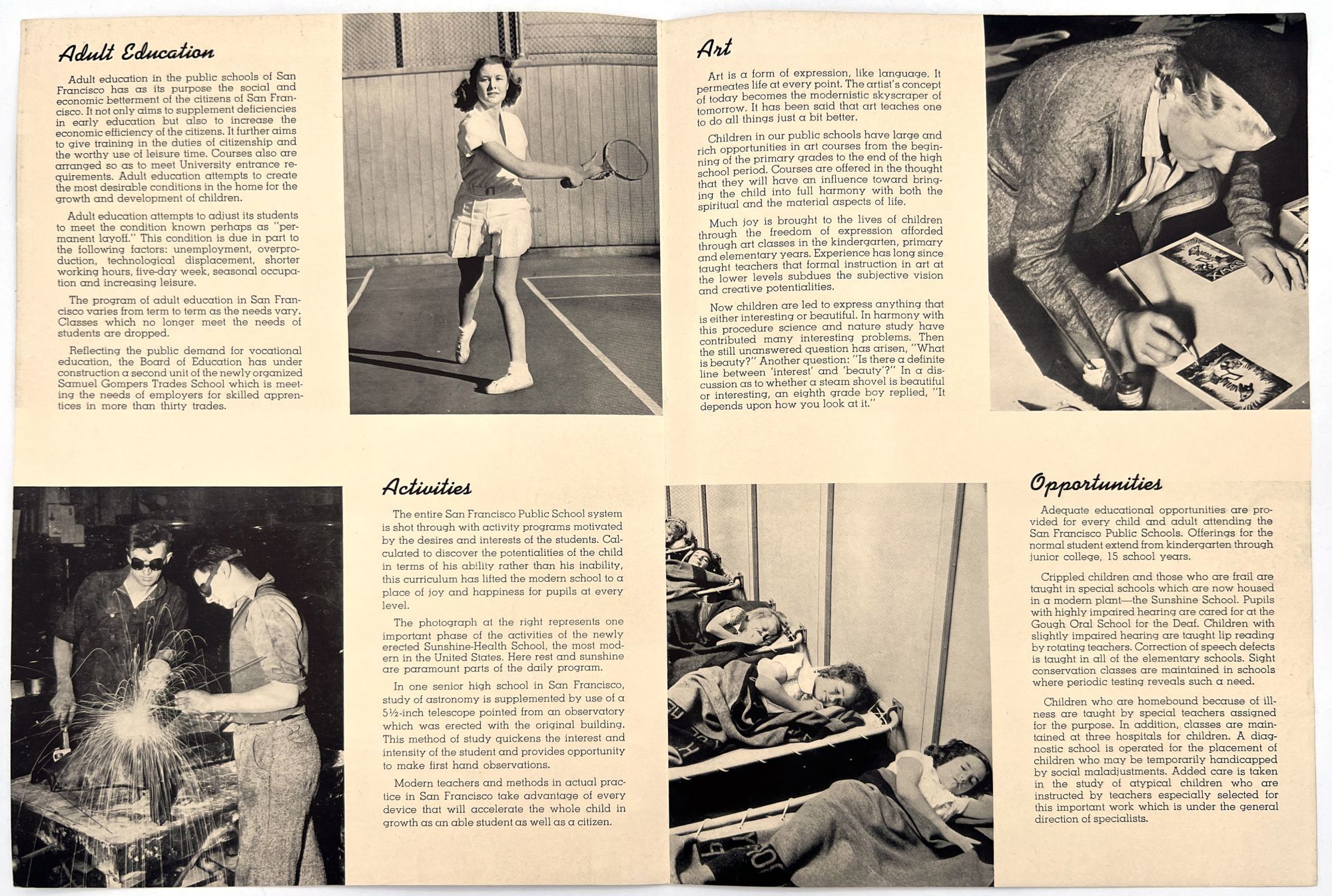 [Untitled flyer promoting San Francisco Public Schools. San Francisco, 1939]. Photo illlus. bifolium (11" by 8"). Promotional flyer for the public school system, touting its laboratory training, extra curriculars, and opportunities for special needs children.
