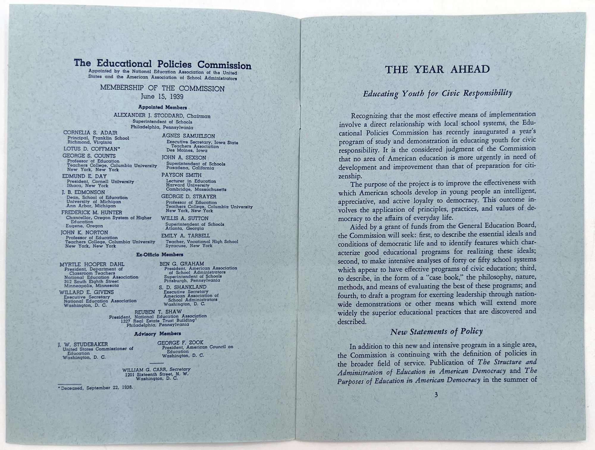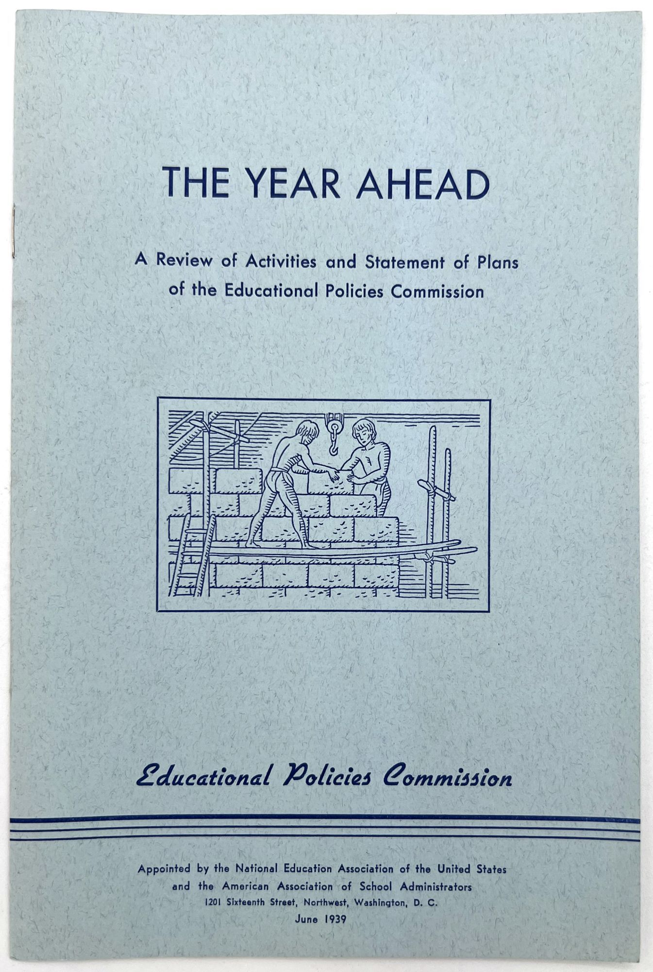 "The Year Ahead: A Review of Activities and Statement of Plans of the Educational Policies Commission". Washington, D.C.: Educational Policies Commission, 1939. Single vol. (9" by 6"), pp. 8, printed on blue paper, original self wrps. with illus. of ancient world construction workers on front. Offers overview of plans for a new project to push civic responsibility education in schools, and new statements of policy.