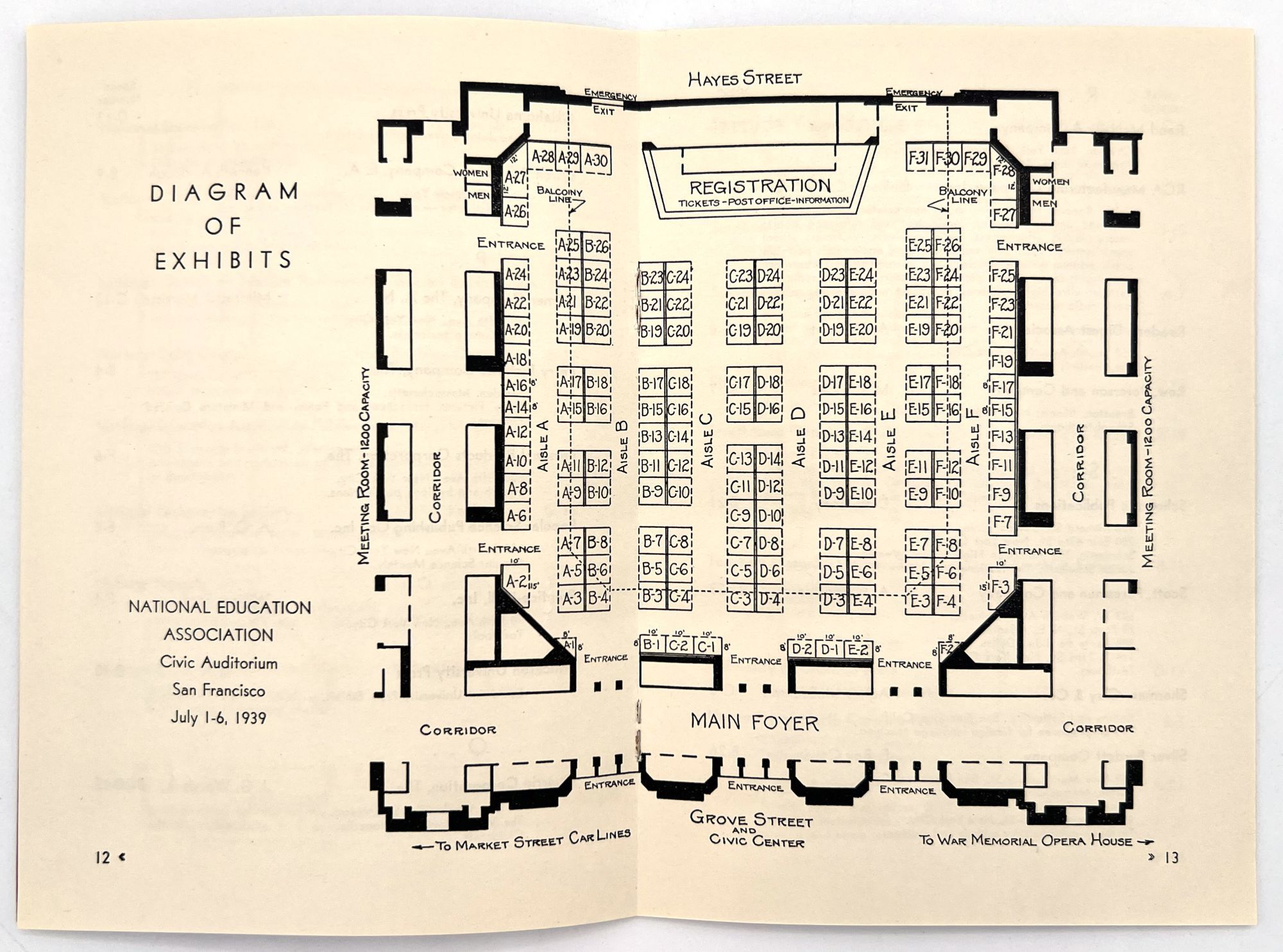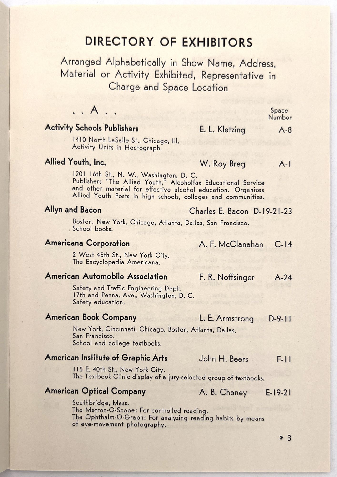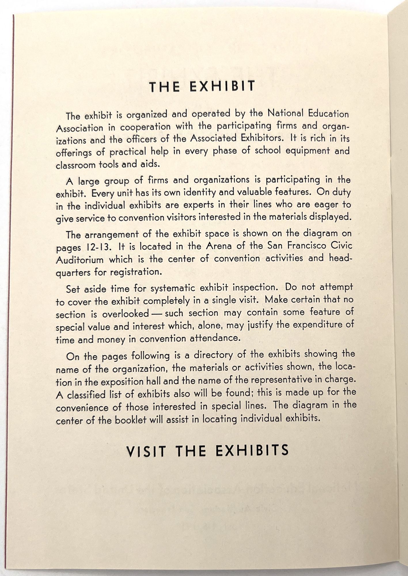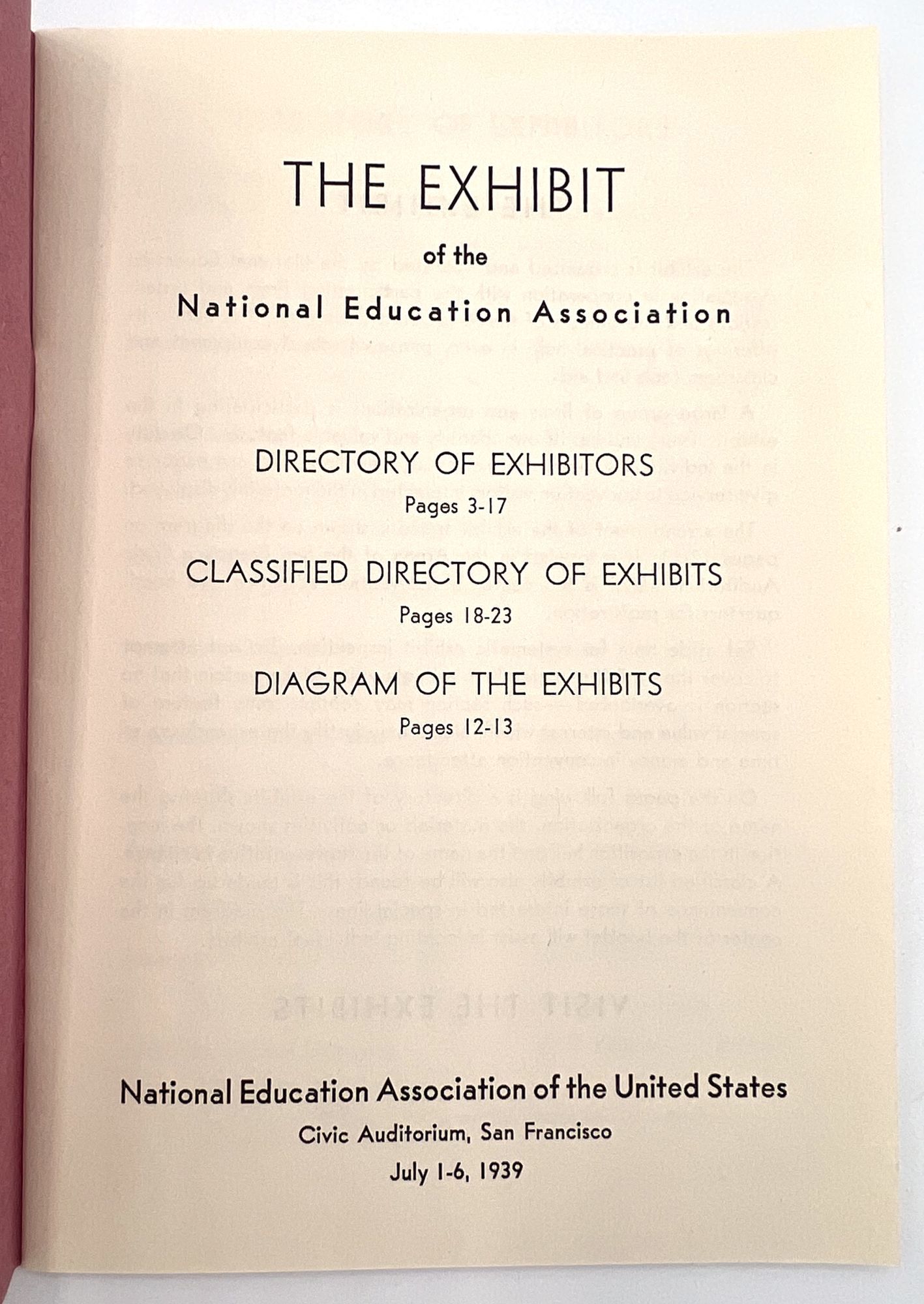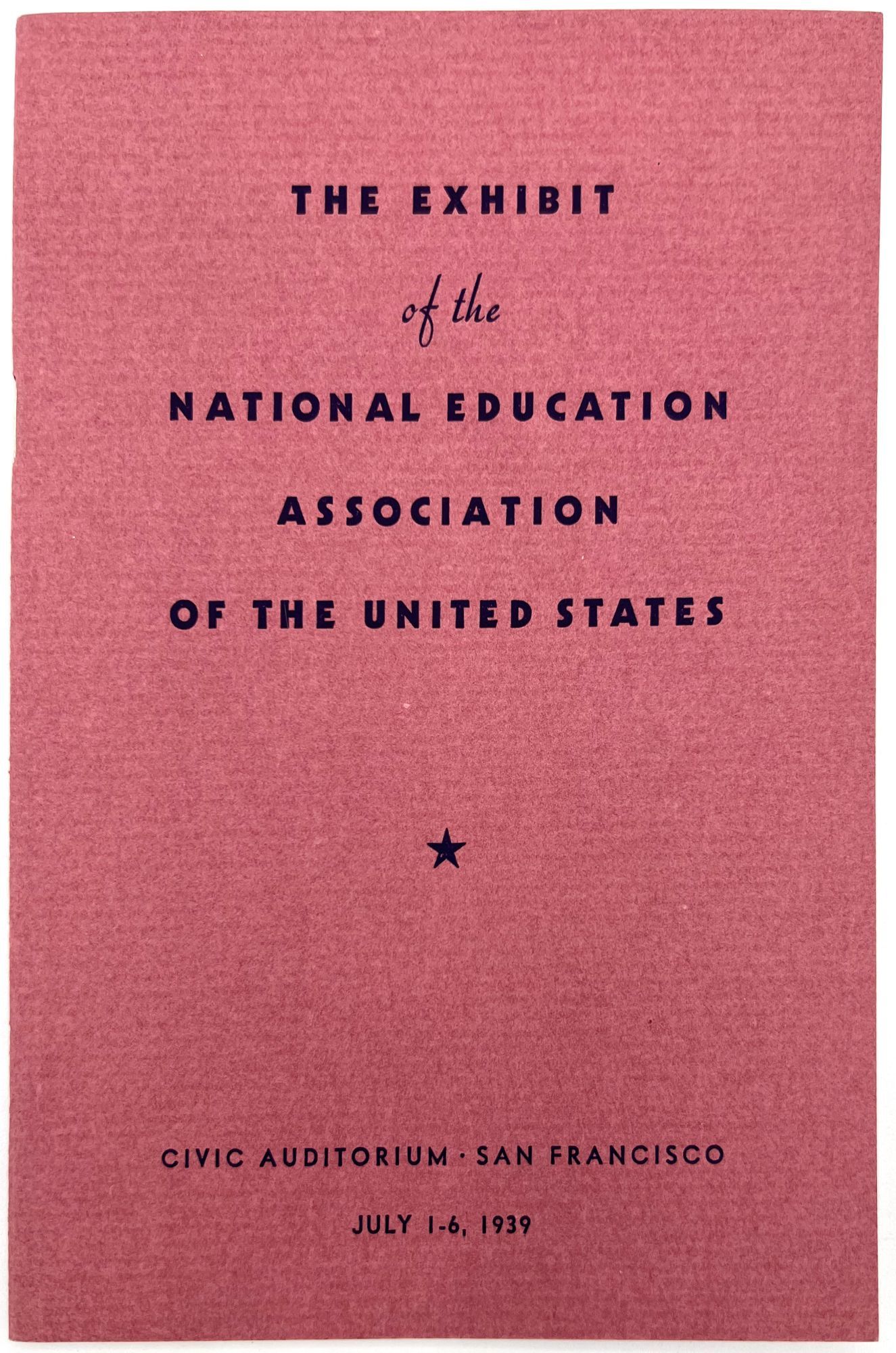 "The Exhibit of the National Education Association of the United States". San Francisco: NEA, 1939. Single vol. (7.5" by 5.5"), pp. 24, illus., in original printed dark pink wrps. A guide with floor map of the exhibitors at the NEA exhibition, held 1-6 July in the Civic Auditorium. Each company name listed with address, booth number, and lead representative.