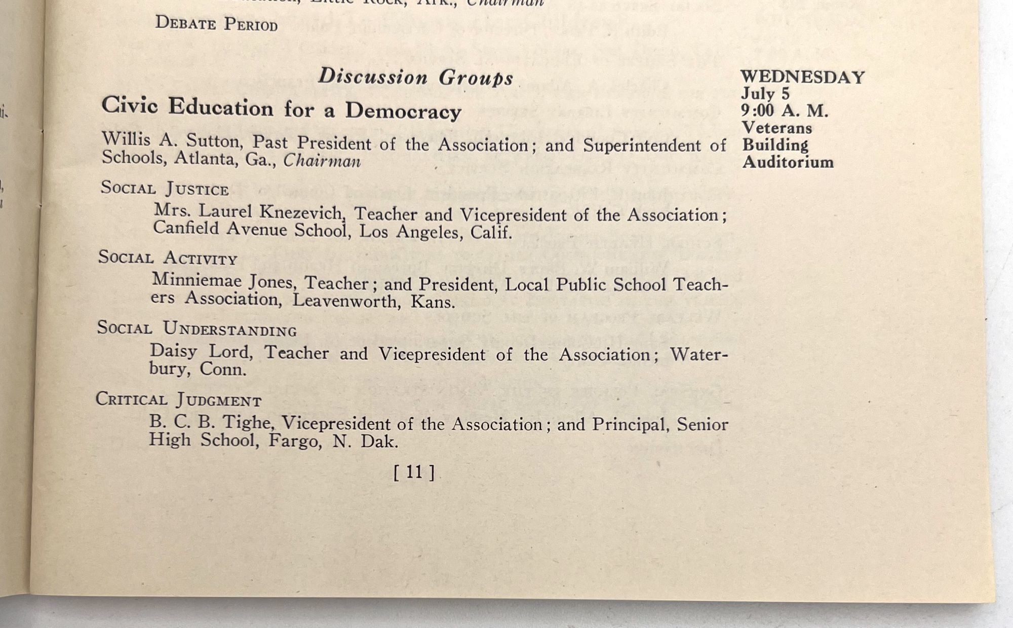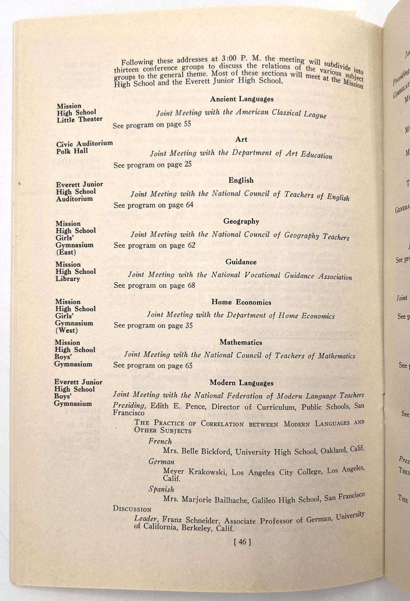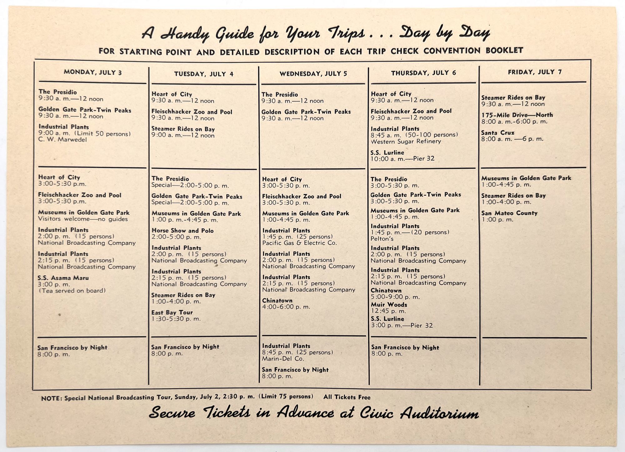 "A Handy Guide for Your Trips". San Francisco: NEA, 1939. Single printed leaf (7.75" by 10.5") with a schedule of field trips for attendees (e.g. visiting the local zoo, Golden Gate Park, etc.)