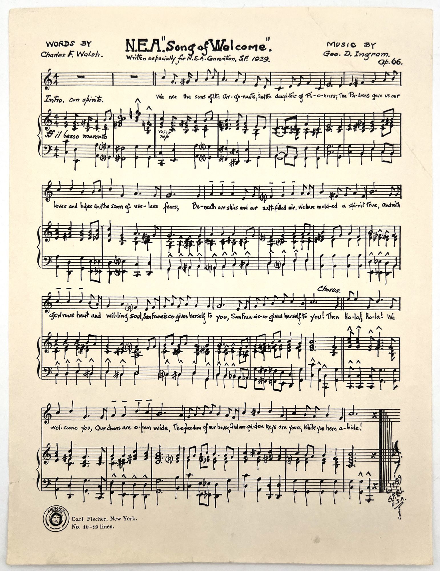 Ingram, Geo. D. "NEA Song of Welcome". San Francisco: NEA, 1939. Single printed leaf of sheet music (10.5" by 8.25") for attendees with lyrics welcoming them to the convention.