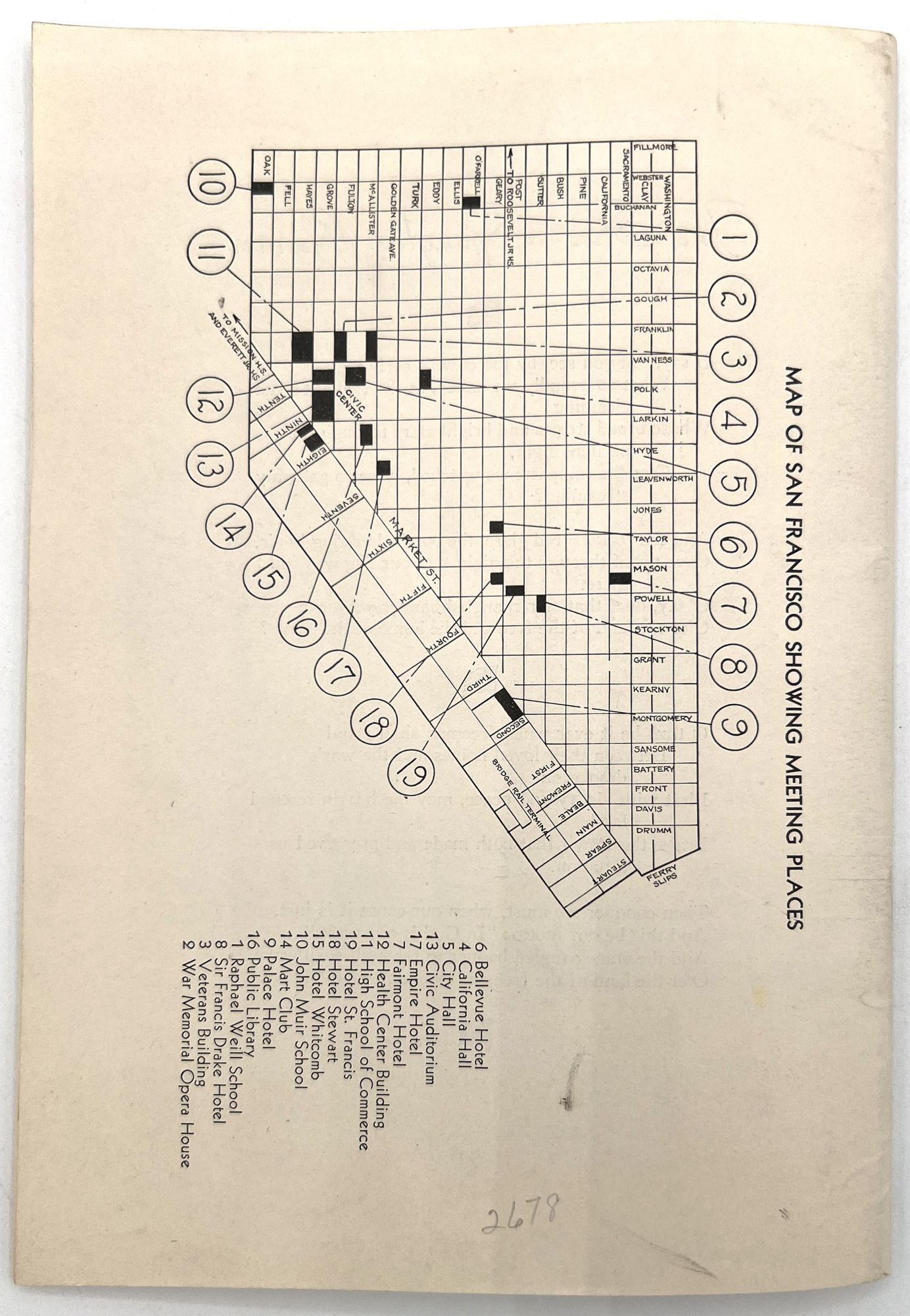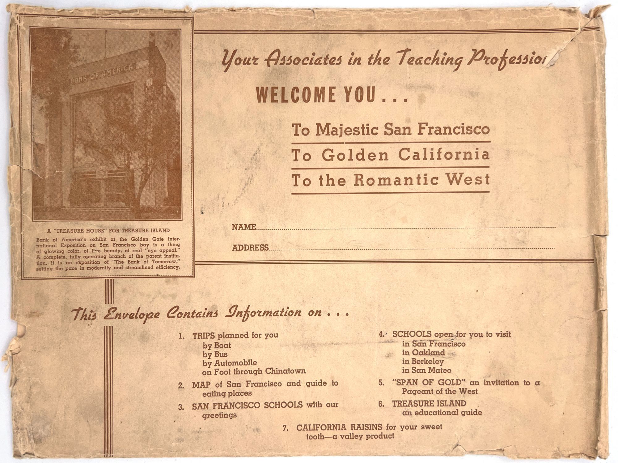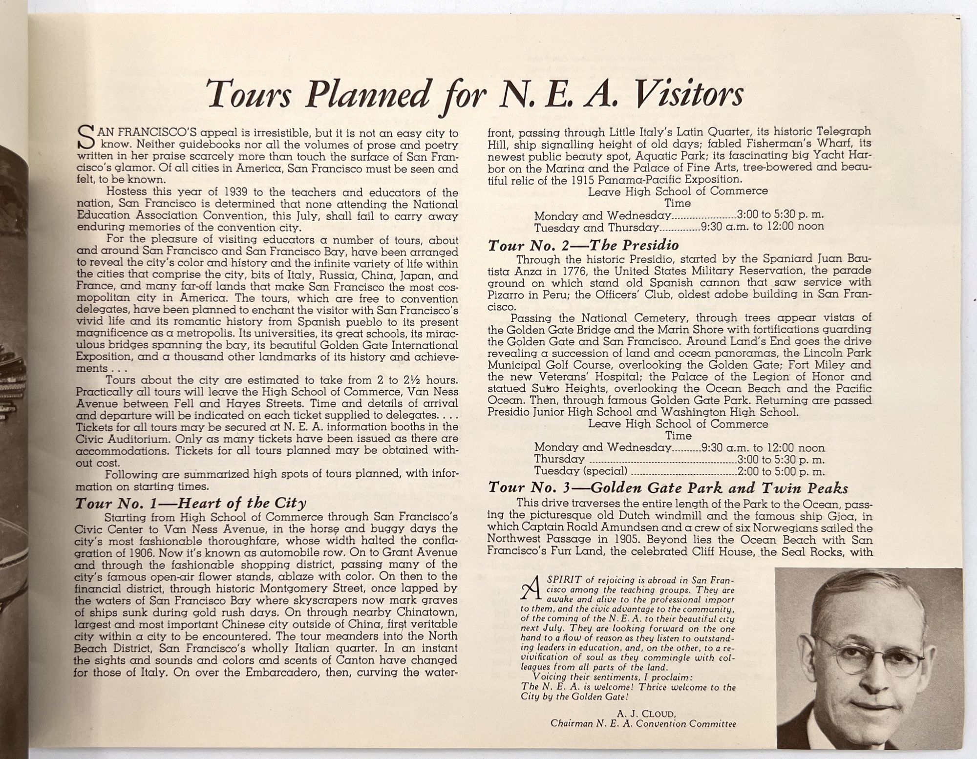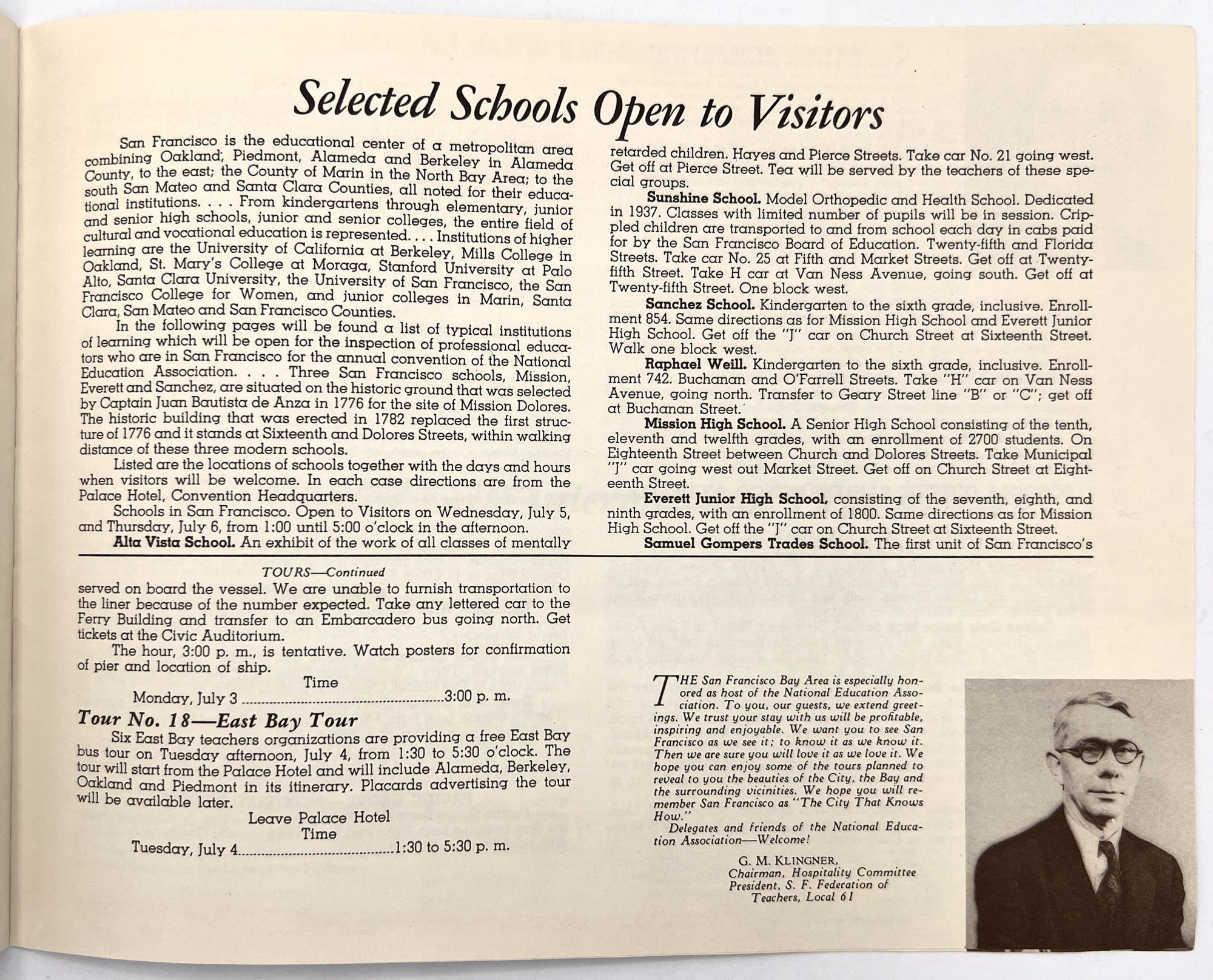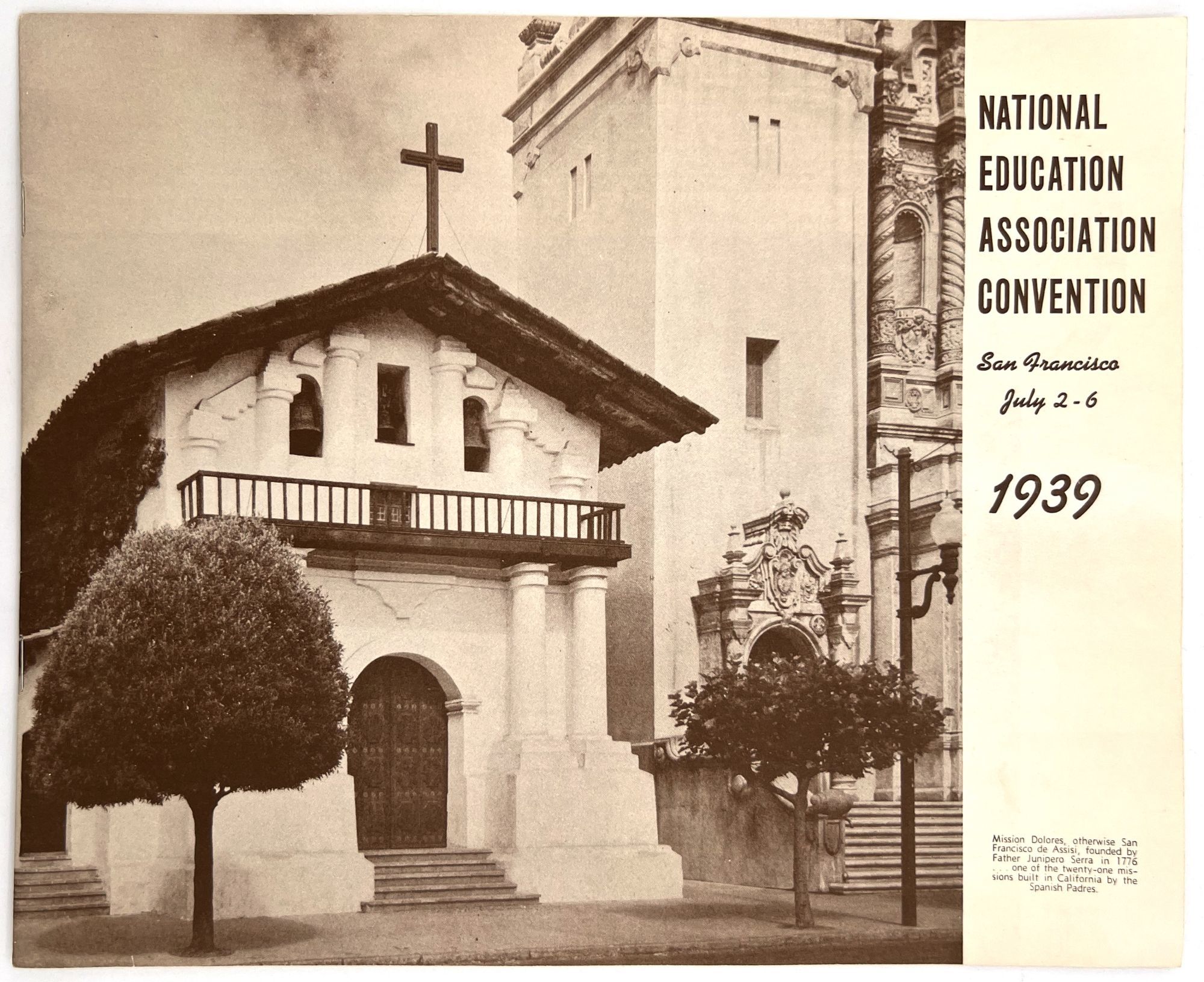 "[Tourism Brochure for the] National Education Association Convention". San Francisco: NEA, 1939. Single vol. (8.75" by 11"), pp. [16], illus., original illus. wrps with image of the Mission Dolores on the front. List of guided tours, open schools for the attendees to visit.
