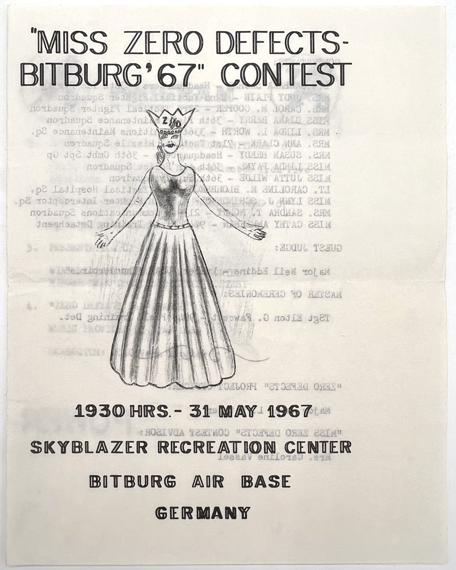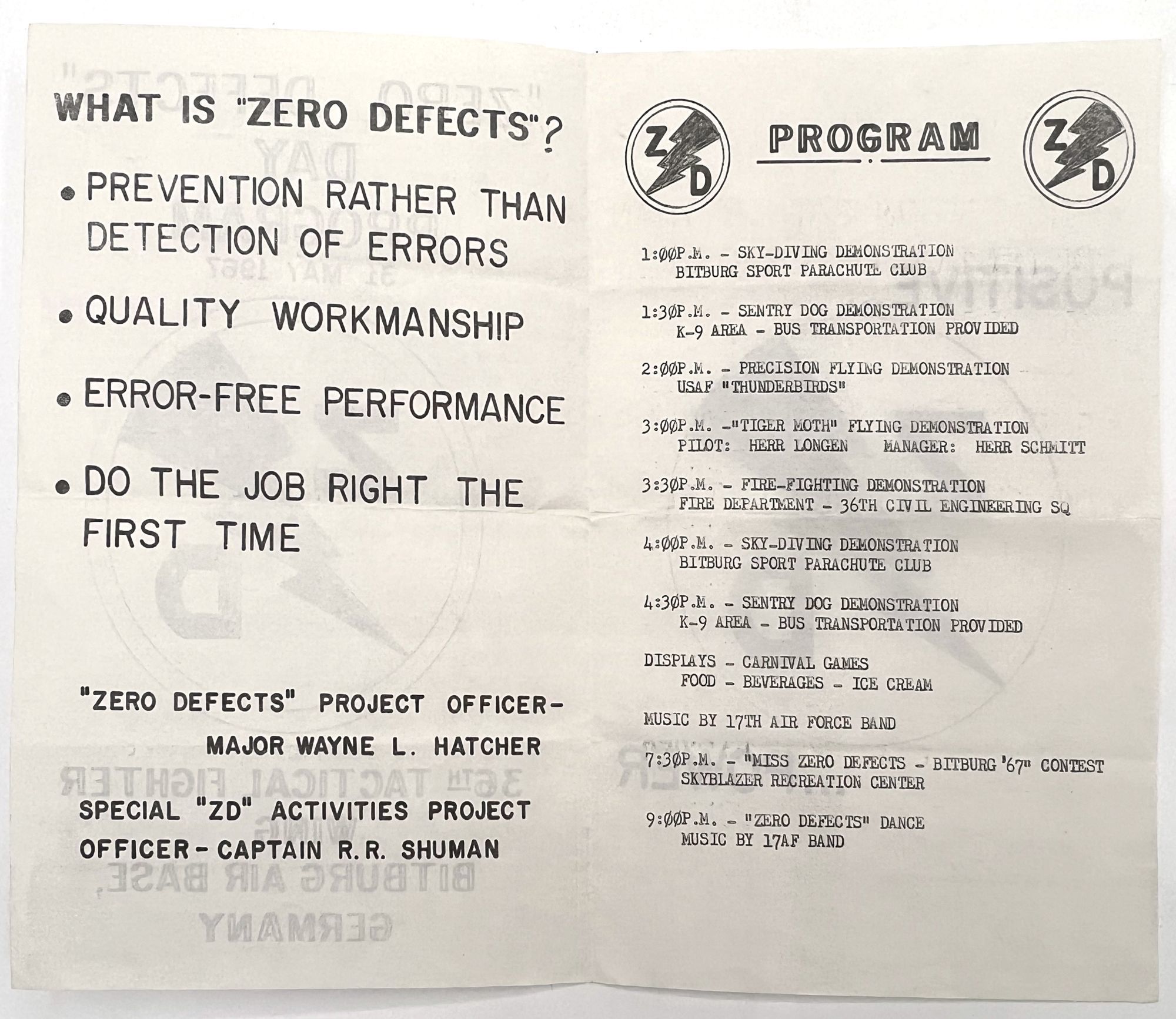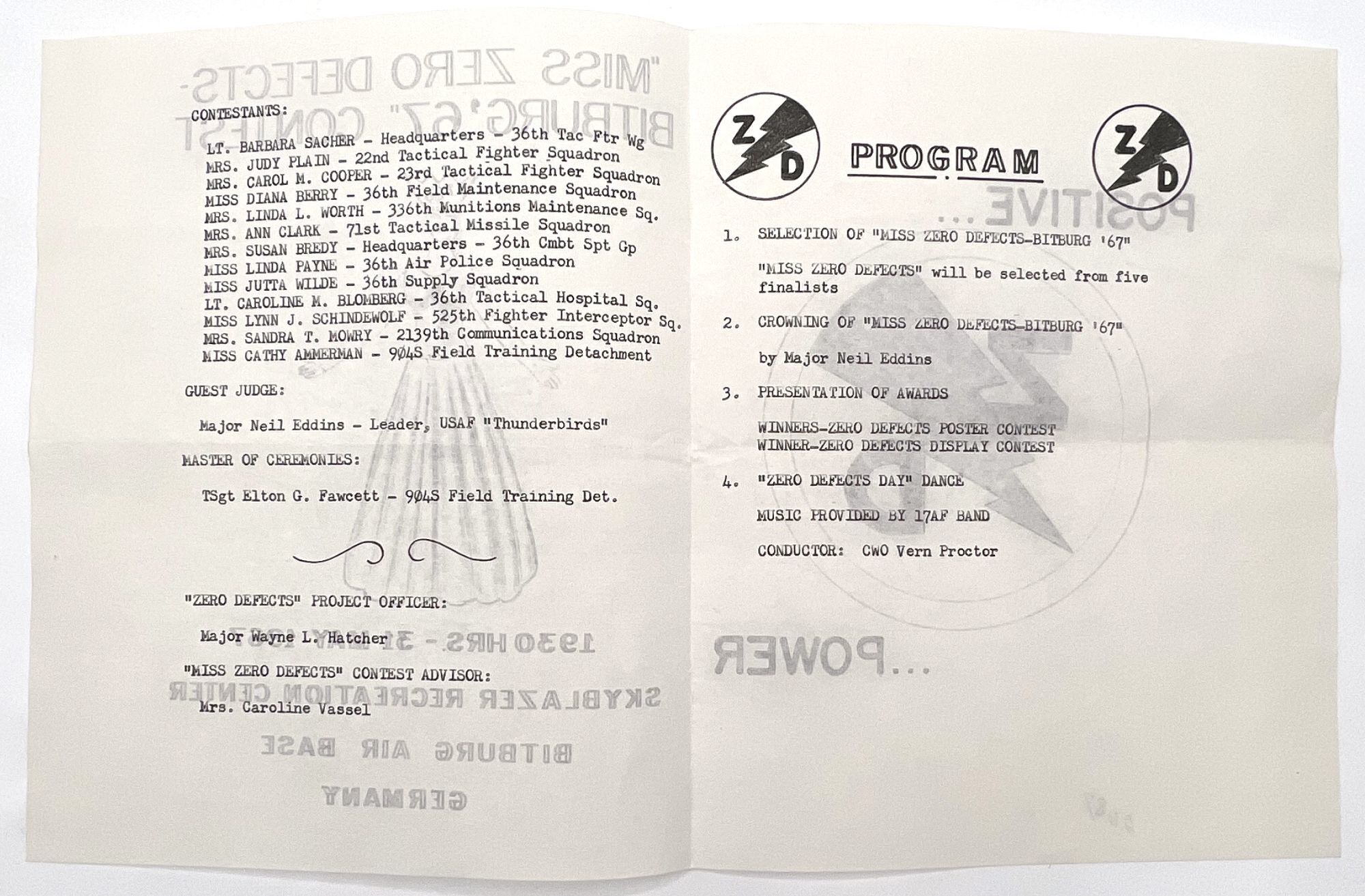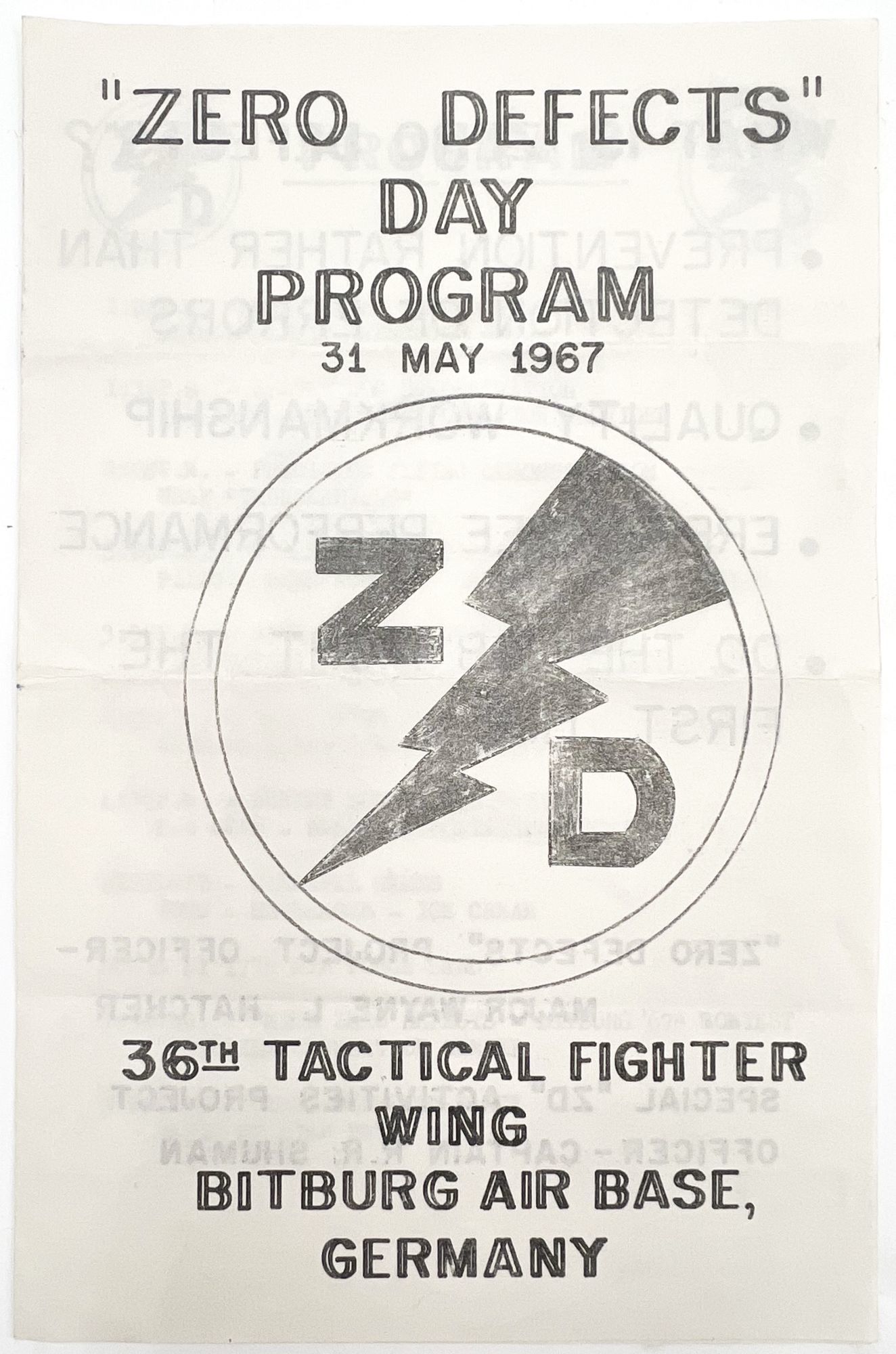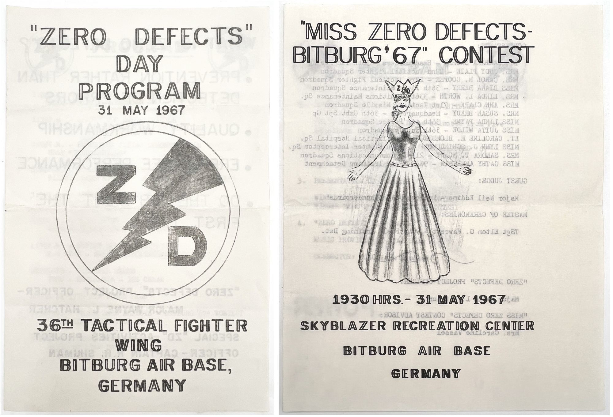 Bitburg Air Base, Germany, 1967. Very good. Letter folds.. Two (2) printed programs for the 1967 "Zero Defects" day program held on 31 May 1967 by the 36th Tactical Fighter Wing at Bitburg Air Base in Germany. "Zero Defects" was a quality assurance program set in motion by the U.S. Department of Defense that encouraged "Prevention rather than detection of errors"; "Quality workmanship"; "Error-free performance"; and doing the job "right the first time". The first printed program includes these values as well as a listing of events including a skydiving demonstration, carnival games, and a dance in the evening. The second is a program for what was surely the highlight of the day, the beauty contest with thirteen women vying for the role of "Miss Zero Defects". Includes the order of events and the name and role of each woman in the USAF. Notice the hand-drawn image on the front of each. Printed bifoliums measuring 8" by 5.25" and 8" by 6.5