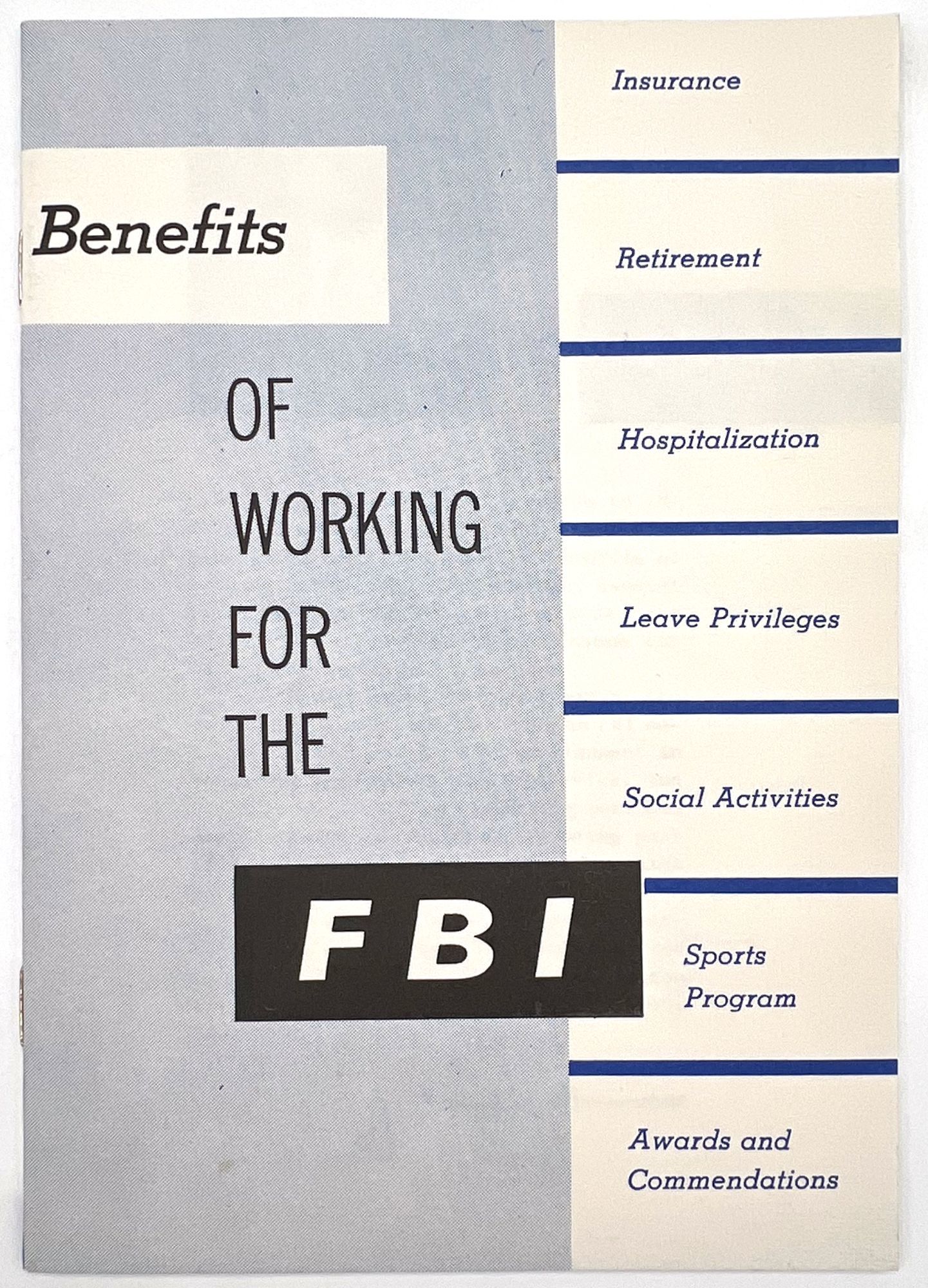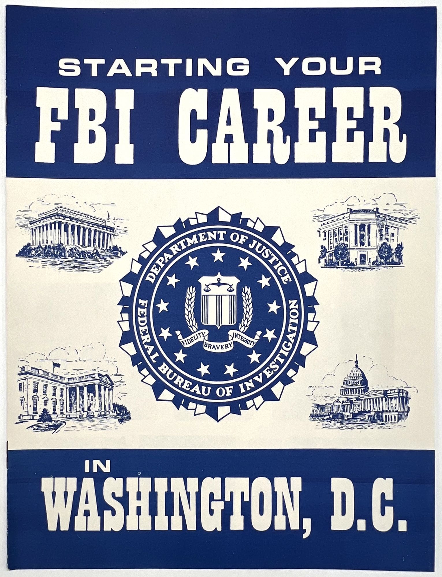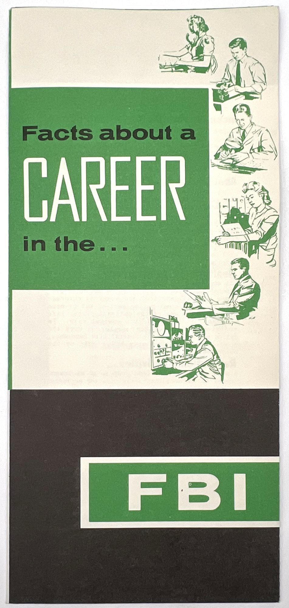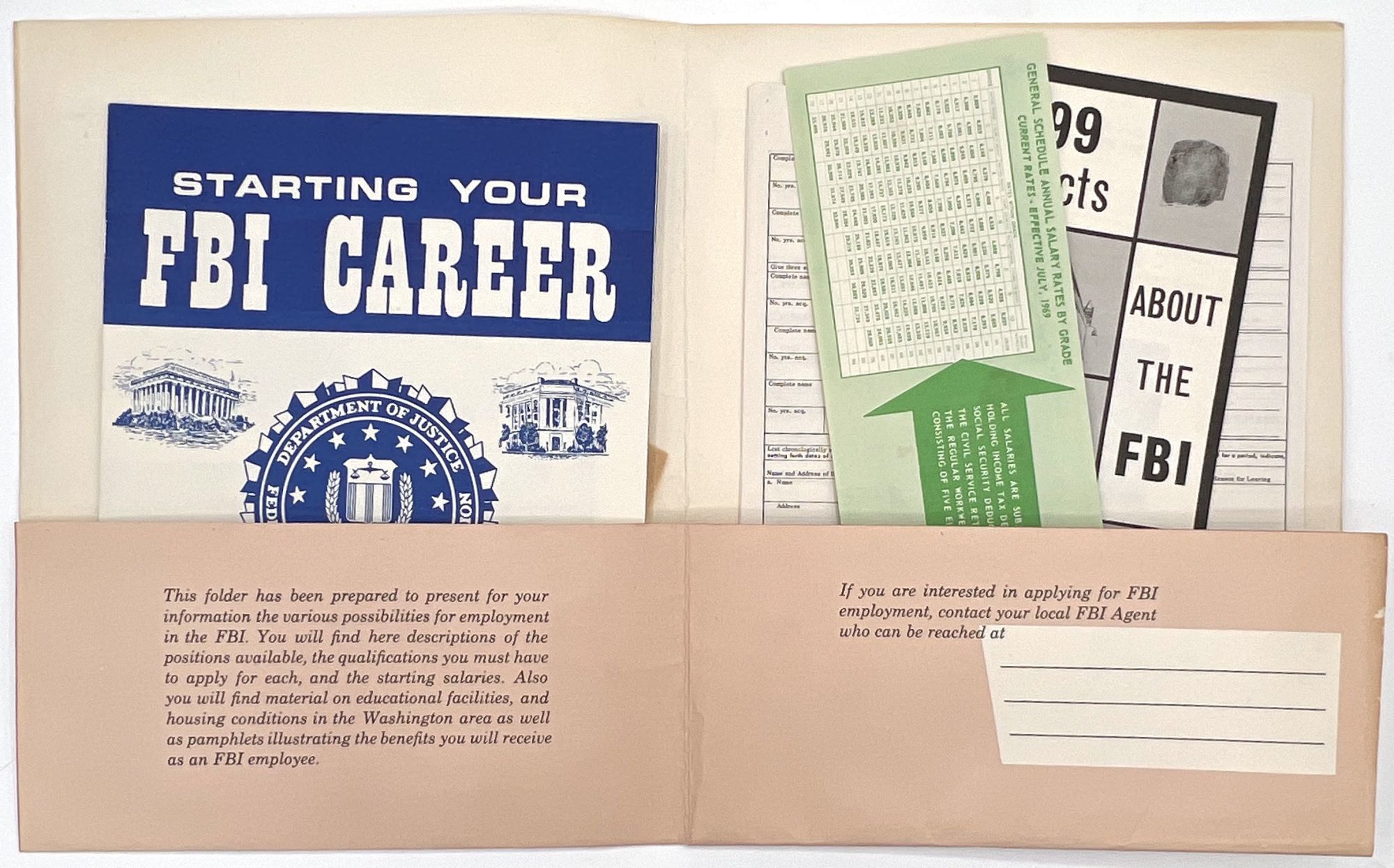 Washington, D.C.: Federal Bureau of Investigation, 1960. Very good.. Two (2) folders of ephemera from the 1960s, published by the Federal Bureau of Investigation as a part of its recruitment program. Provides fascinating (and often entertaining) insight into how the FBI courted and recruited talented young people between c.1960 and 1969. Includes different job opportunities (including for women), benefits and earnings information, and requirements for employment (including education, physical, and more). All of the content is, of course, under the specter of J. Edgar Hoover, given the time period, which is interesting in itself. The contents of each folder are as follows: