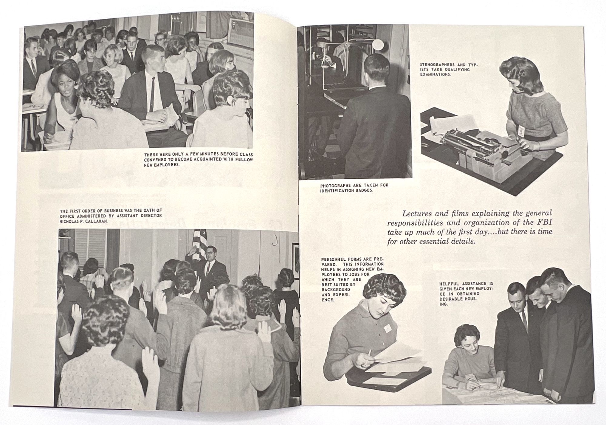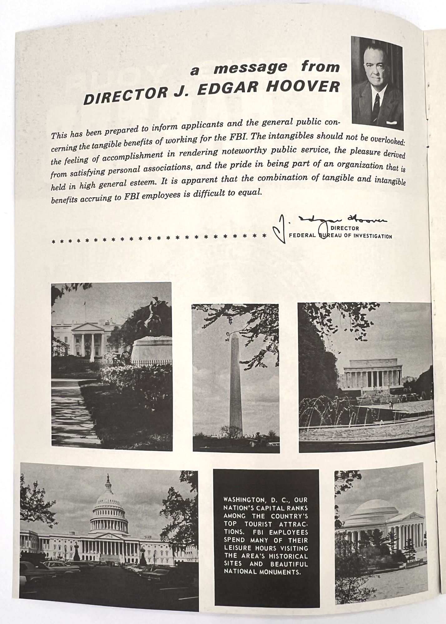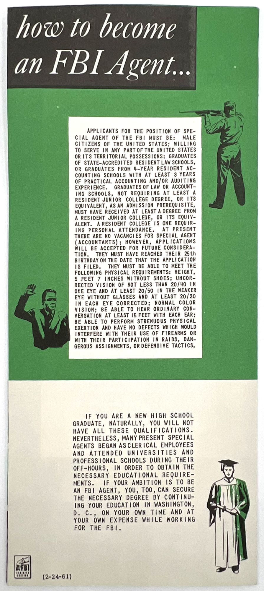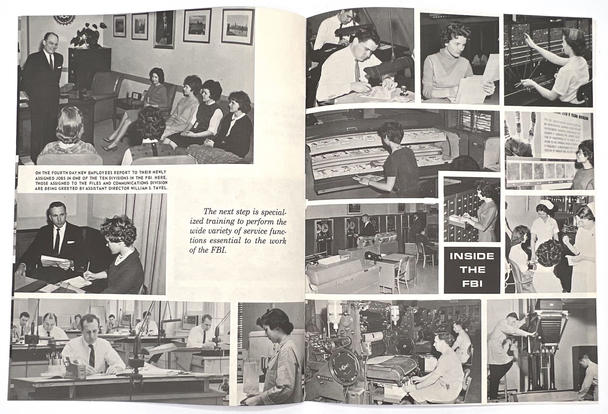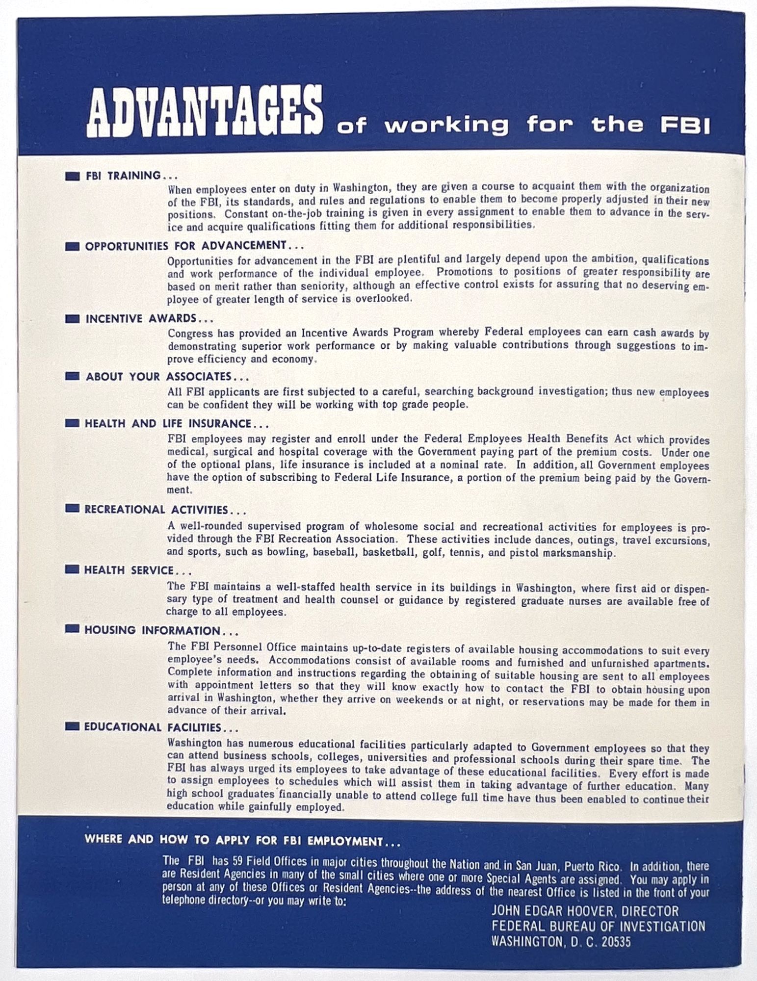 Washington, D.C.: Federal Bureau of Investigation, 1960. Very good.. Two (2) folders of ephemera from the 1960s, published by the Federal Bureau of Investigation as a part of its recruitment program. Provides fascinating (and often entertaining) insight into how the FBI courted and recruited talented young people between c.1960 and 1969. Includes different job opportunities (including for women), benefits and earnings information, and requirements for employment (including education, physical, and more). All of the content is, of course, under the specter of J. Edgar Hoover, given the time period, which is interesting in itself. The contents of each folder are as follows: