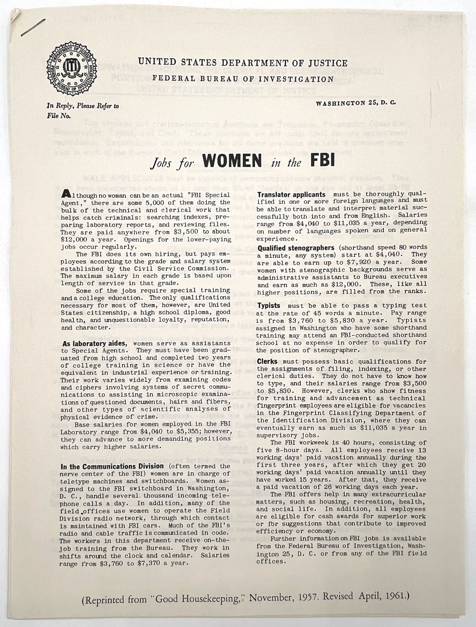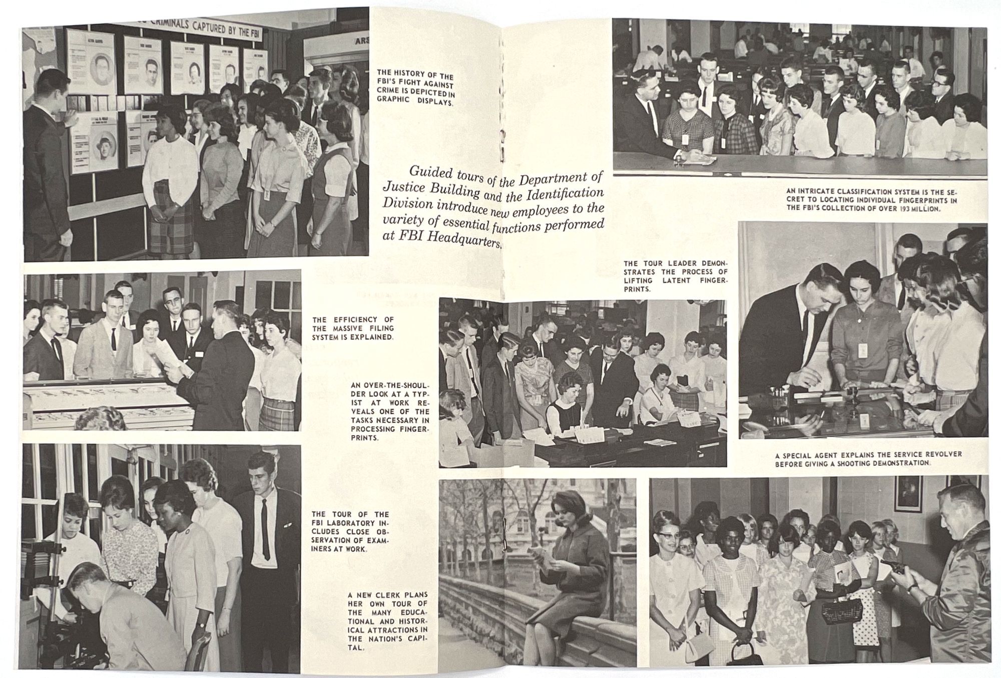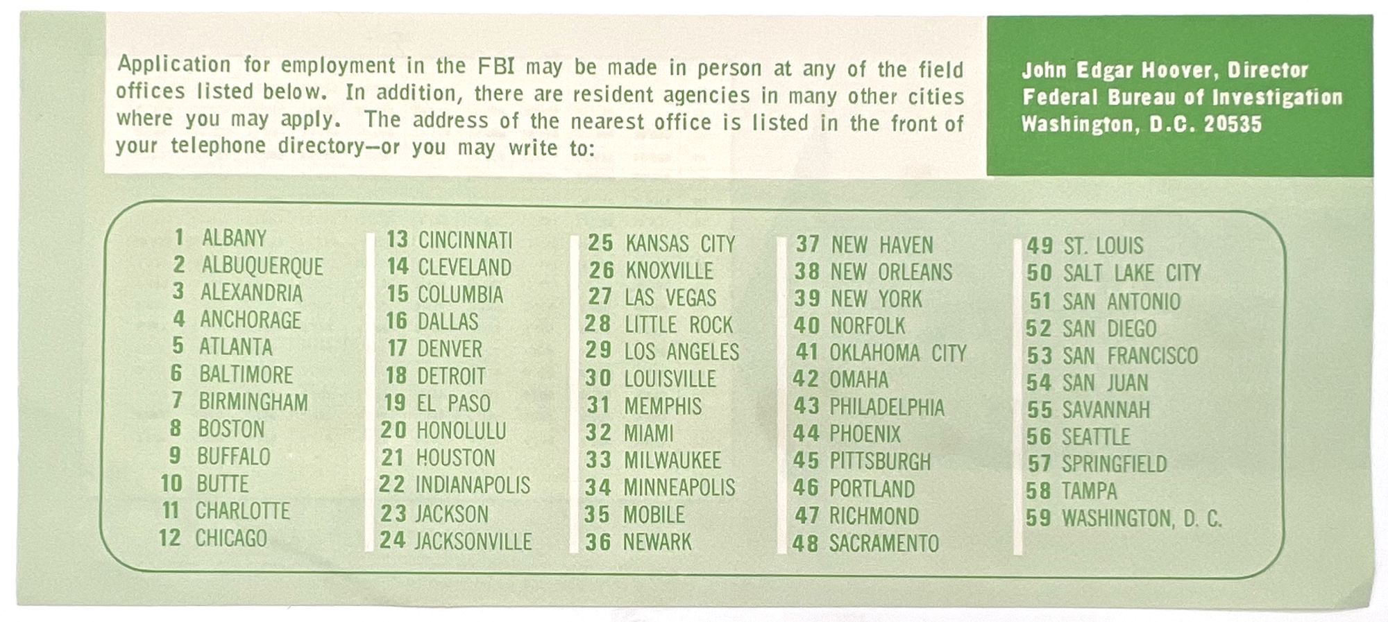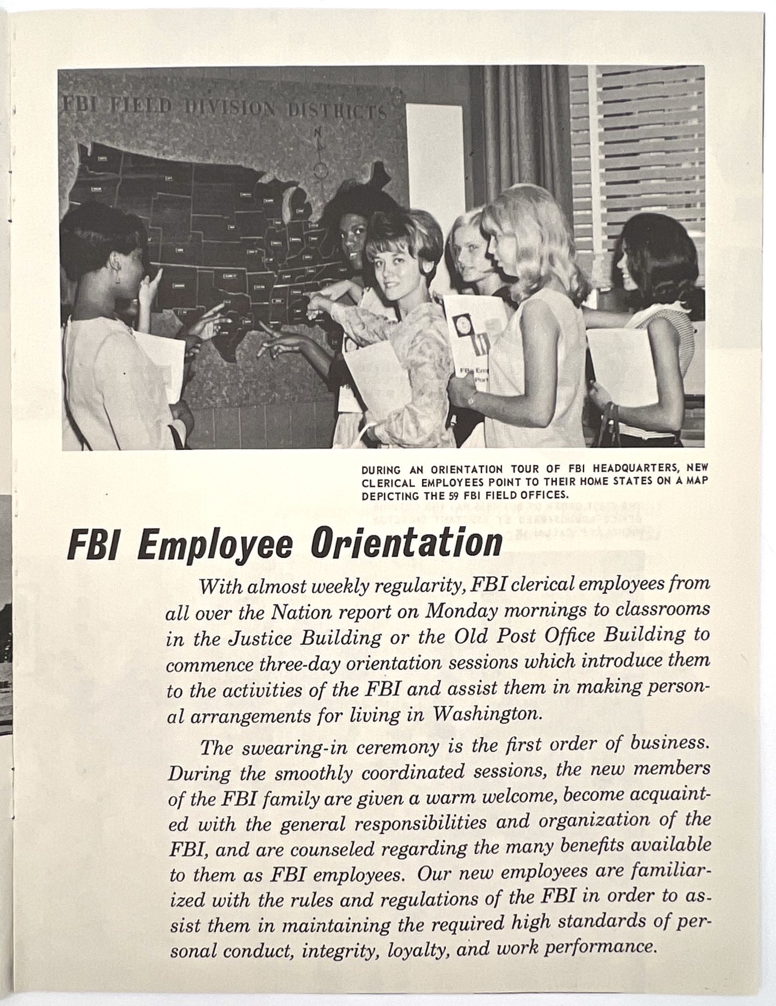 Washington, D.C.: Federal Bureau of Investigation, 1960. Very good.. Two (2) folders of ephemera from the 1960s, published by the Federal Bureau of Investigation as a part of its recruitment program. Provides fascinating (and often entertaining) insight into how the FBI courted and recruited talented young people between c.1960 and 1969. Includes different job opportunities (including for women), benefits and earnings information, and requirements for employment (including education, physical, and more). All of the content is, of course, under the specter of J. Edgar Hoover, given the time period, which is interesting in itself. The contents of each folder are as follows: