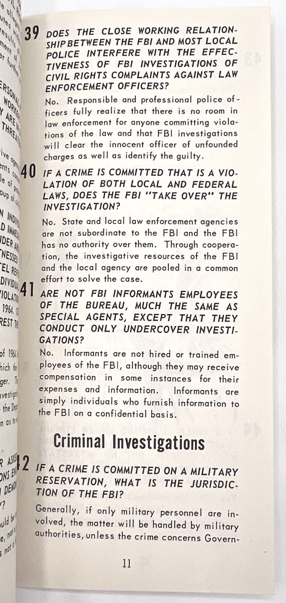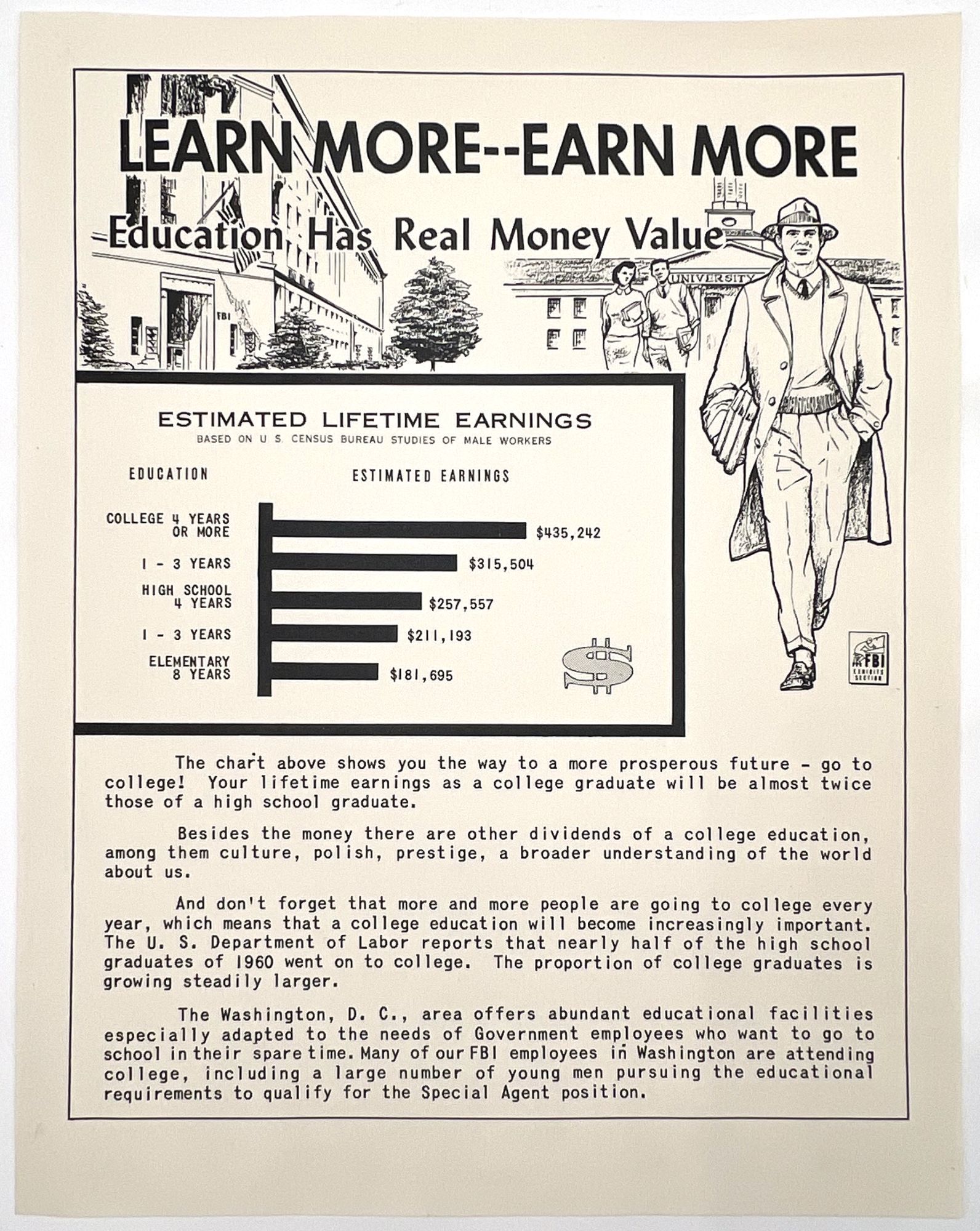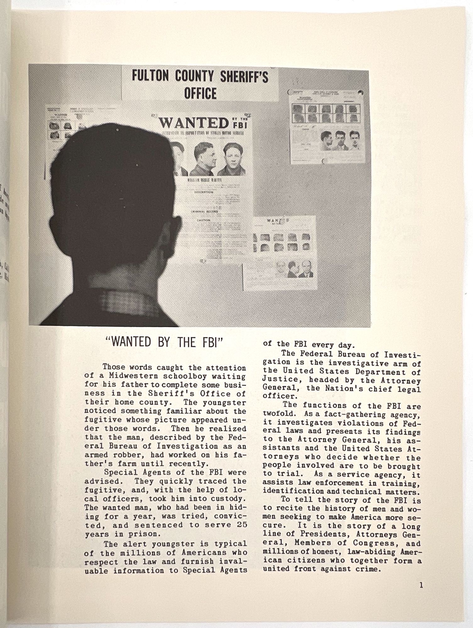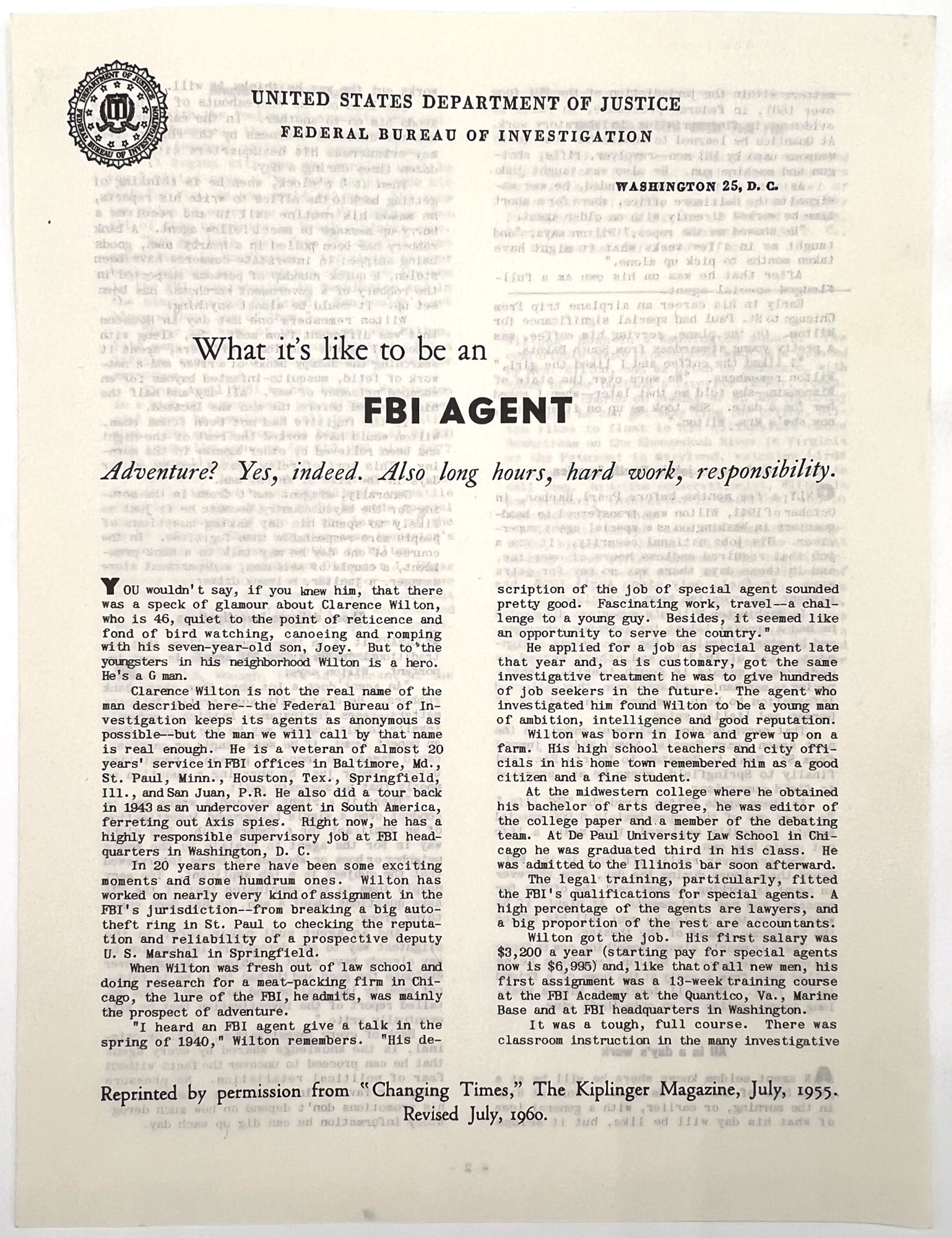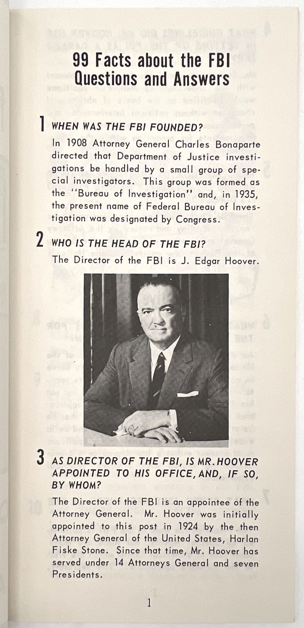 Washington, D.C.: Federal Bureau of Investigation, 1960. Very good.. Two (2) folders of ephemera from the 1960s, published by the Federal Bureau of Investigation as a part of its recruitment program. Provides fascinating (and often entertaining) insight into how the FBI courted and recruited talented young people between c.1960 and 1969. Includes different job opportunities (including for women), benefits and earnings information, and requirements for employment (including education, physical, and more). All of the content is, of course, under the specter of J. Edgar Hoover, given the time period, which is interesting in itself. The contents of each folder are as follows: