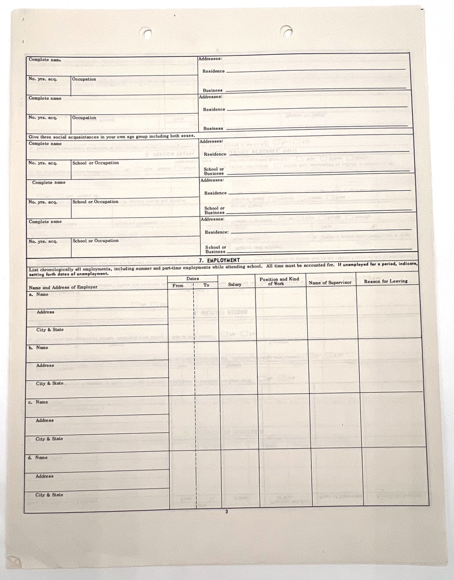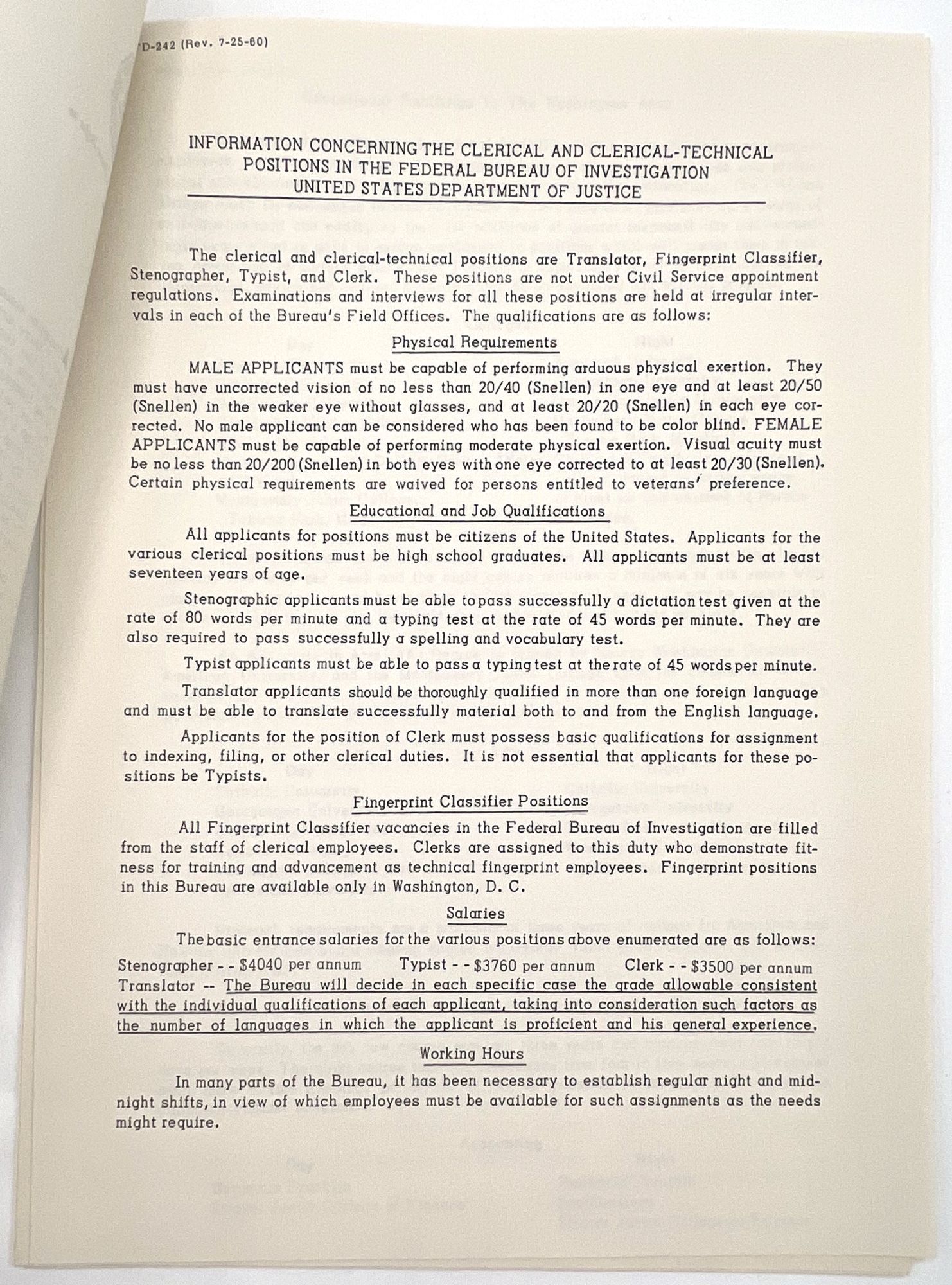 The second folder measures approx. 11.5" by 9.25", and features an illustration of the FBI building on the front with the title "FBI Career Opportunities". It contains a total of four (4) items ranging in size from small hand flyer (3.75" by 8.25") to large printed job application (10.5" by 8"). The items are: small hand flyer with a chart of salaries according to grade and length with the Bureau; "99 Facts About the FBI Questions and Answers"; "Starting Your FBI Career in Washington, D.C."; and a blank, partial job application to the bureau lacking first leaf (remaining sections include past employment, military record, foreign travel, credit and court records, organization memberships, and a detailed list of relatives' names, addresses, and birth dates. Note the gender roles and physical requirements at play. As might be expected, applicants for the role of FBI Agent must be male, taller than 5 ft. 7 in., with no physical disabilities. Jobs for women advertised seem largely limited to typists, stenographers, clerks, translators, laboratory aides, and switchboard operators.