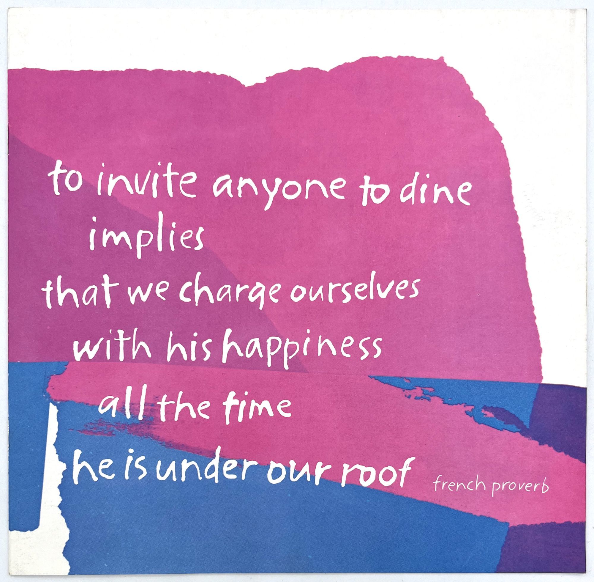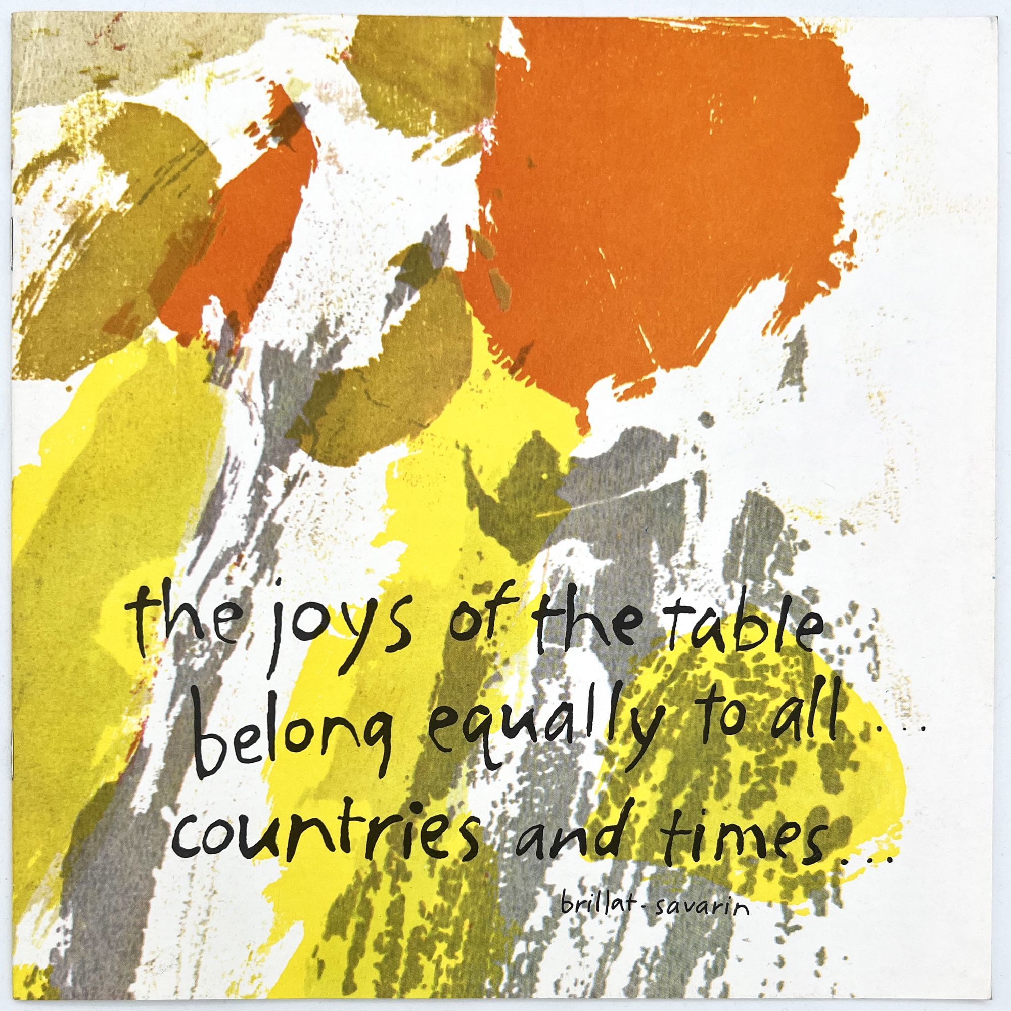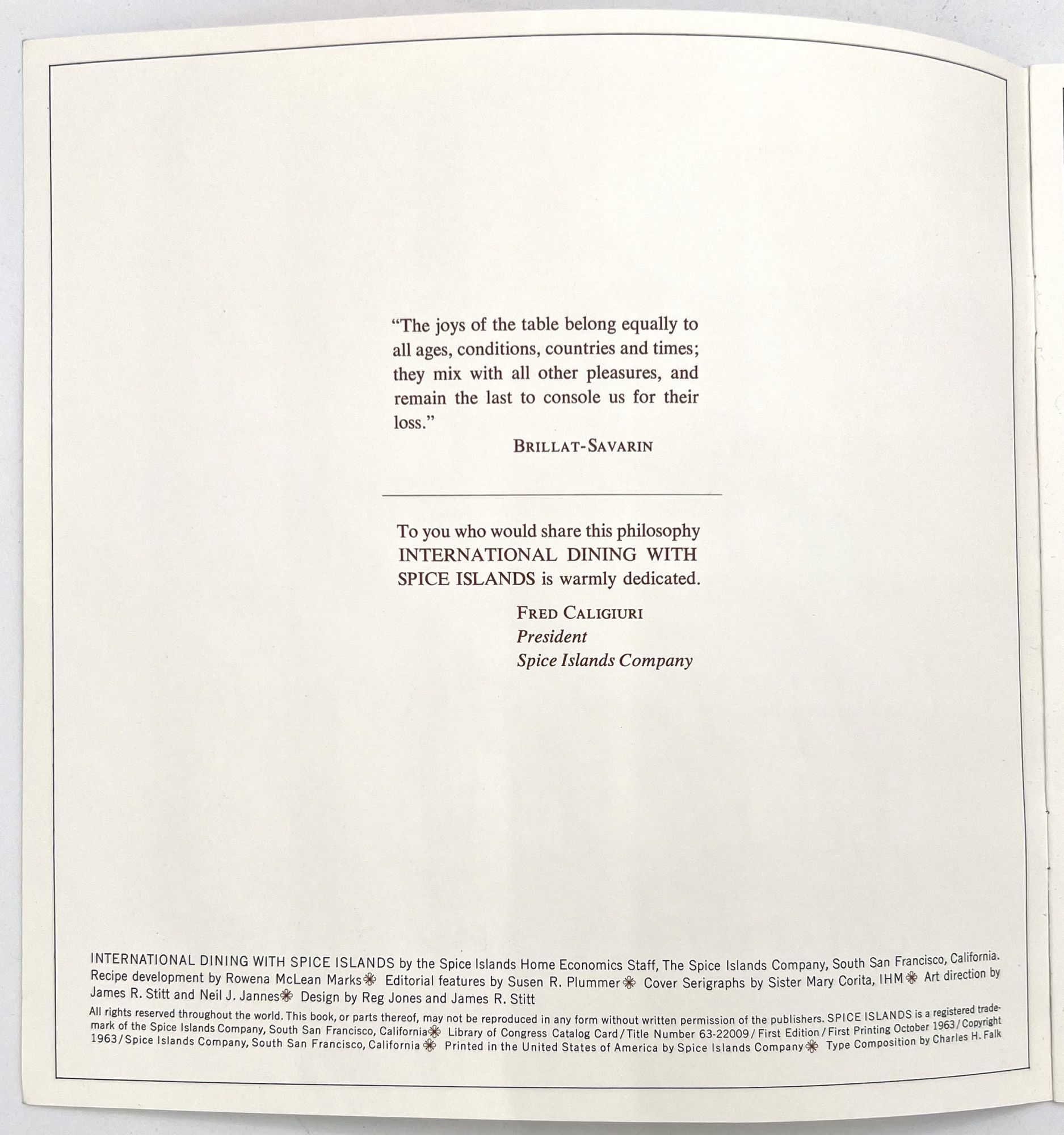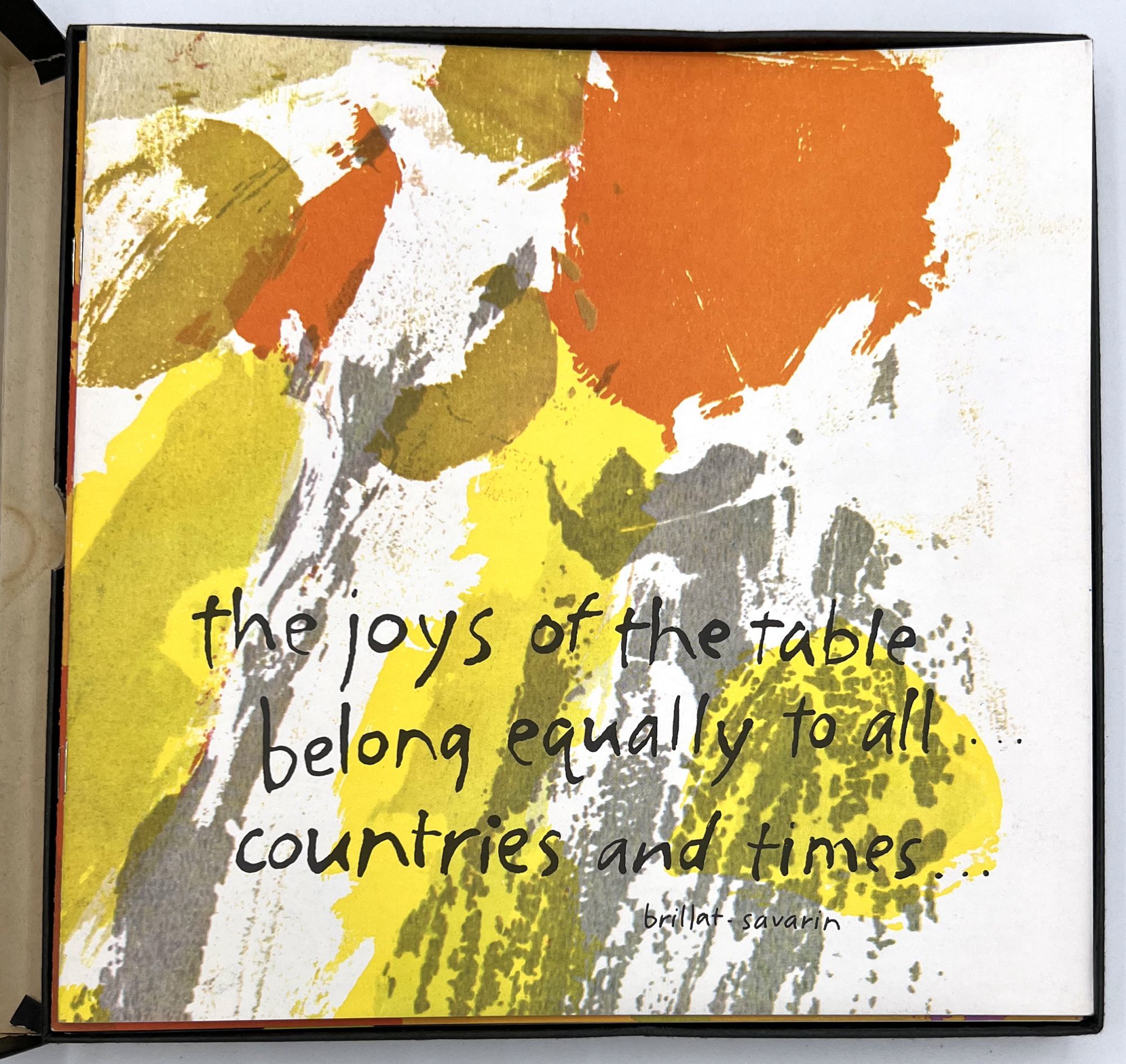 San Francisco, California: Spice Islands Company, 1963. Very good to near-fine. Light wear to extremities.. First edition, first printing. A complete example of the 1963 art book produced by Sister Mary Corita in partnership with Spice Islands brand spices, highlighting the universality of food and community across world cultures. It is comprised of ten (10) stapled booklets, including an introductory booklet. The introductory booklet provides a brief summary of the art of dining in layman's terms, and advice for forming an international dining club. It also includes a list of grocery sources for international foods by state. The nine (9) remaining booklets each focus on a different world cuisine. The countries represented are: France; India; Japan; Germany; Italy; Spain; Greece; Israel; and Sweden. Each cover has a local proverb about food (e.g. India's reads, "If you would be a king, you must eat like a king"). Each booklet begins with a brief history of the country's cuisine, and then offers recipes and sample menus from different regions within the country, or for different purposes. For example, Japan's three menus include Family Food ("Katei Ryori"), Party Food ("Kaiseki Ryori"), and food for a Ceremonial Dinner. Each stapled booklet 9" by 9" is approx. 8-10 pages in length in original illus. wrps. Housed in the original black paper-colored box measuring 9.25" by 9.25" by 0.75" with printed Spice Islands product list inside lower lid. Sister Mary Corita, sometimes Corita Kent (1918-1986), "was an artist with an innovative approach to design and education. By the 1960s, her vibrant serigraphs were drawing international acclaim. Corita's work reflected her concerns about poverty, racism, and war, and her messages of peace and social justice continue to resonate with audiences today" (corita.org).