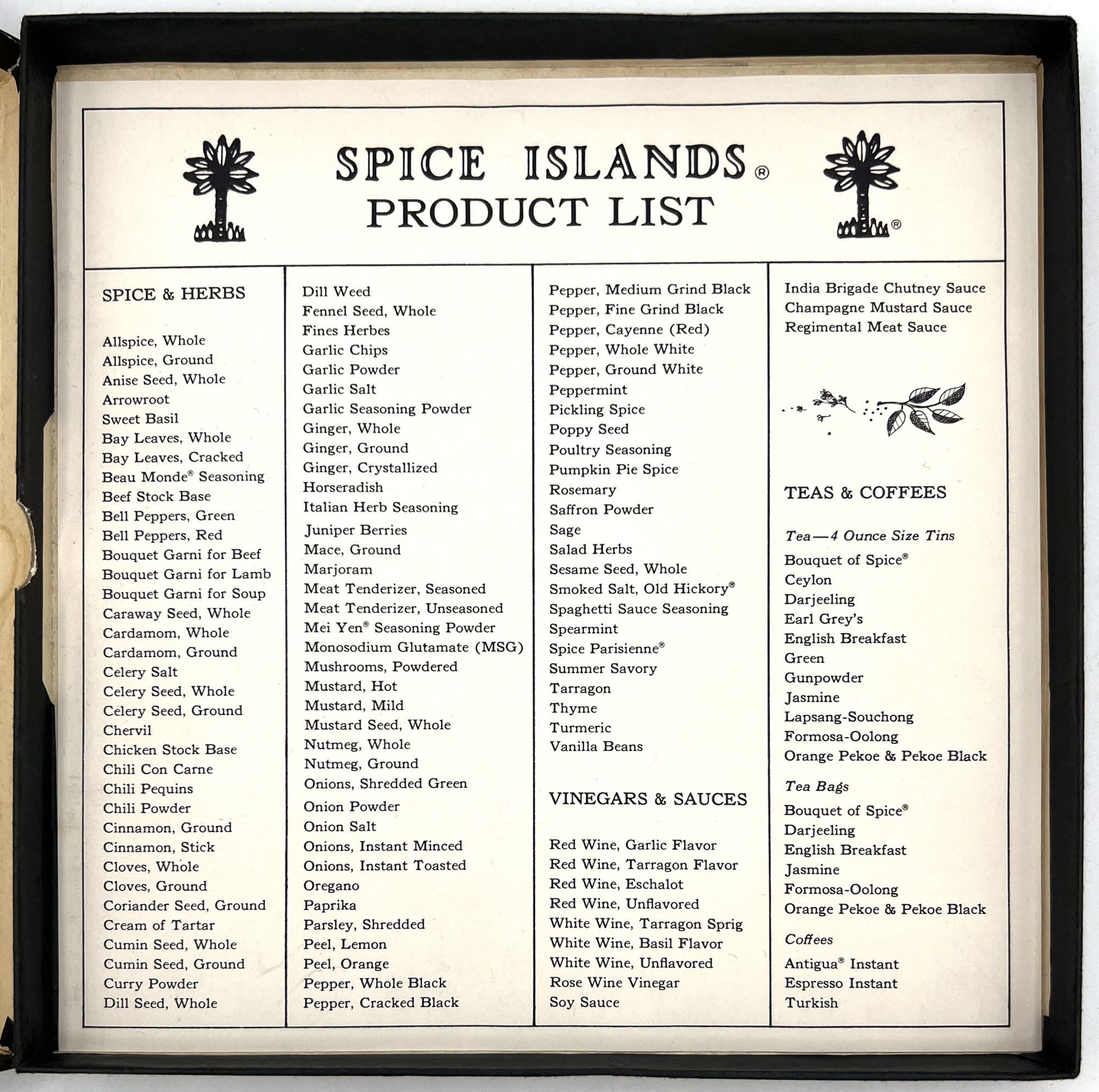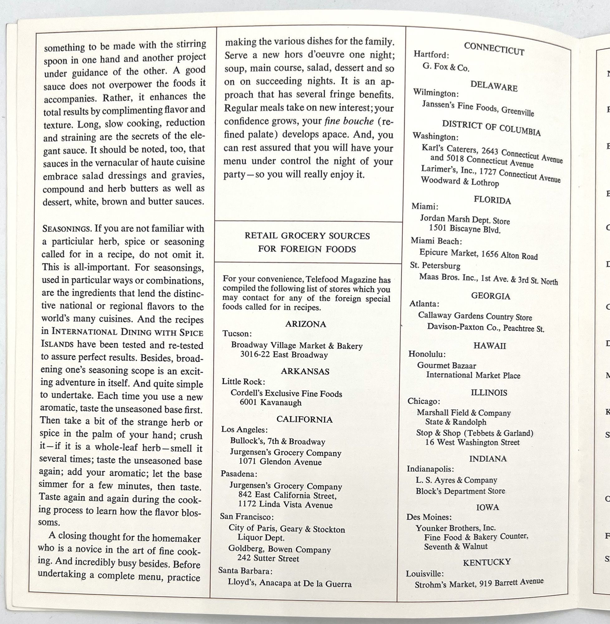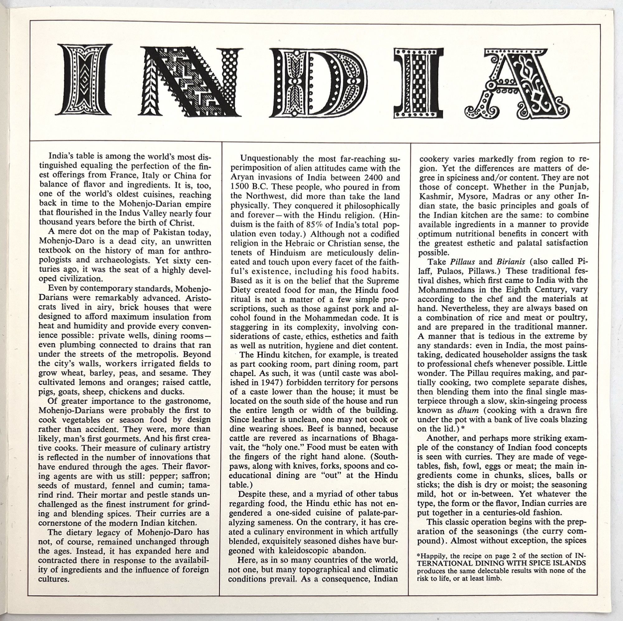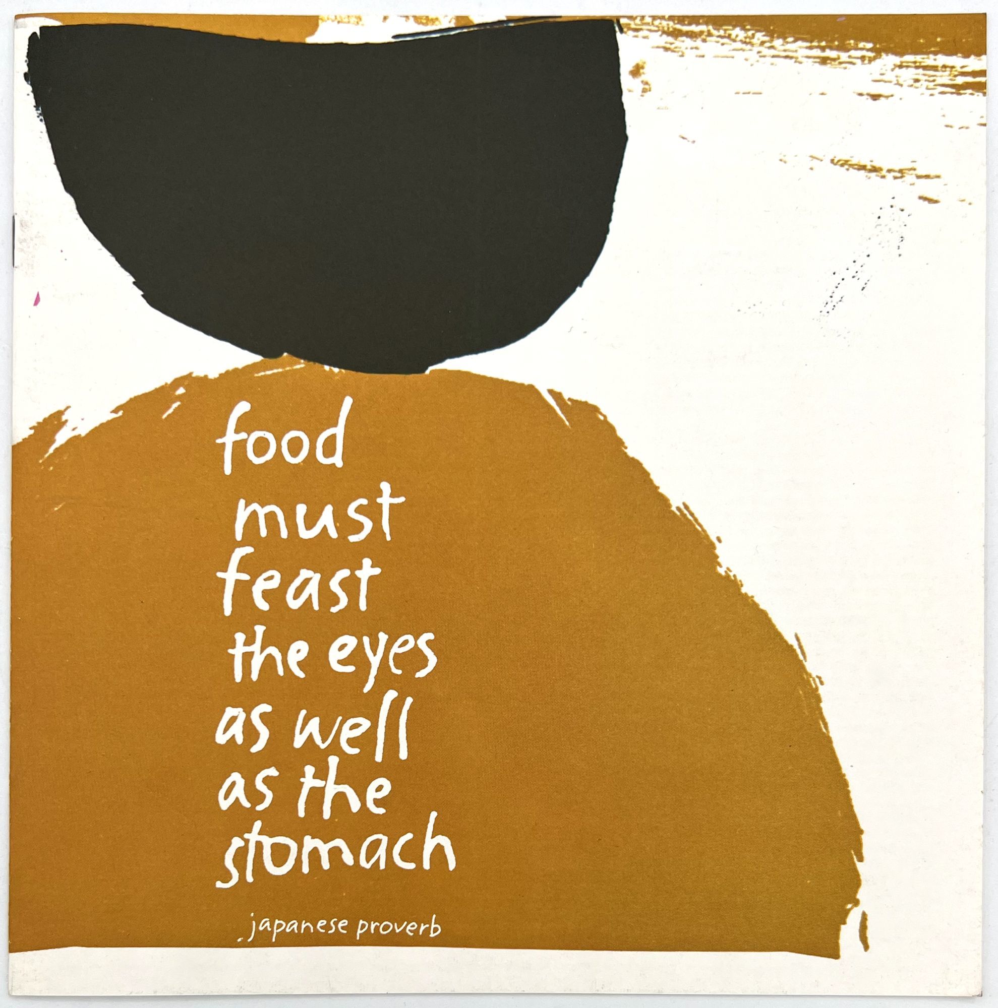 San Francisco, California: Spice Islands Company, 1963. Very good to near-fine. Light wear to extremities.. First edition, first printing. A complete example of the 1963 art book produced by Sister Mary Corita in partnership with Spice Islands brand spices, highlighting the universality of food and community across world cultures. It is comprised of ten (10) stapled booklets, including an introductory booklet. The introductory booklet provides a brief summary of the art of dining in layman's terms, and advice for forming an international dining club. It also includes a list of grocery sources for international foods by state. The nine (9) remaining booklets each focus on a different world cuisine. The countries represented are: France; India; Japan; Germany; Italy; Spain; Greece; Israel; and Sweden. Each cover has a local proverb about food (e.g. India's reads, "If you would be a king, you must eat like a king"). Each booklet begins with a brief history of the country's cuisine, and then offers recipes and sample menus from different regions within the country, or for different purposes. For example, Japan's three menus include Family Food ("Katei Ryori"), Party Food ("Kaiseki Ryori"), and food for a Ceremonial Dinner. Each stapled booklet 9" by 9" is approx. 8-10 pages in length in original illus. wrps. Housed in the original black paper-colored box measuring 9.25" by 9.25" by 0.75" with printed Spice Islands product list inside lower lid. Sister Mary Corita, sometimes Corita Kent (1918-1986), "was an artist with an innovative approach to design and education. By the 1960s, her vibrant serigraphs were drawing international acclaim. Corita's work reflected her concerns about poverty, racism, and war, and her messages of peace and social justice continue to resonate with audiences today" (corita.org).